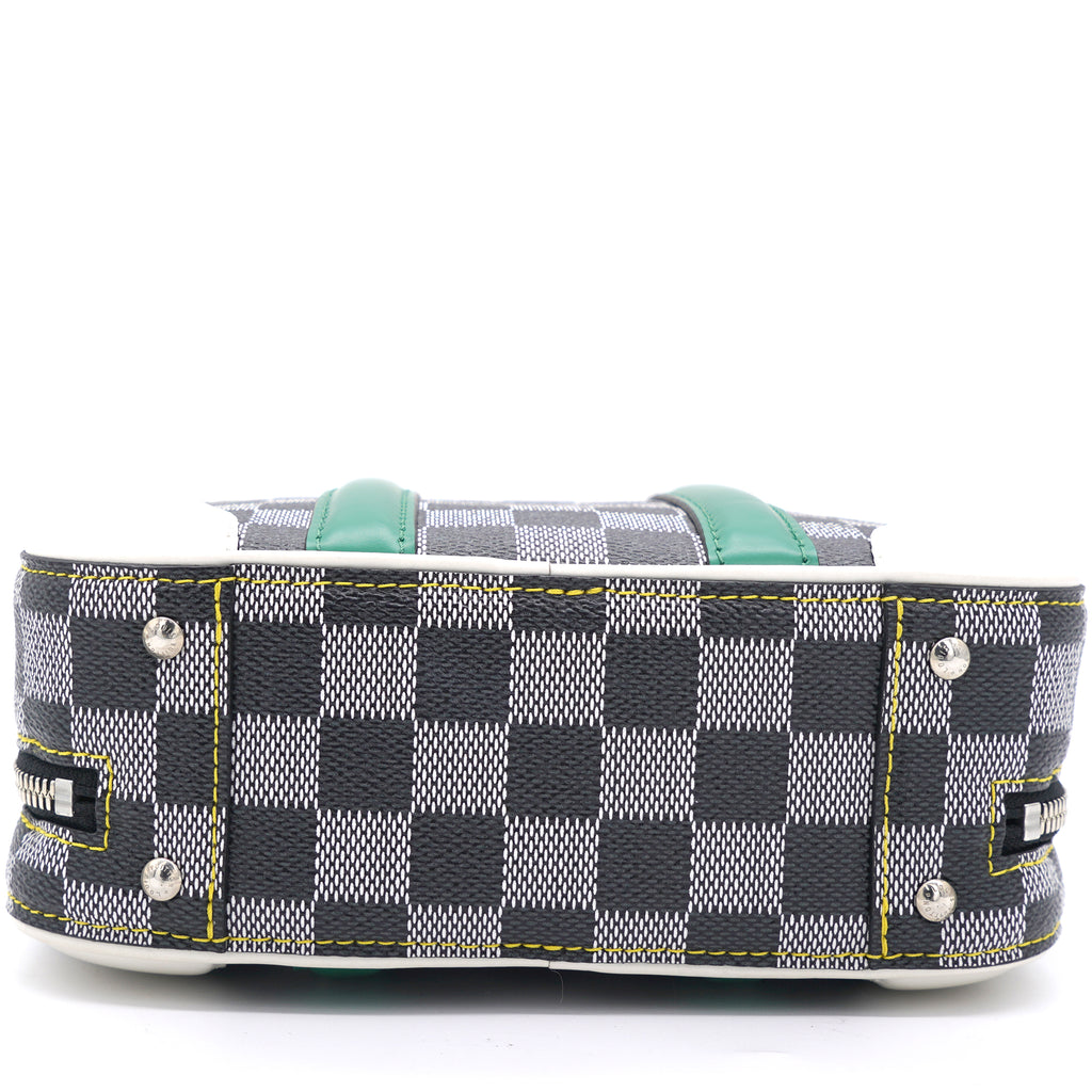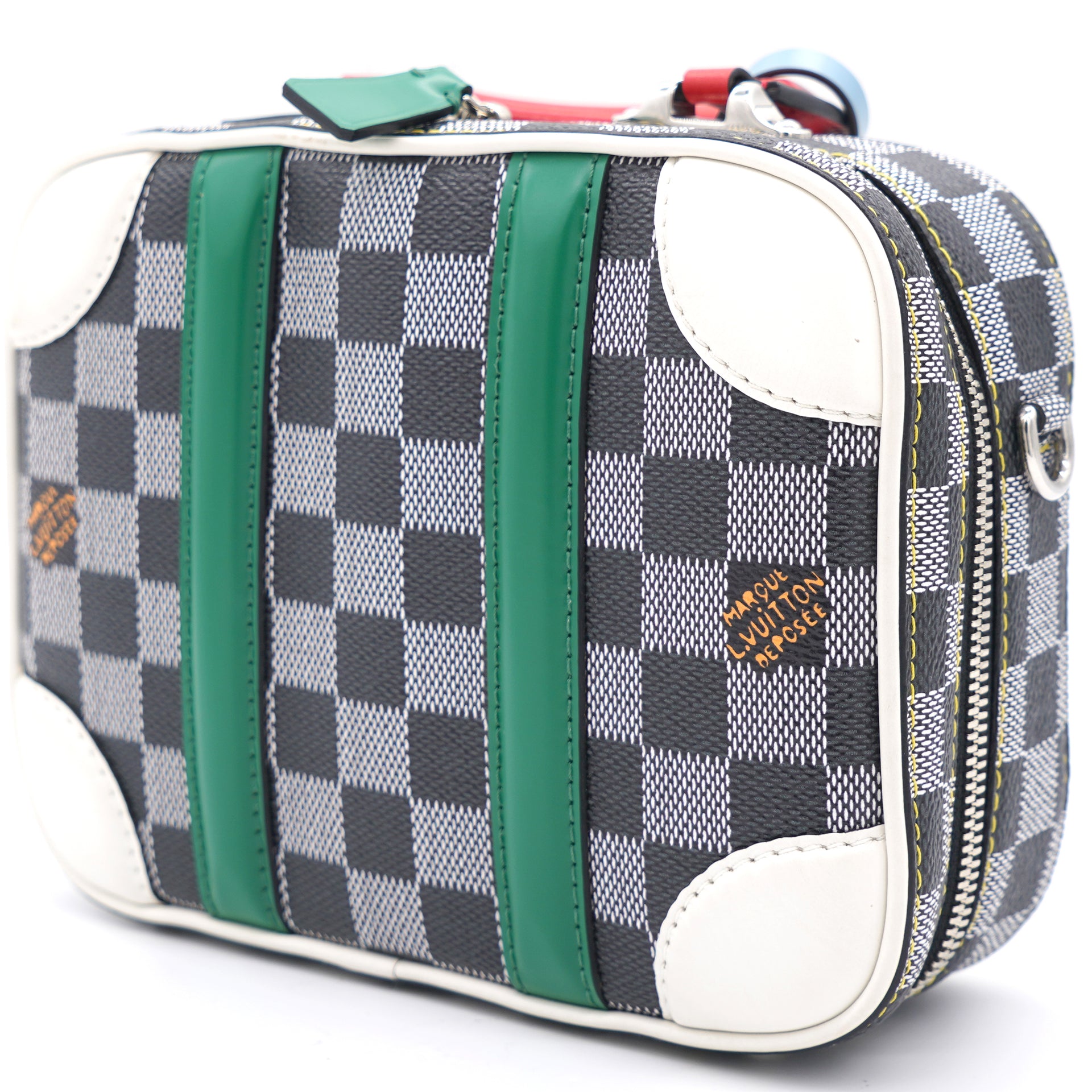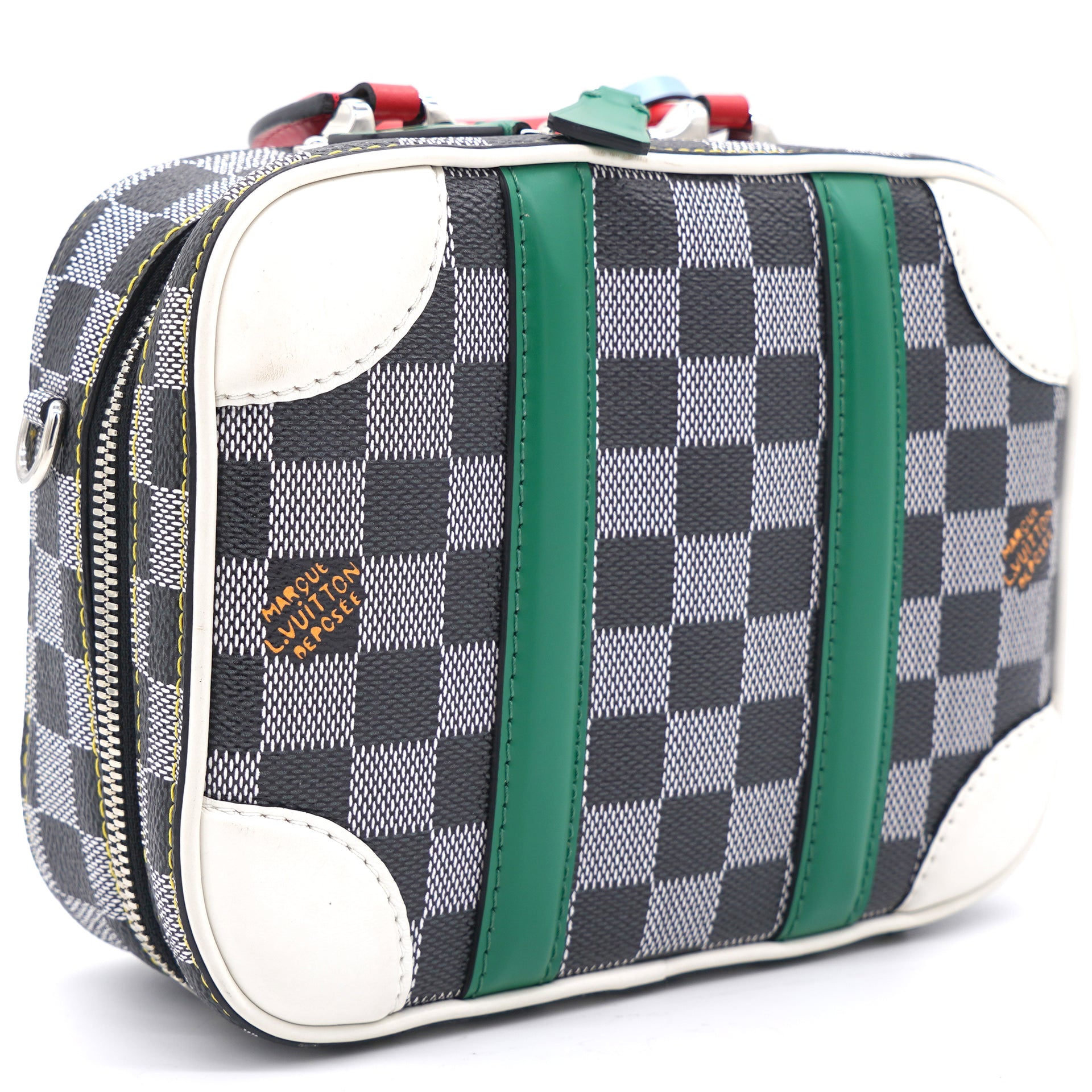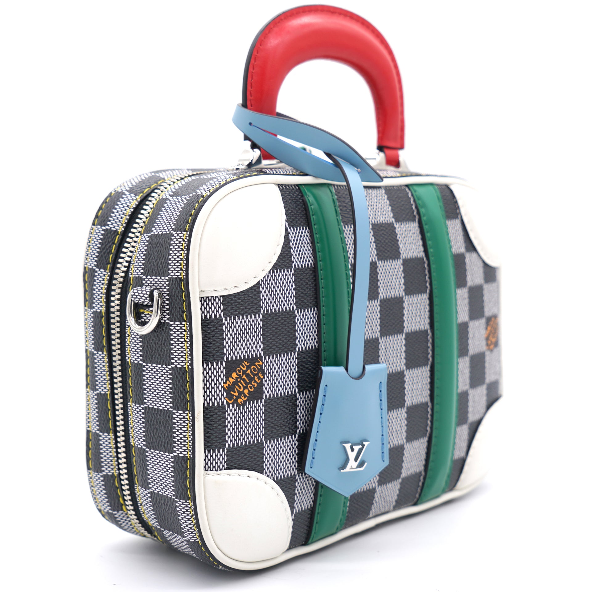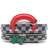 | Nicolas Ghesquière’s new black-and-white reinterpretation of classic Damier canvas is complemented by colorful calf-leather details on this Valisette BB handbag. Inspired by the House’s travel heritage, this structured bag evokes the suitcases created by the House in the middle of the last century. The top handle and removeable strap offer multiple carry options. |
