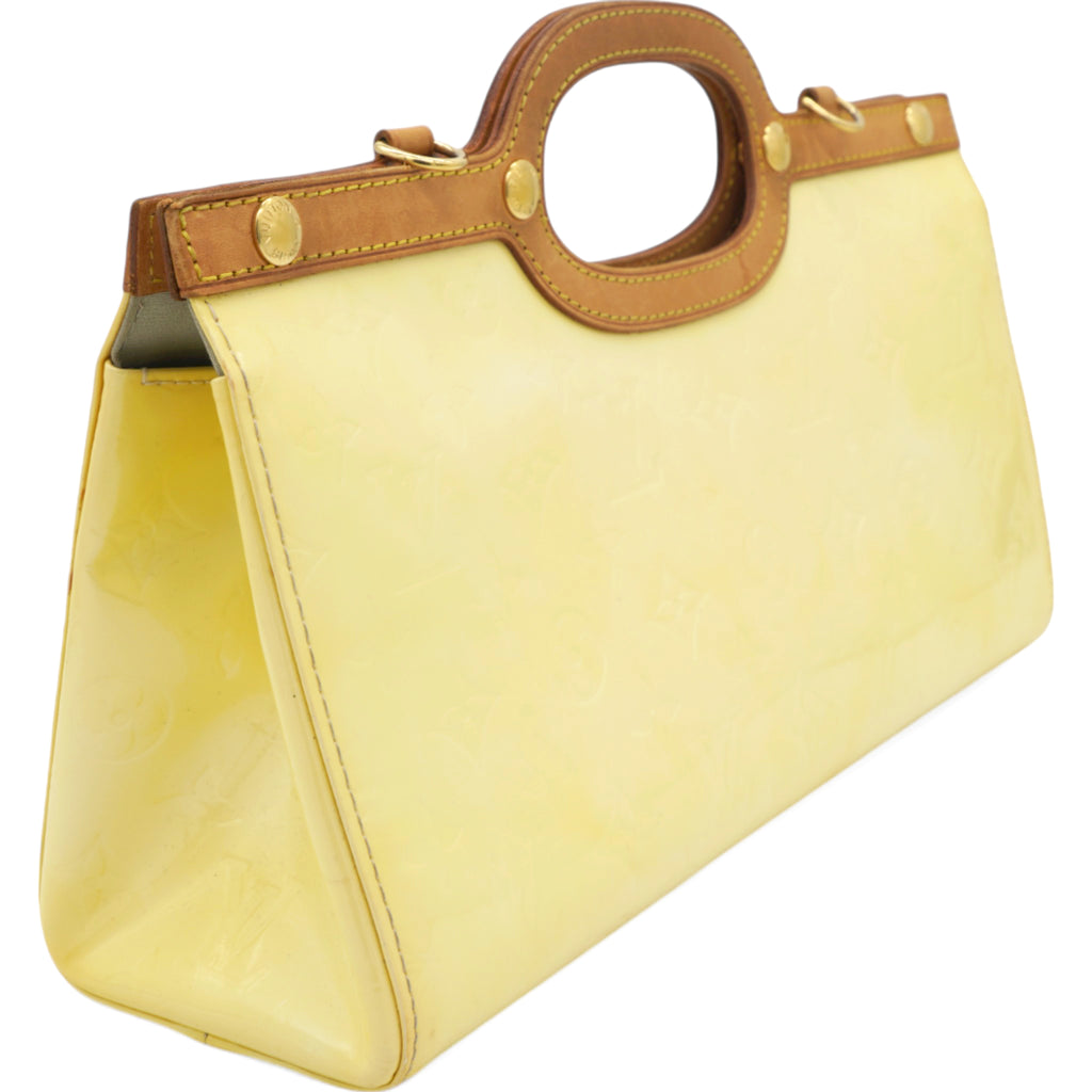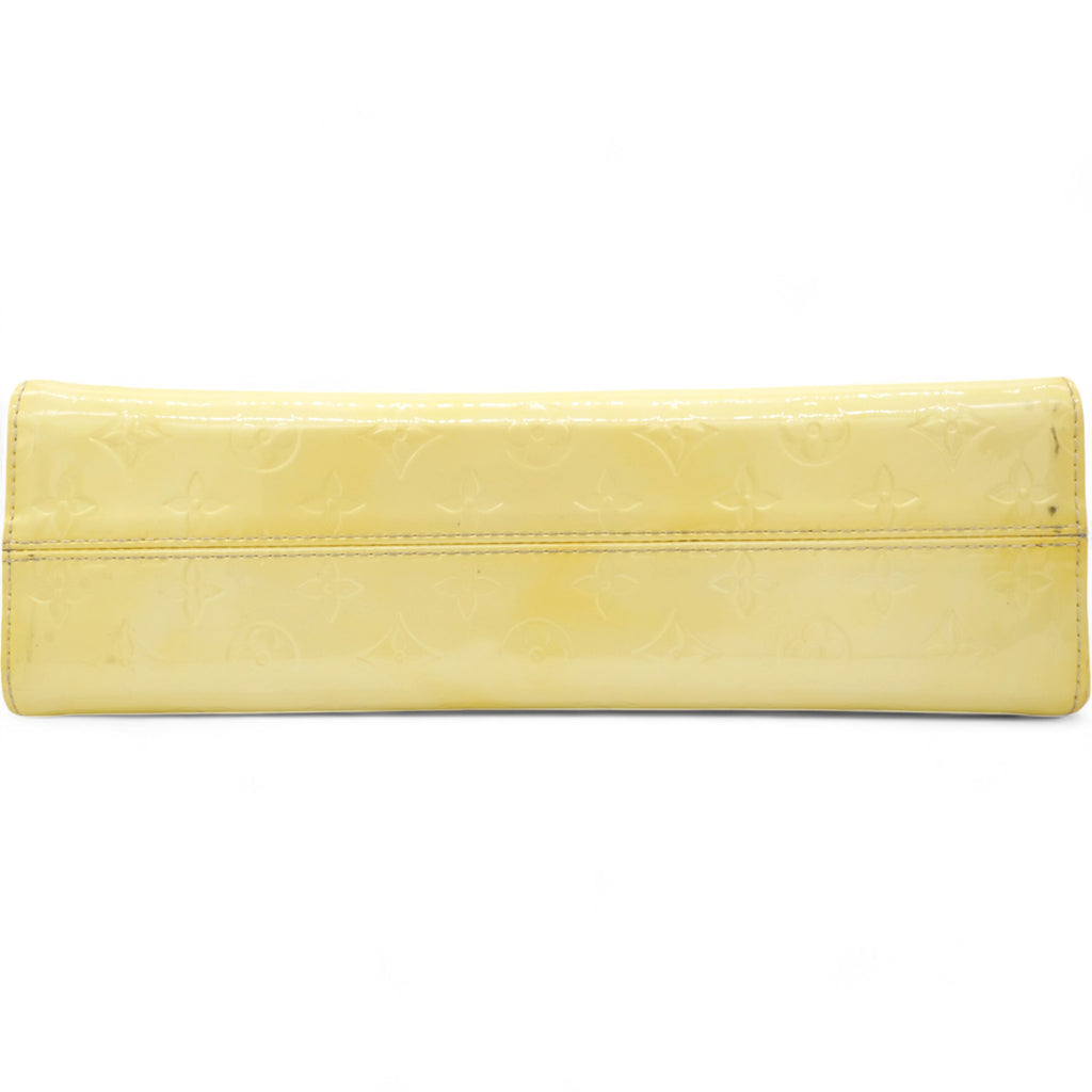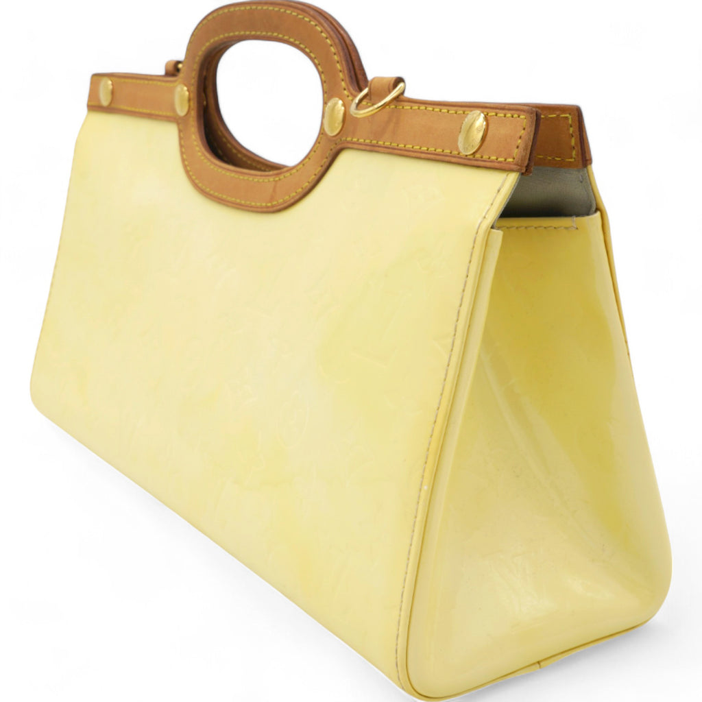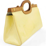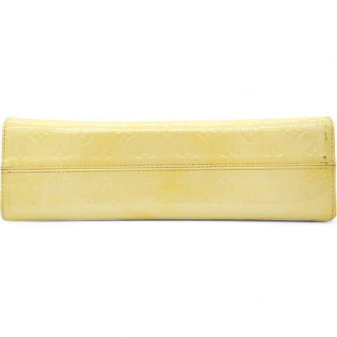 | This chic handbag is crafted of Louis Vuitton monogram embossed vernis patent leather in a lovely cream color. The shoulder bag features a top crest of vachetta cowhide leather with a cutaway handle. The top unsnaps to a grey fabric interior with a pocket. |