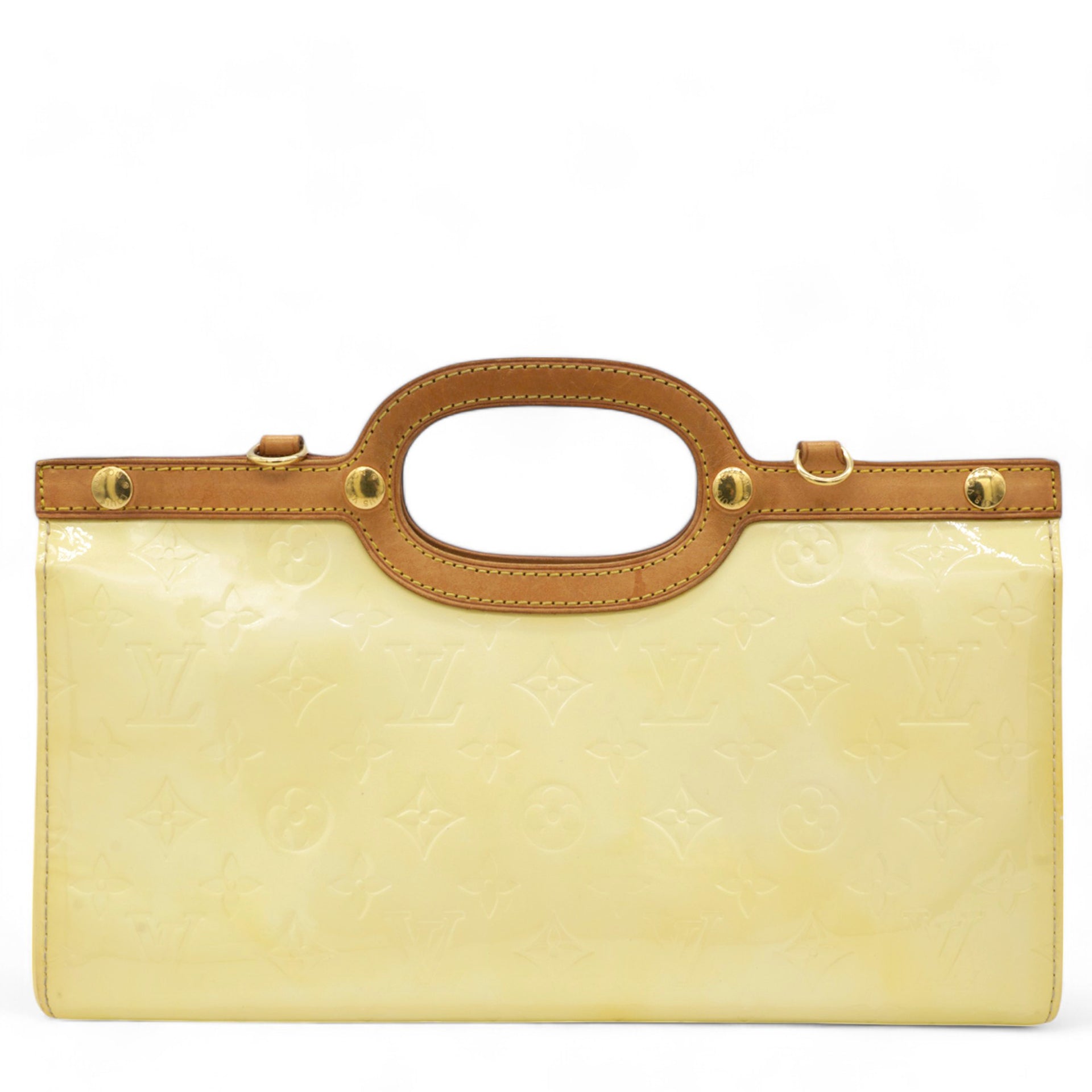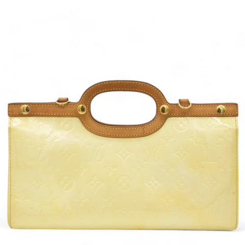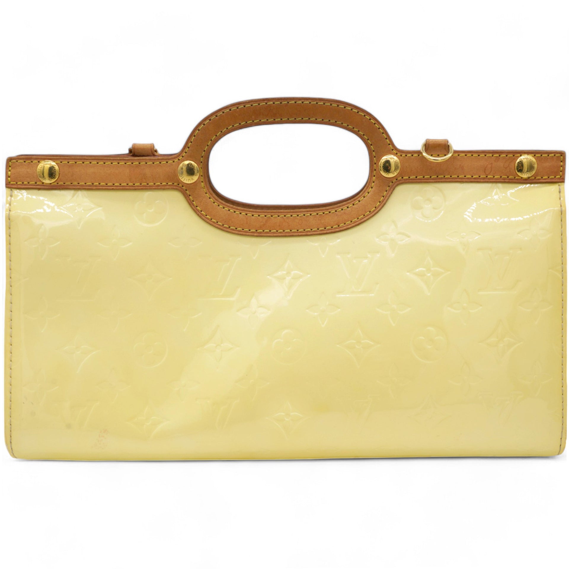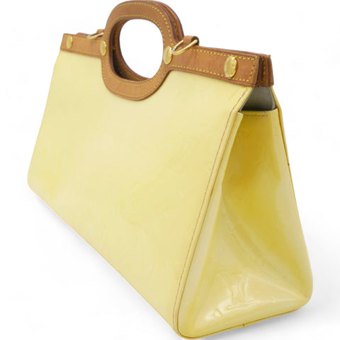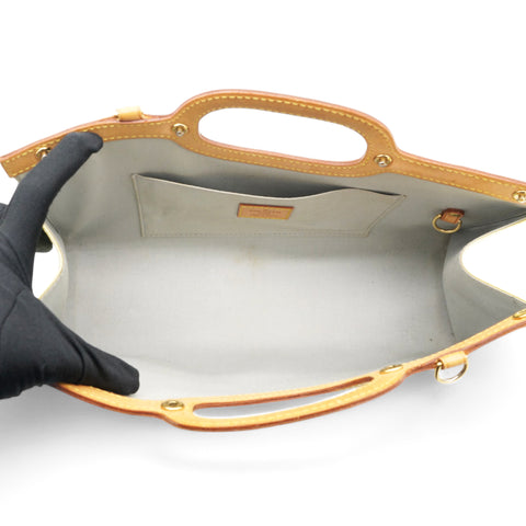 | This chic handbag is crafted of Louis Vuitton monogram embossed vernis patent leather in a lovely cream color. The shoulder bag features a top crest of vachetta cowhide leather with a cutaway handle. The top unsnaps to a grey fabric interior with a pocket. |