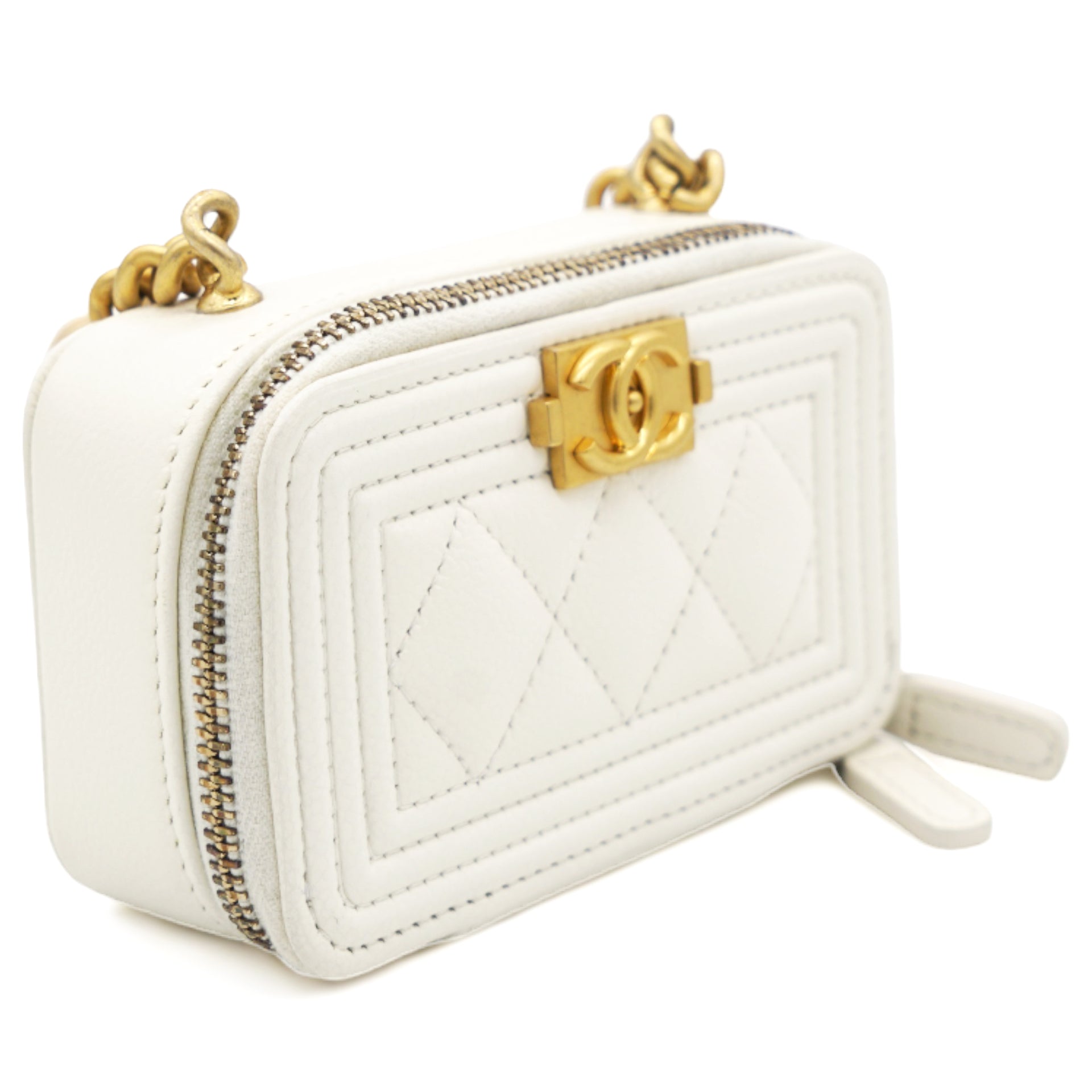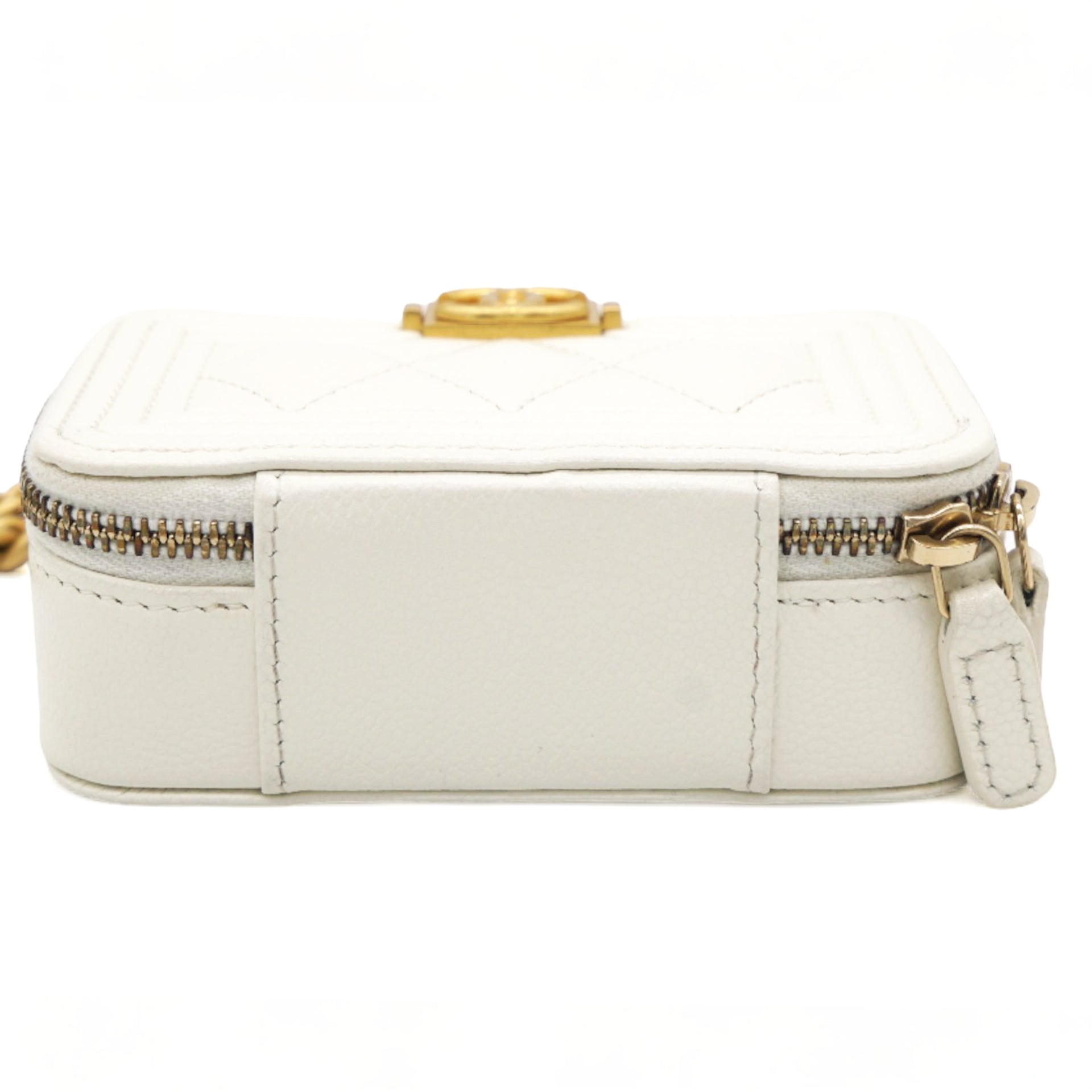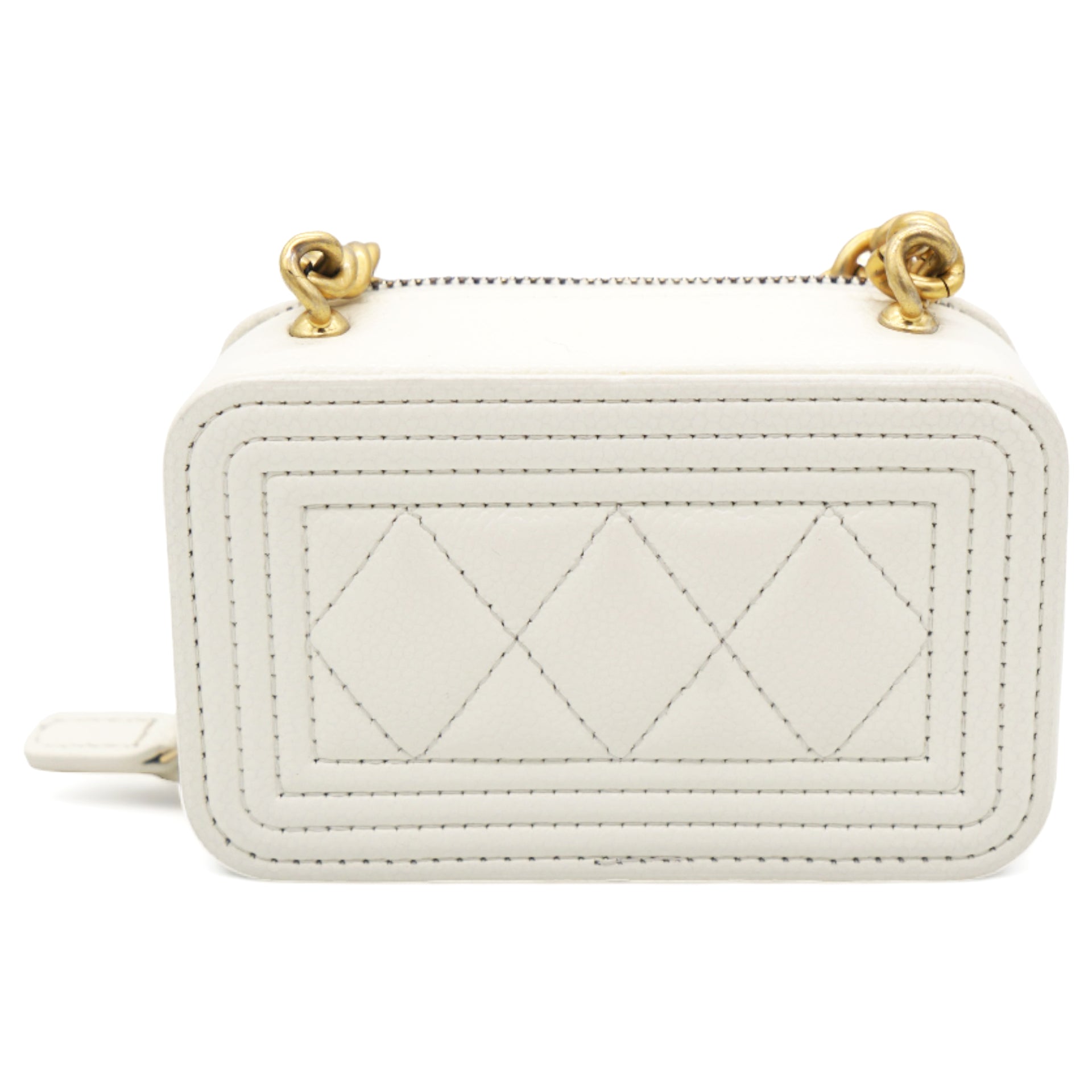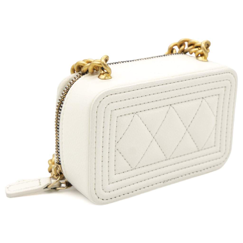 | This cardholder from Chanel is absolutely gorgeous to look at! Crafted from caviar leather in white, it features the signature quilts, the Boy CC logo on the front zip, and a brushed gold chain link for you to parade it in style. Organize your essentials in style with this beautiful creation. |