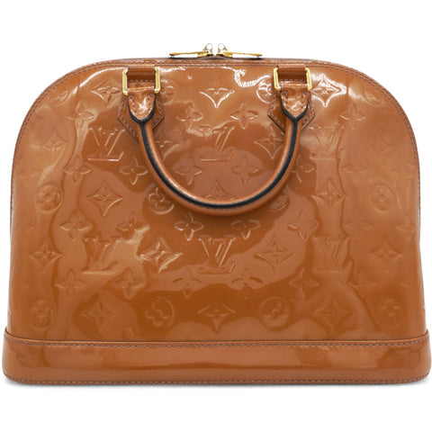 | This tote is crafted of Louis Vuitton embossed monogram vernis leather in brown. The bag features a solid patent leather base with protective feet, rolled leather top handles, and a double polished brass zipper that opens to an interior of brown microfiber with patched pockets. |