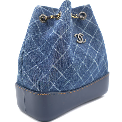 Exceptional Chanel Gabrielle backpack in blue denim, hardware in gilt and silver metal , double chain strap in gilt and silver metal interwoven with navy blue leather allowing the bag to be worn in the hand on the shoulder or on the back.