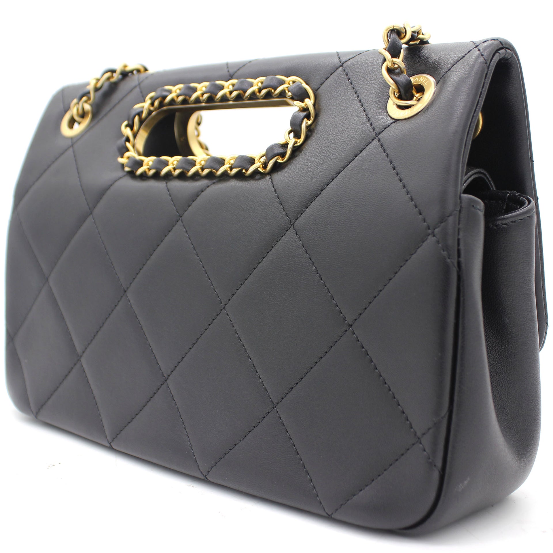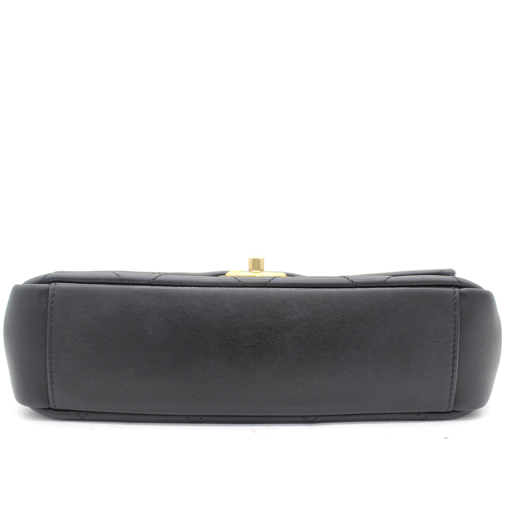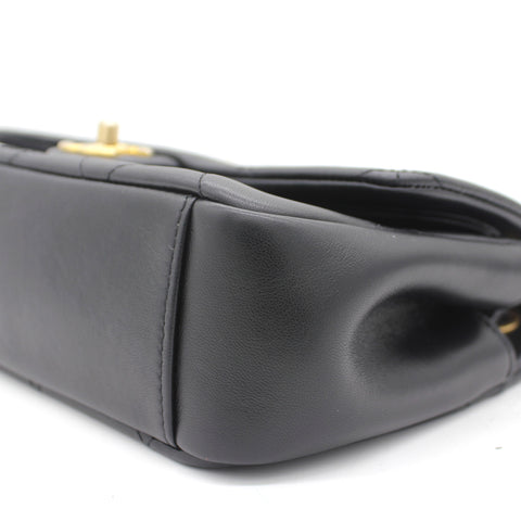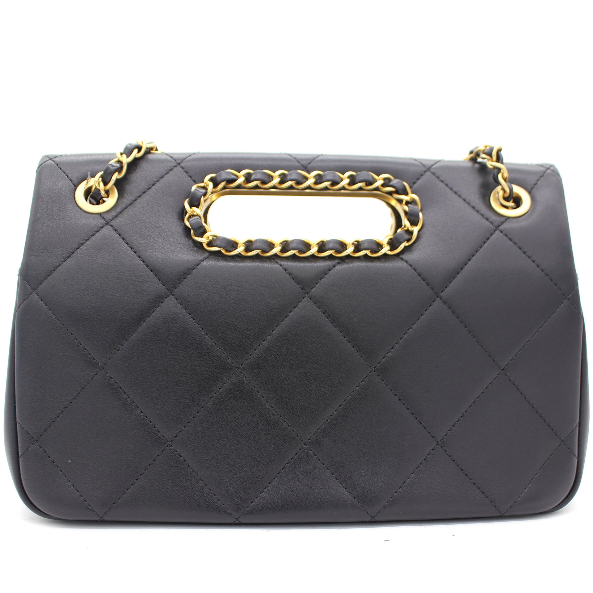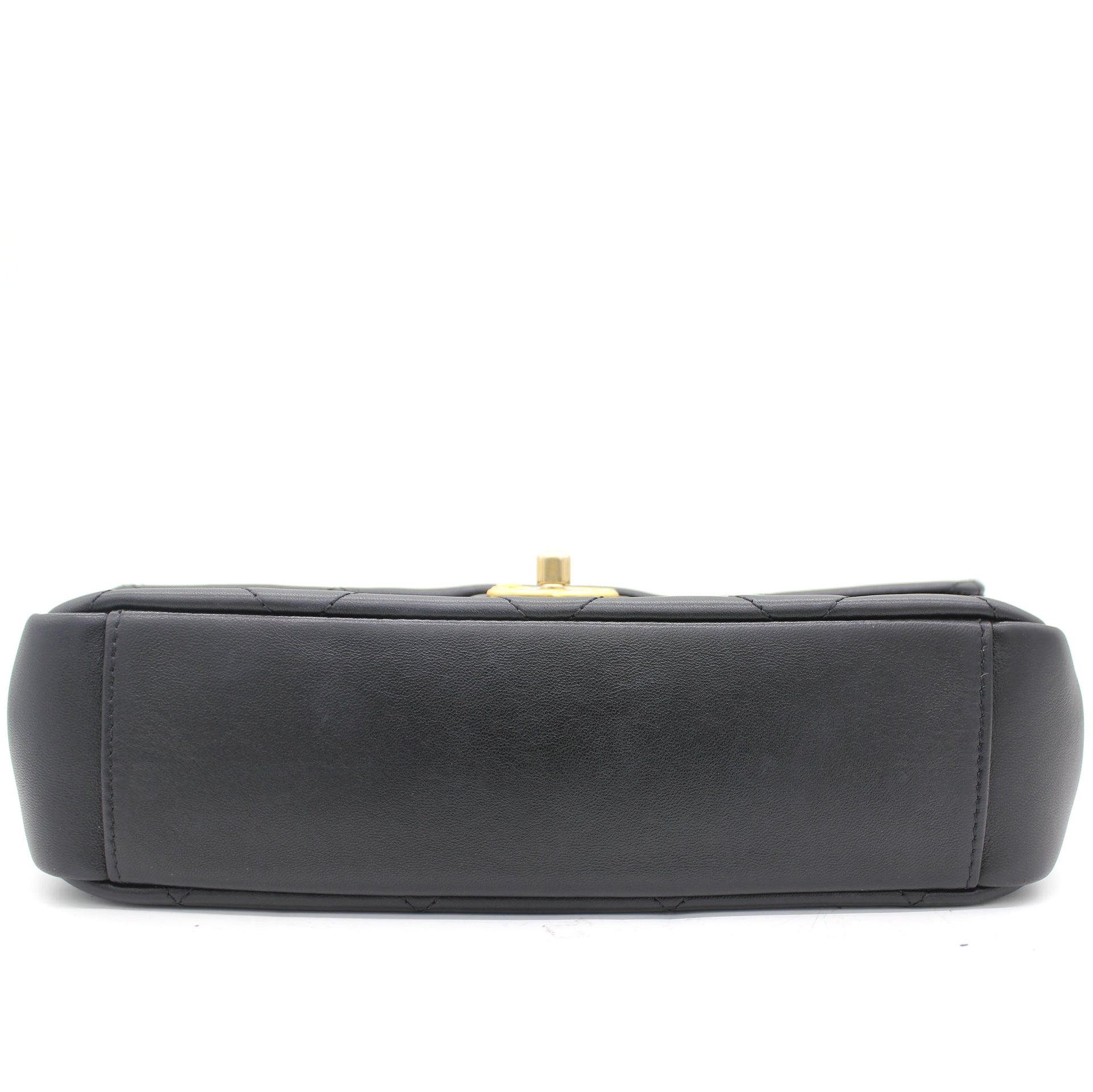 | We are in utter awe of this flap bag from Chanel as it is appealing in a surreal way. Exquisitely crafted from smooth black calfskin leather, it adorned with classic interlock gold chain on hidden handle and finished with the iconic CC turn-lock on the flap. The piece has gold-tone hardware, and a lovely chain link just so you can easily parade it. This flap bag is a coveted piece, so cease the wait and make this luxurious bag yours today. |