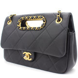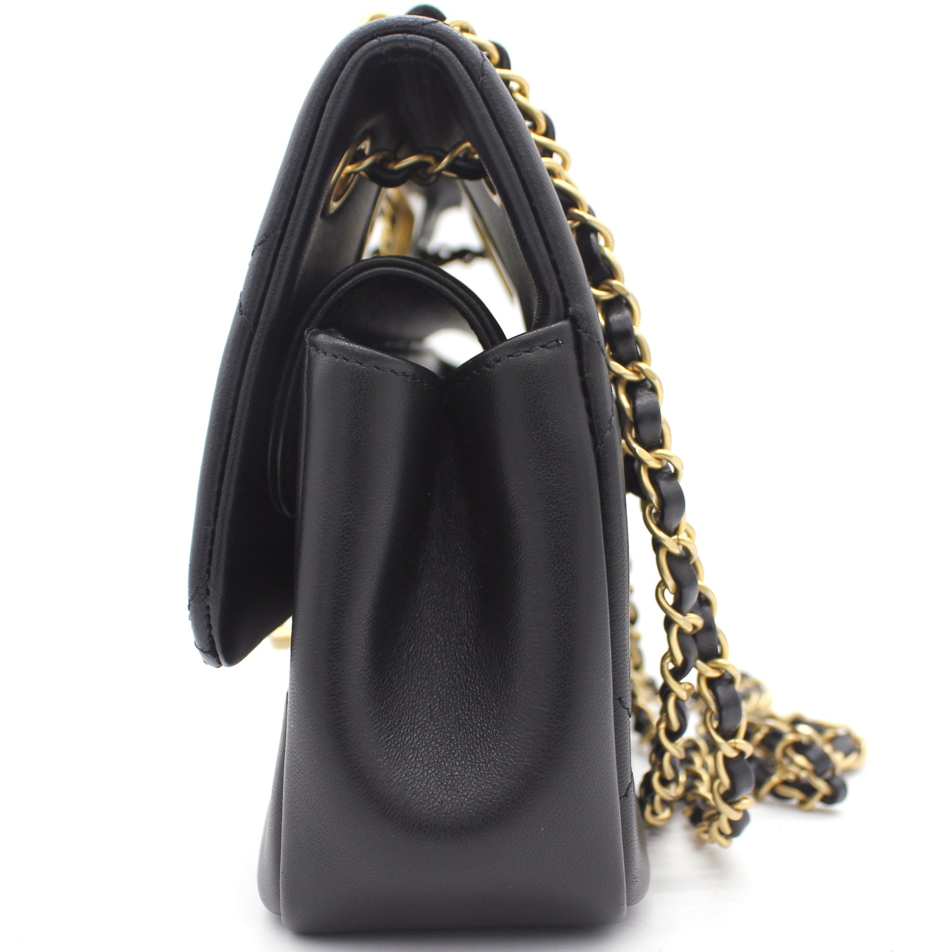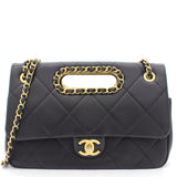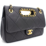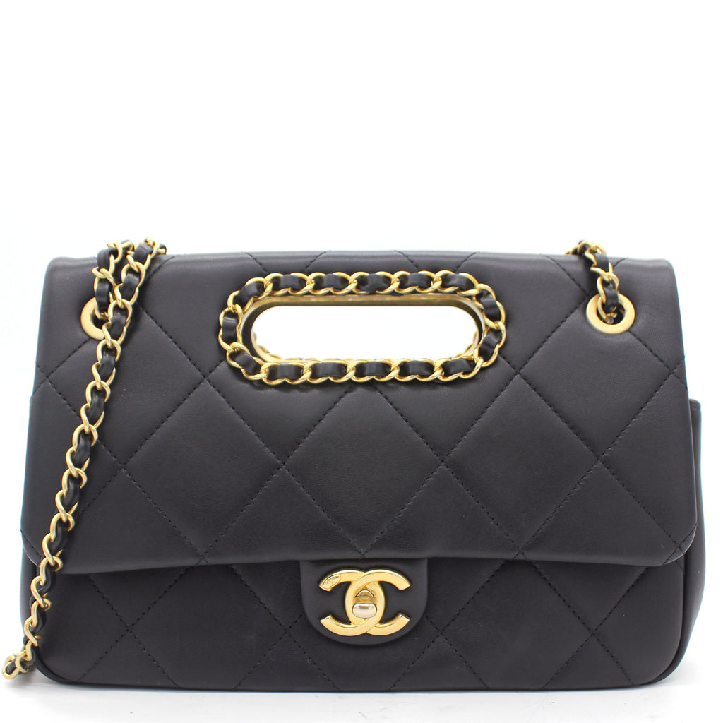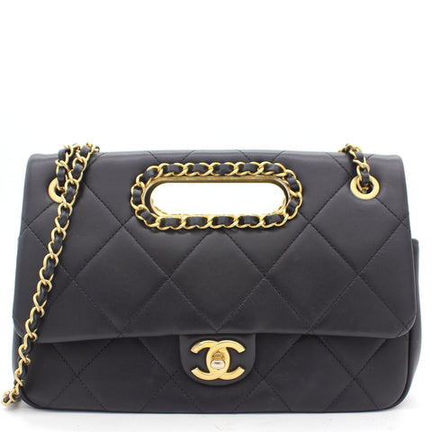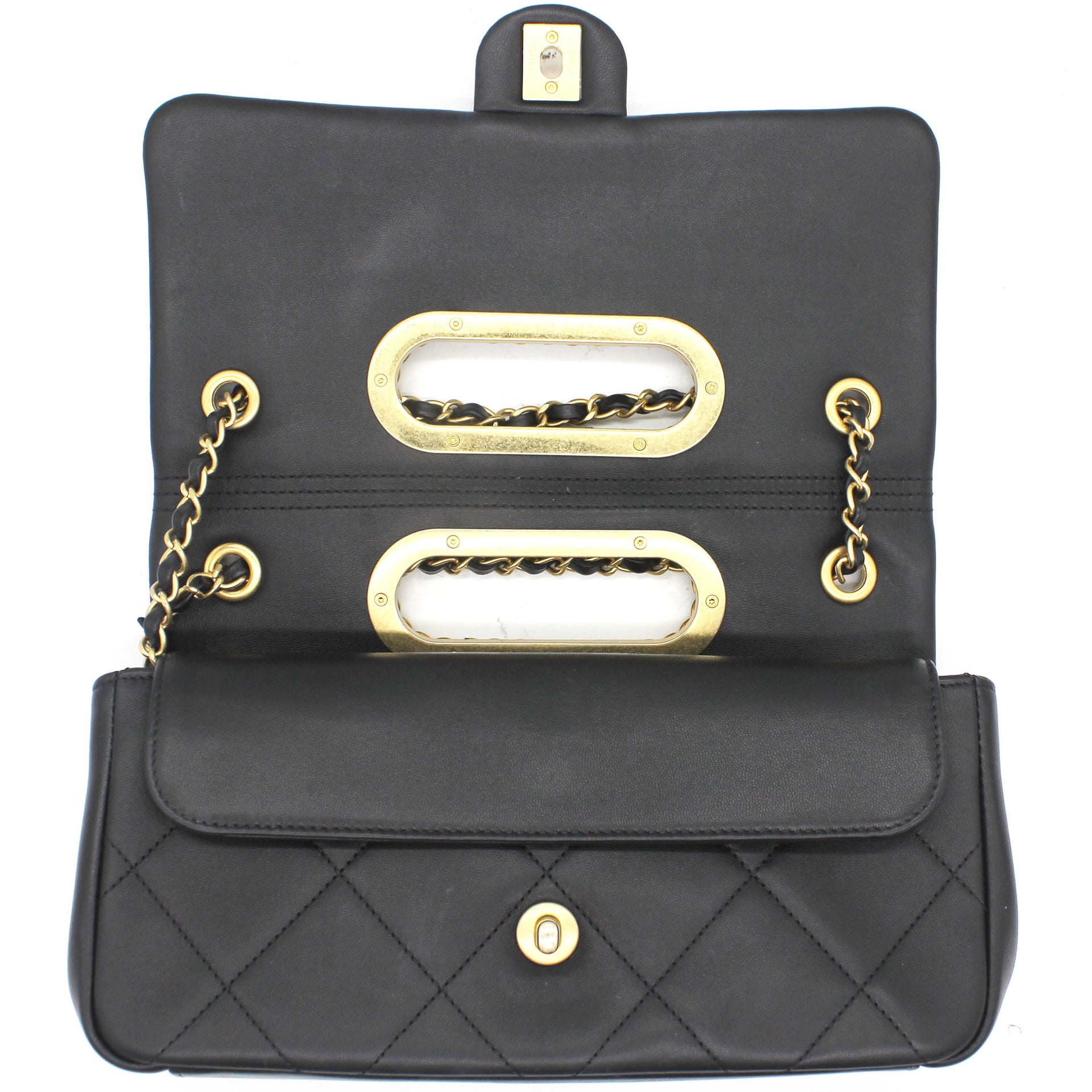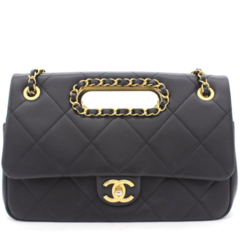 | We are in utter awe of this flap bag from Chanel as it is appealing in a surreal way. Exquisitely crafted from smooth black calfskin leather, it adorned with classic interlock gold chain on hidden handle and finished with the iconic CC turn-lock on the flap. The piece has gold-tone hardware, and a lovely chain link just so you can easily parade it. This flap bag is a coveted piece, so cease the wait and make this luxurious bag yours today. |