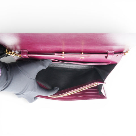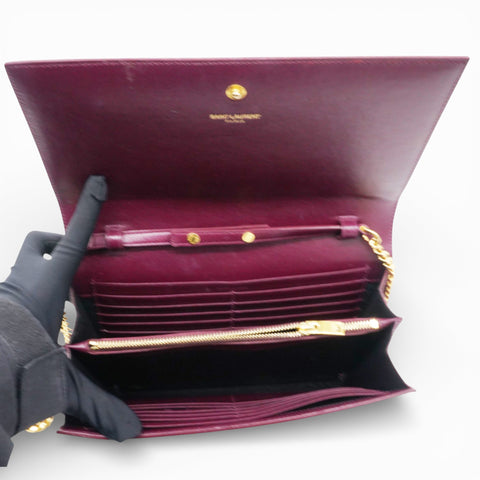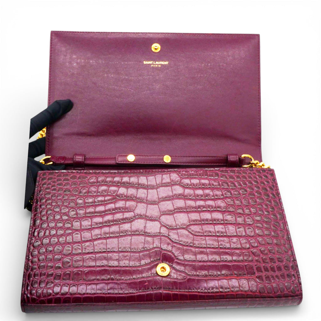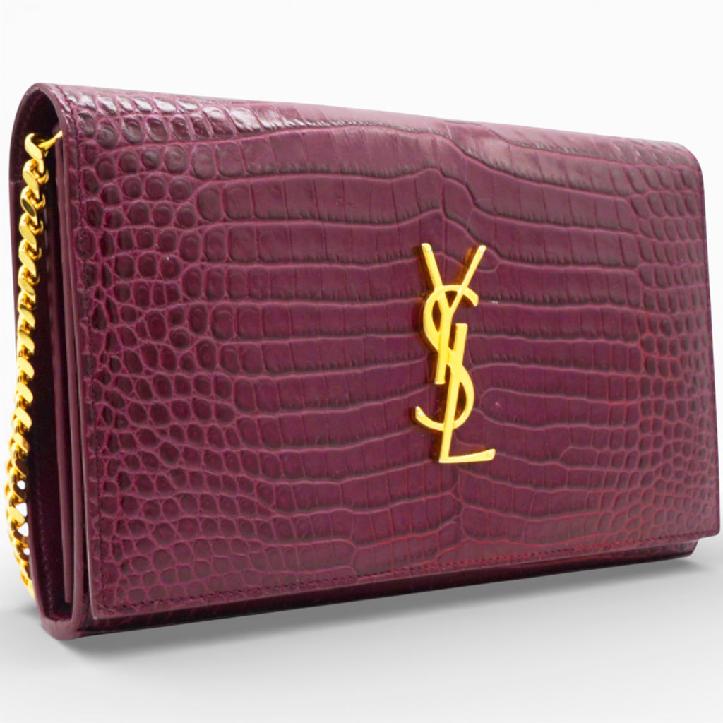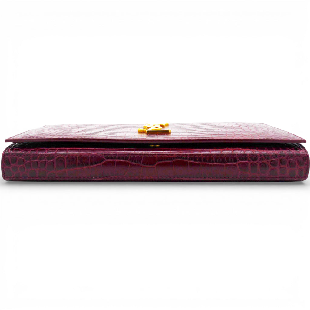 | An elegant Saint Laurent clutch crafted from burgundy croc-embossed leather, featuring a sleek silhouette and a refined chain strap. A timeless accessory that transitions effortlessly from day to evening. |