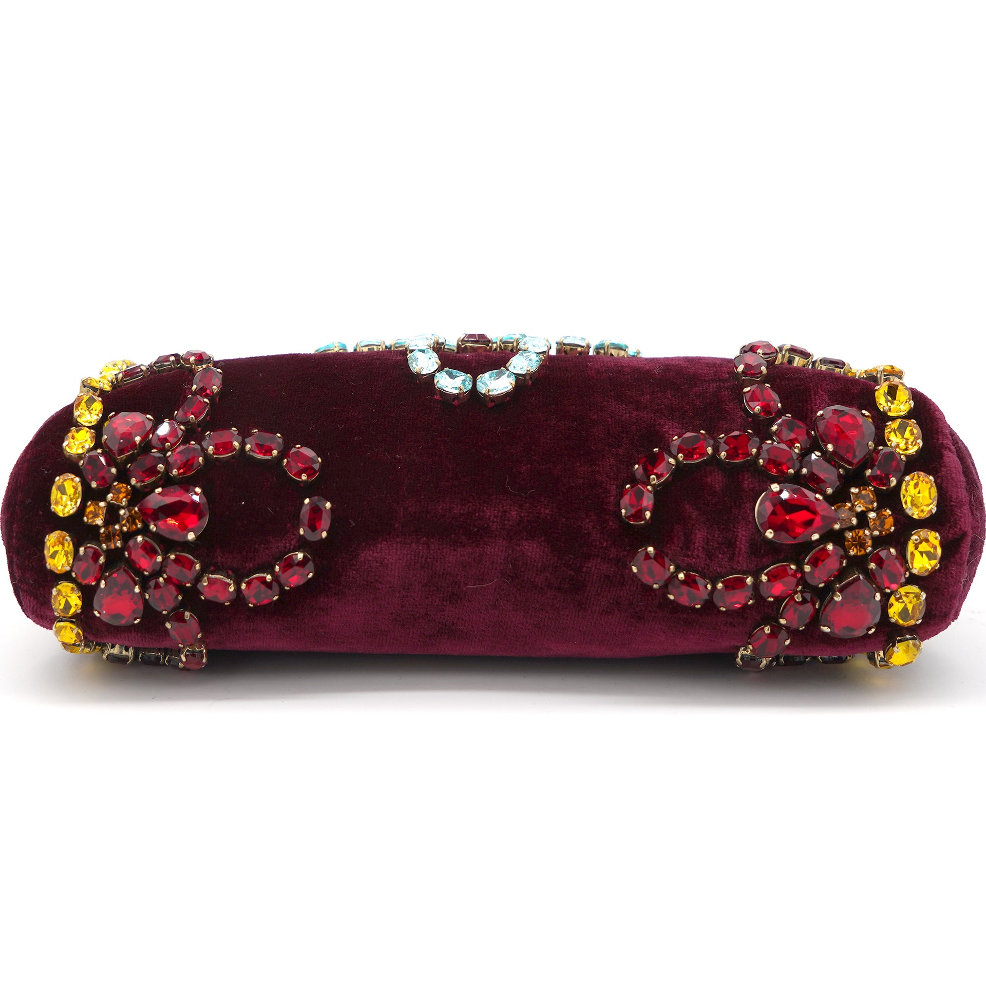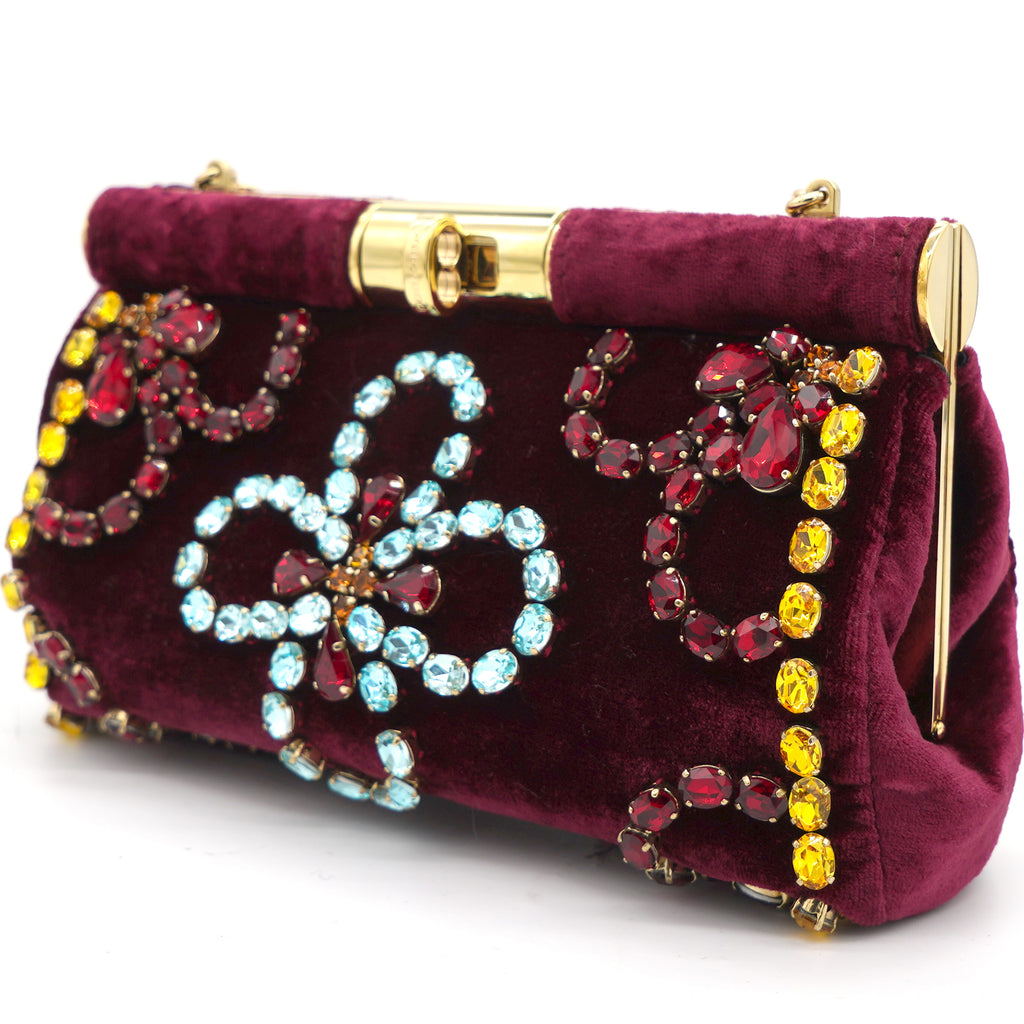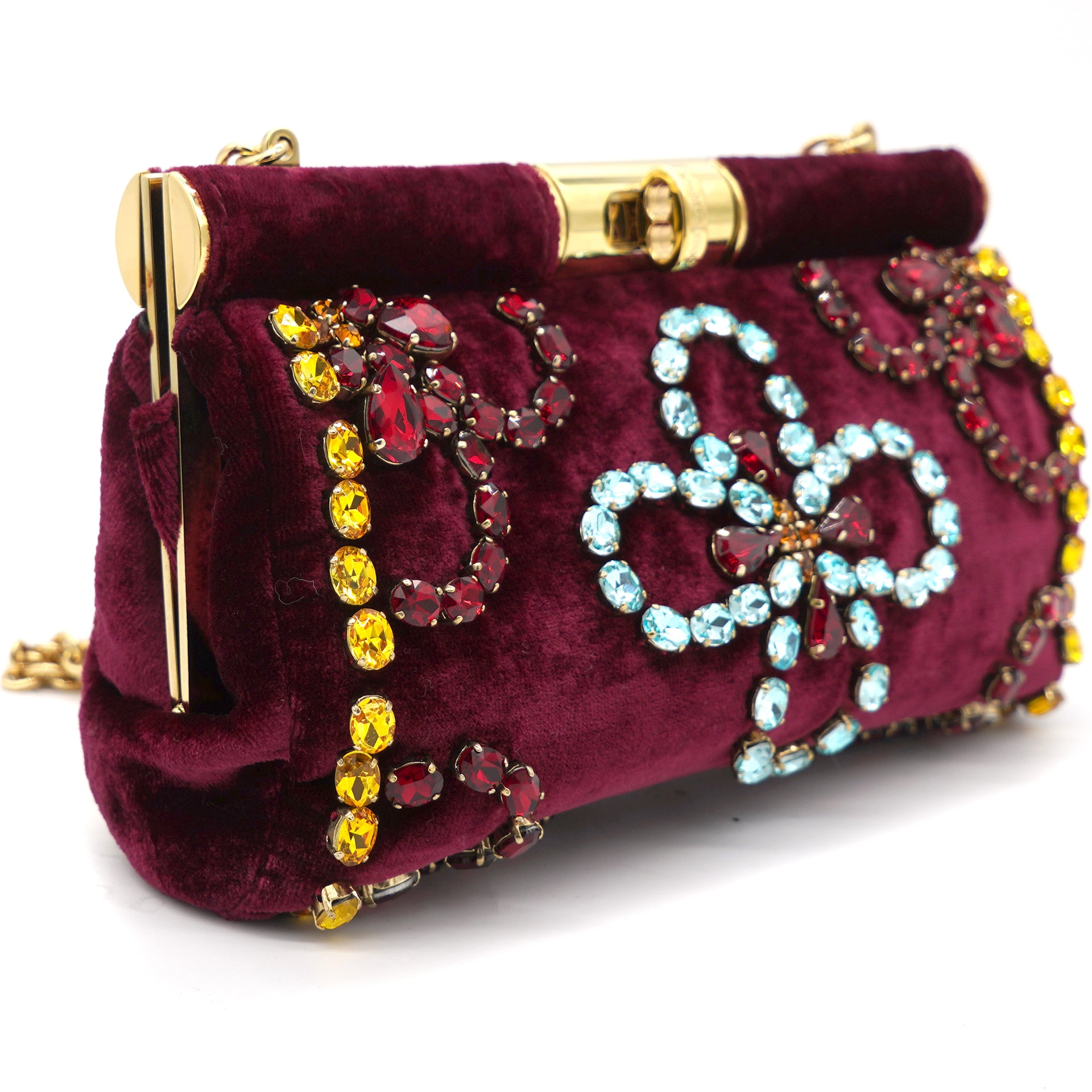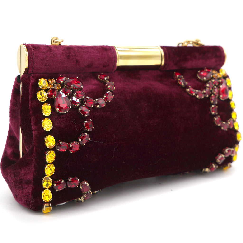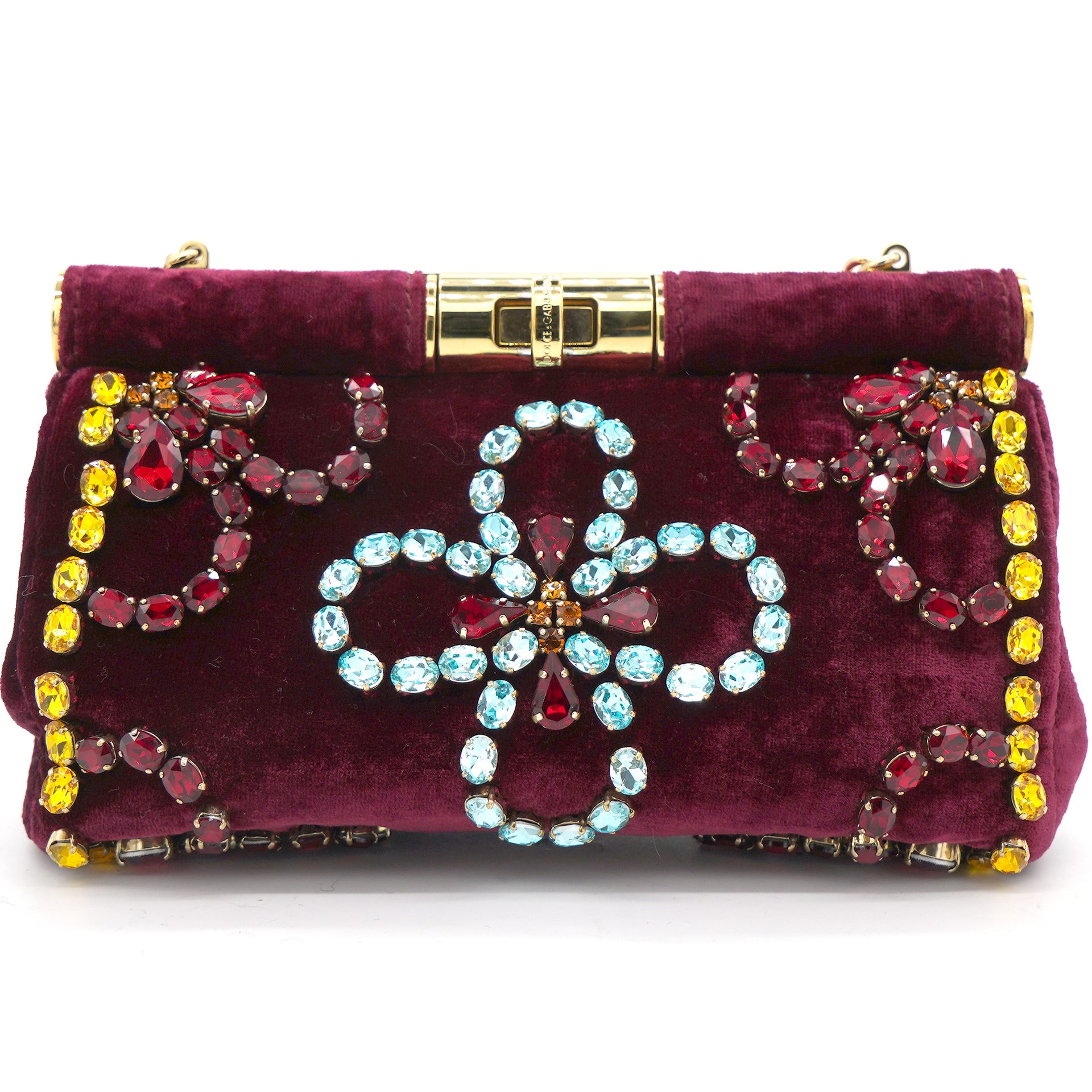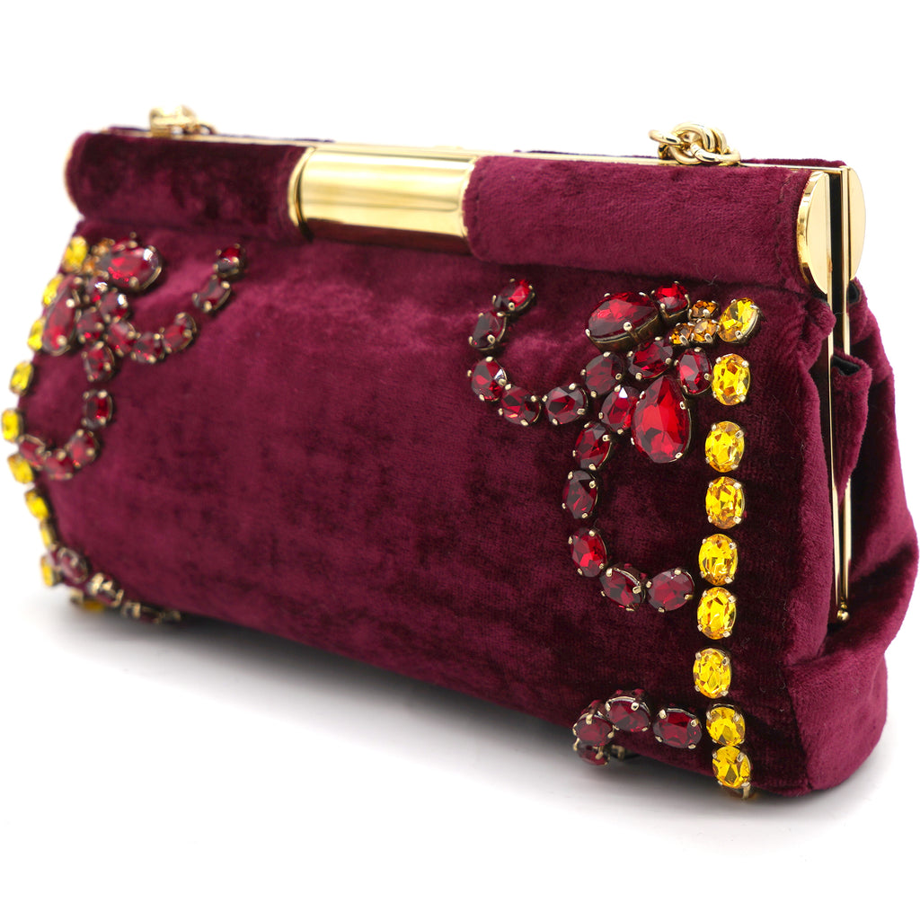 An absolute delight, this bag is a Dolce & Gabbana creation. Crafted from soft velvet, the bag features a lush burgundy shade, decorated with mix-crystals embellishment, the brand logo on the front turn lock closure, a chain-link strap, and satin-lined compartments. This bag is a must-have.