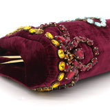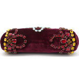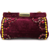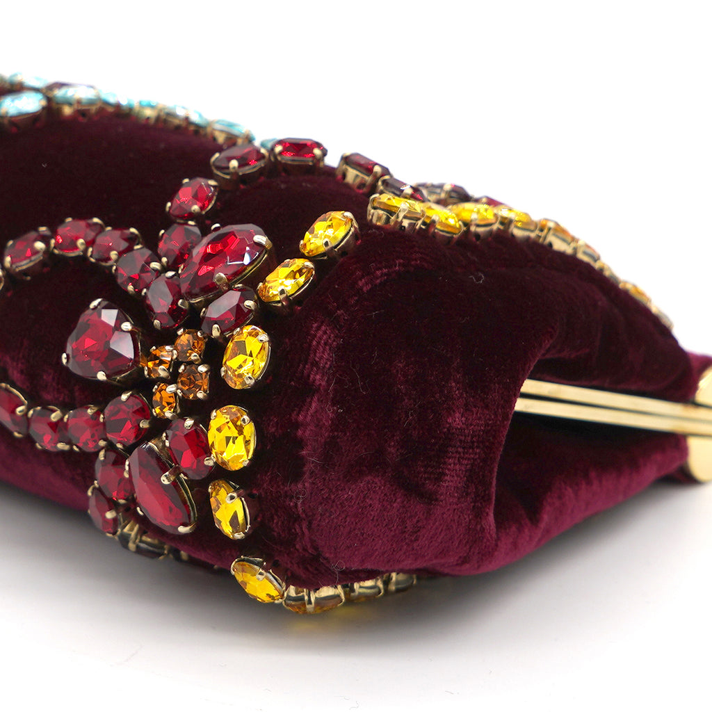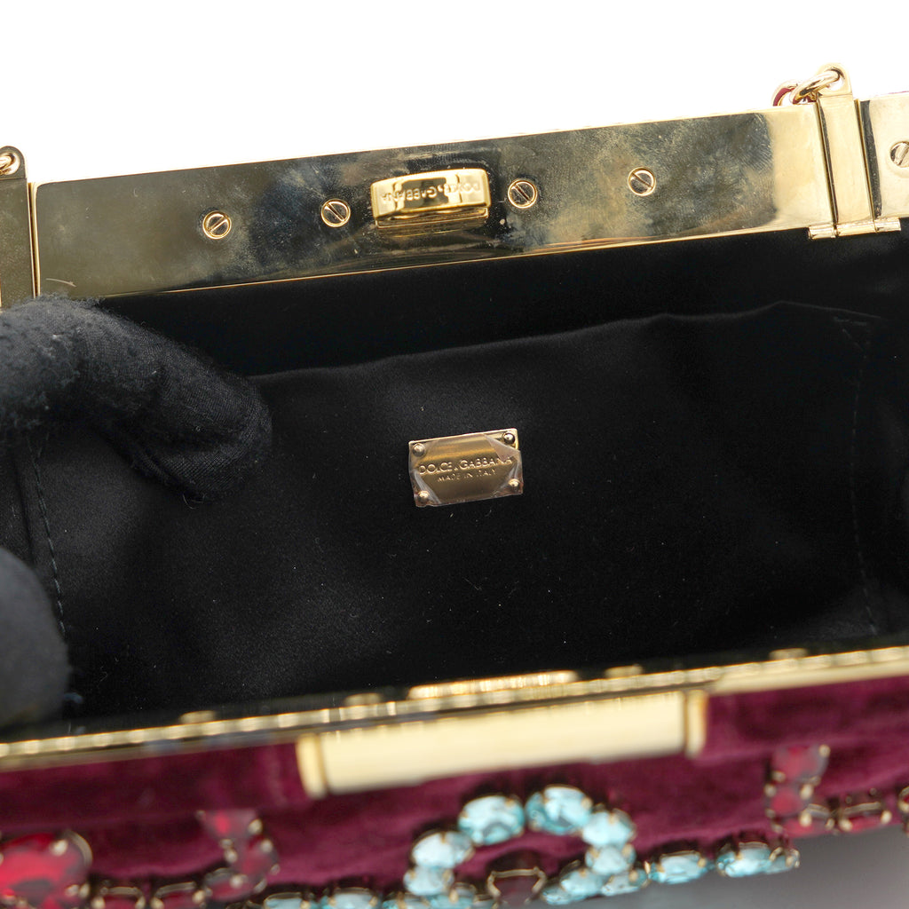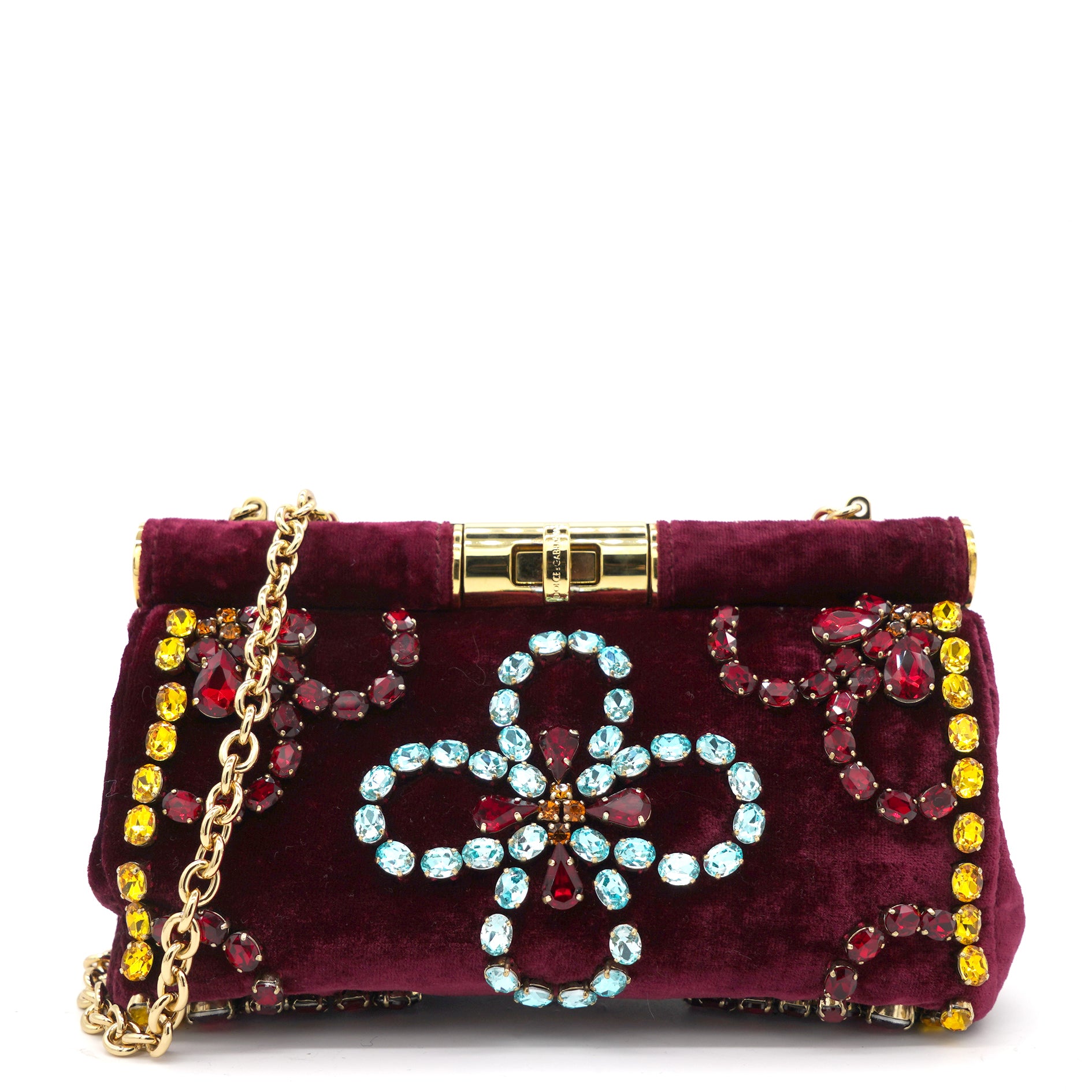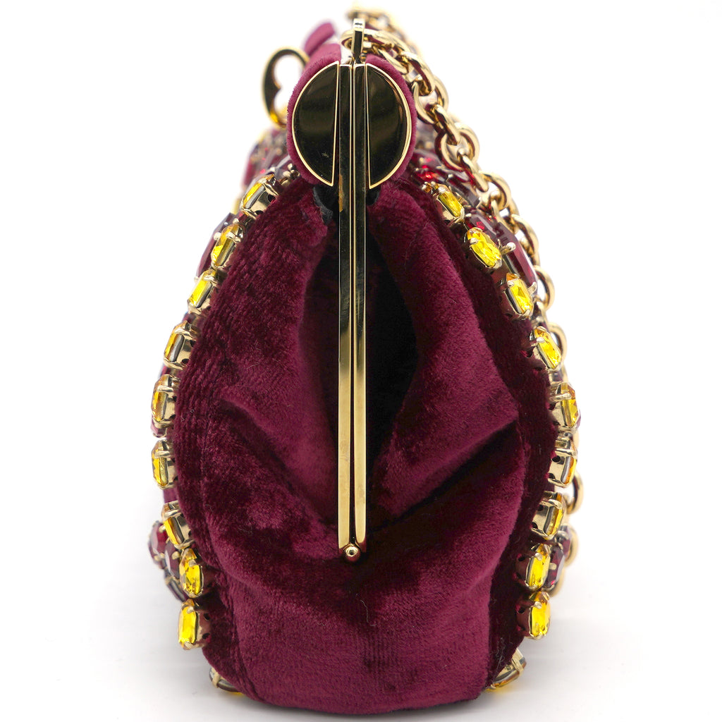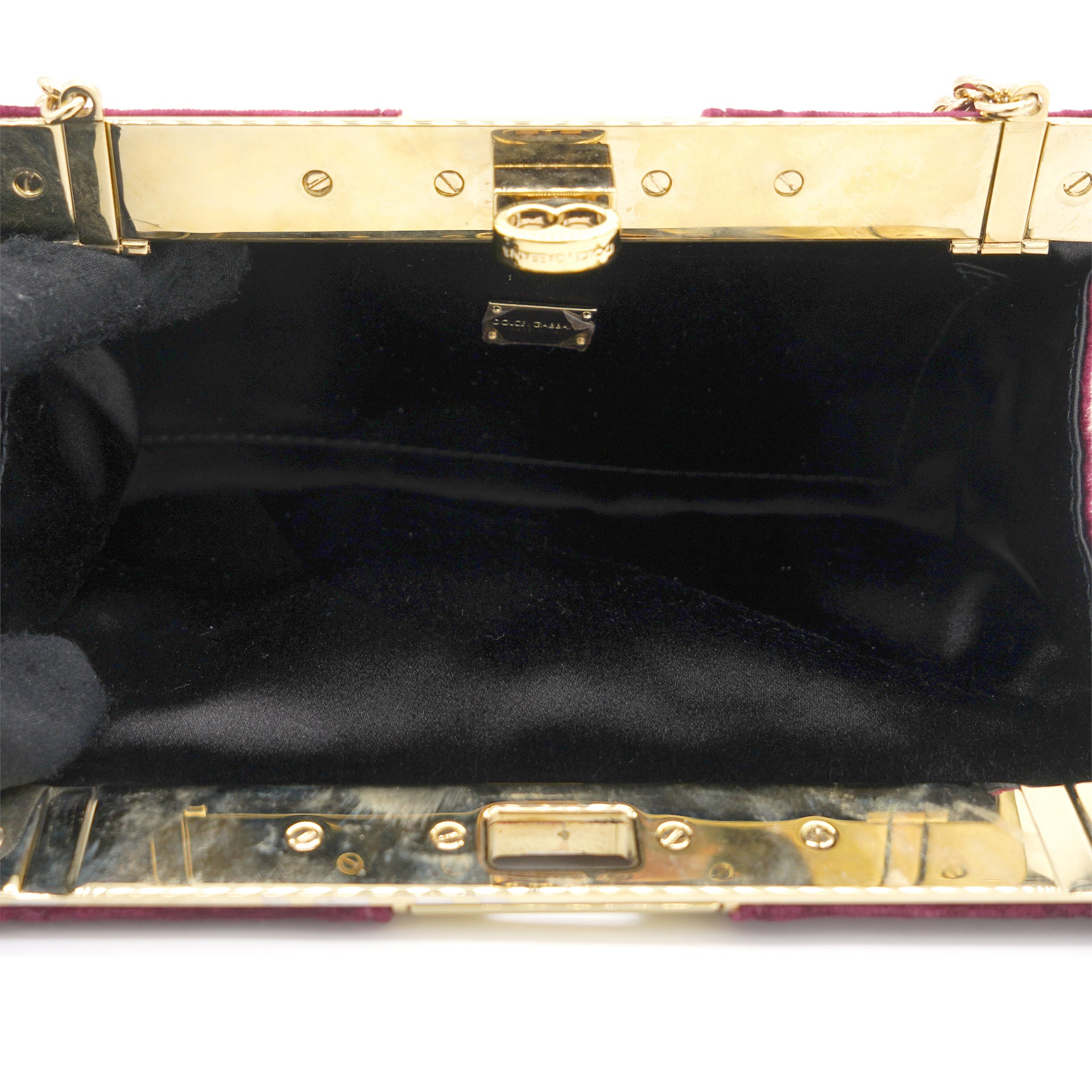 An absolute delight, this bag is a Dolce & Gabbana creation. Crafted from soft velvet, the bag features a lush burgundy shade, decorated with mix-crystals embellishment, the brand logo on the front turn lock closure, a chain-link strap, and satin-lined compartments. This bag is a must-have.