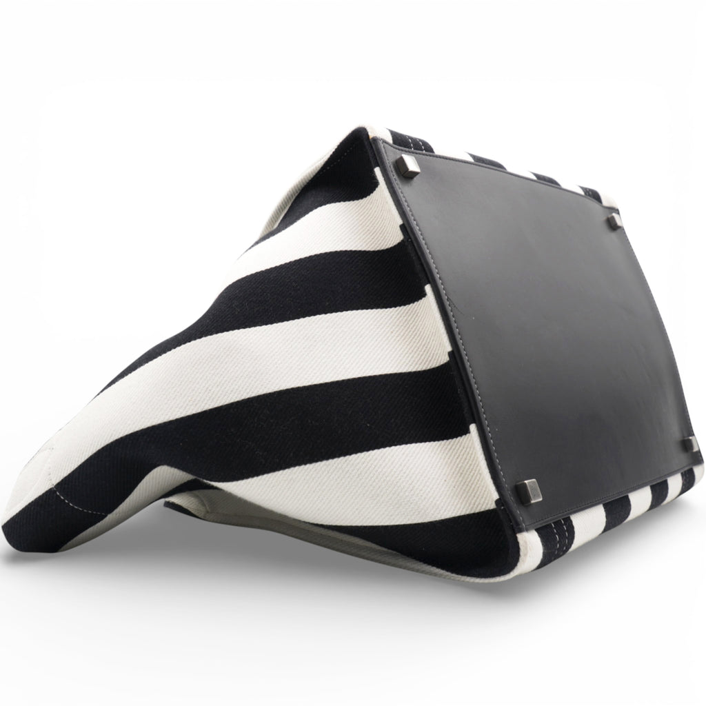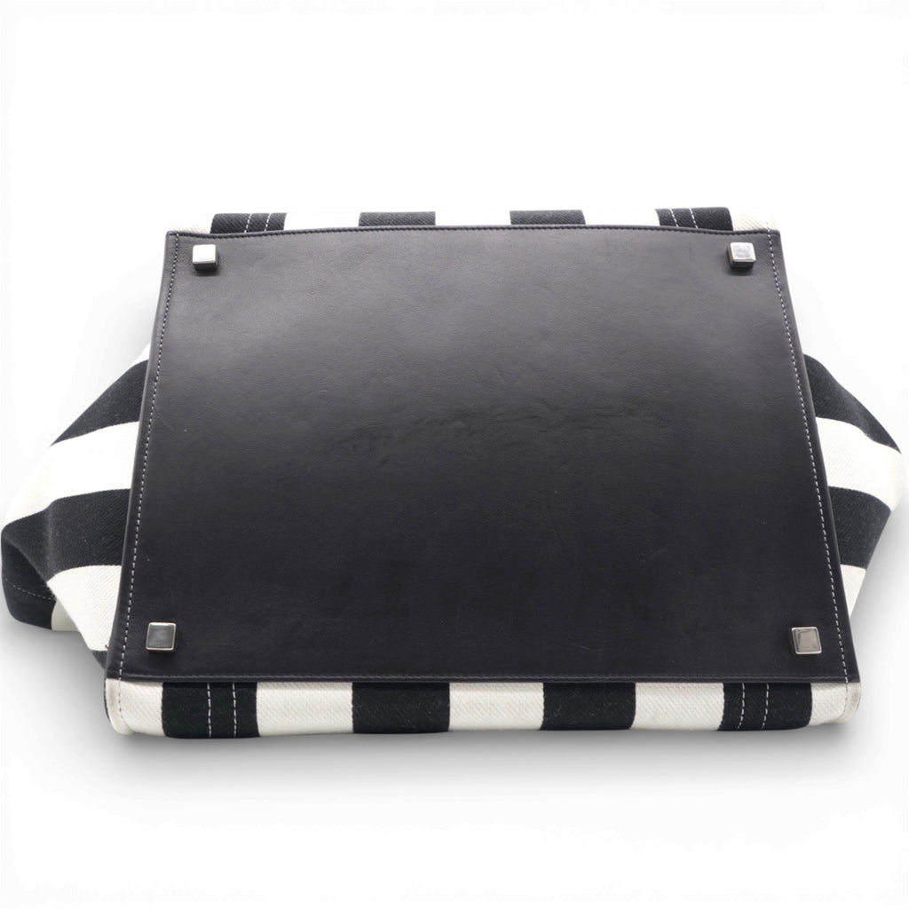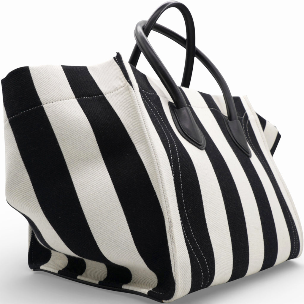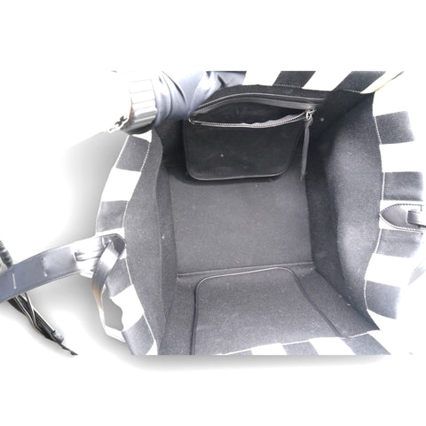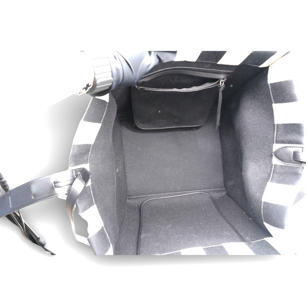| This stylish bag is a functional tote or a piece of luggage luxuriously crafted of brightly striped black and white cotton canvas. The bag features black rolled leather top handles with a facing leather trimmed pocket and a broad open top. This opens to a broadly spacious black fabric interior with a large hanging zipper pocket, ideal for everyday use and for travel of all sorts, from Celine! |