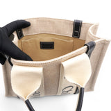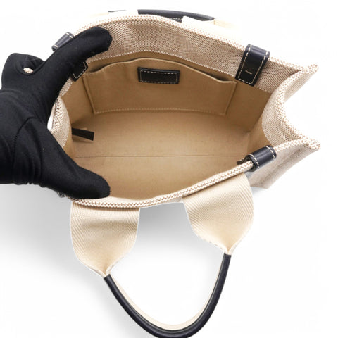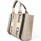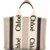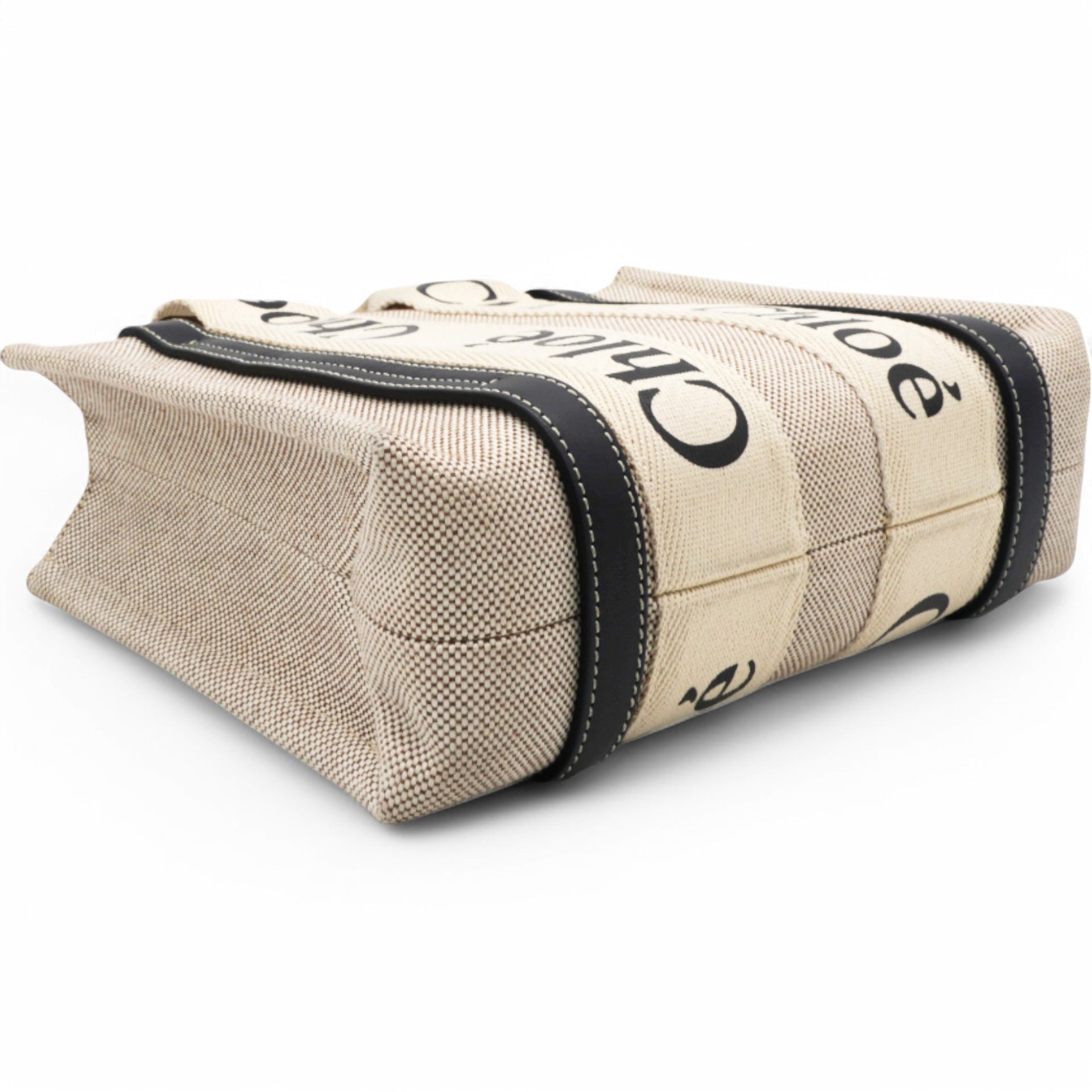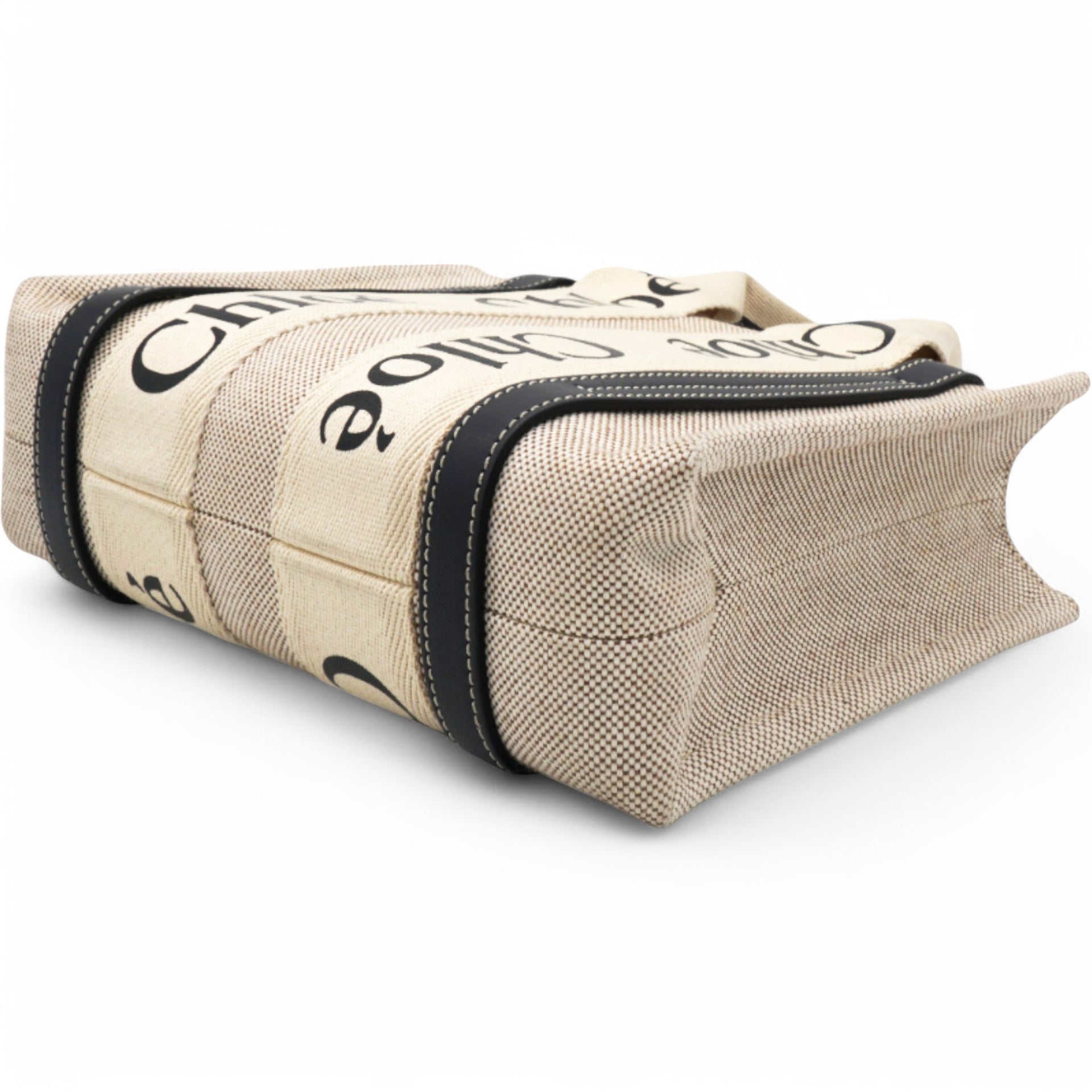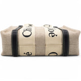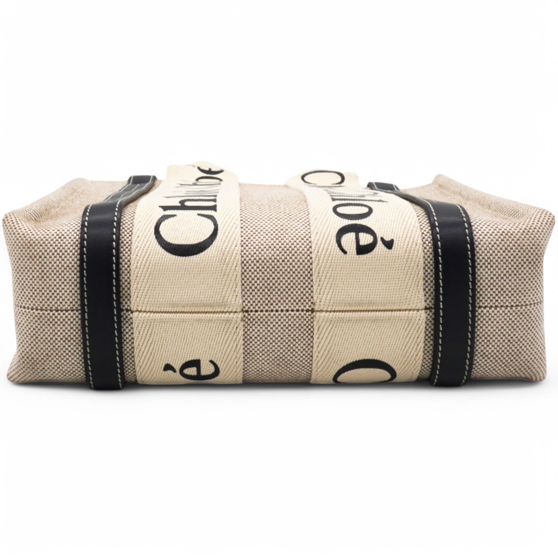| This stylish tote is crafted of natural beige canvas, with navy blue leather trim and the Chloe logo in black. It features canvas top handles, an open top, and a beige fabric interior with a pocket. |
