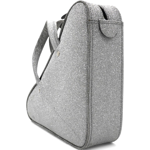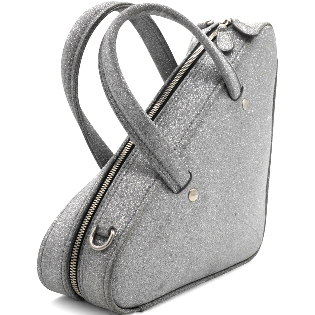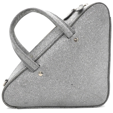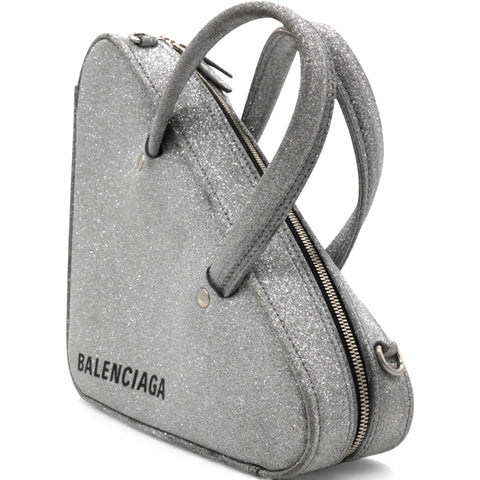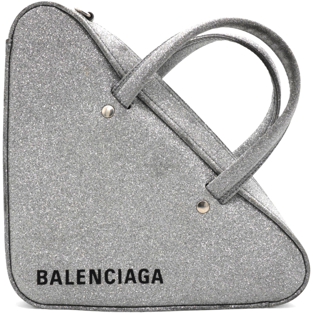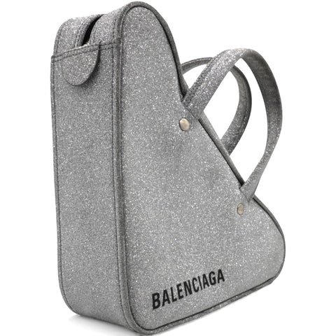 The Balenciaga Triangle Duffle Bag in silver is a stylish handbag and shoulder bag made from leather. Measuring 21cm x 21cm x 6.5cm, it is compact yet functional for everyday use.
