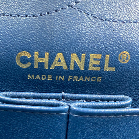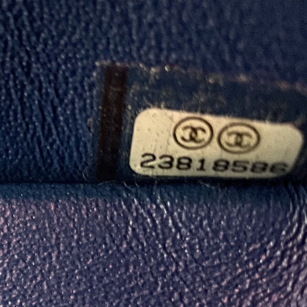 Interior Material: Blue leather lining with one main compartment and two patch pockets.