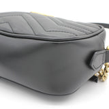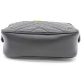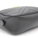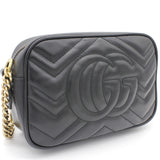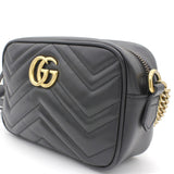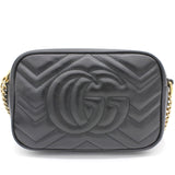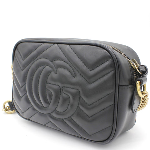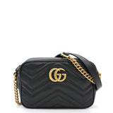 | The mini GG Marmont chain shoulder bag has a softly structured shape and a zip top closure with Double G hardware. The chain shoulder strap has a leather shoulder detail. Made in matelassé leather with a chevron design and GG on the back. |