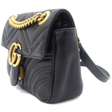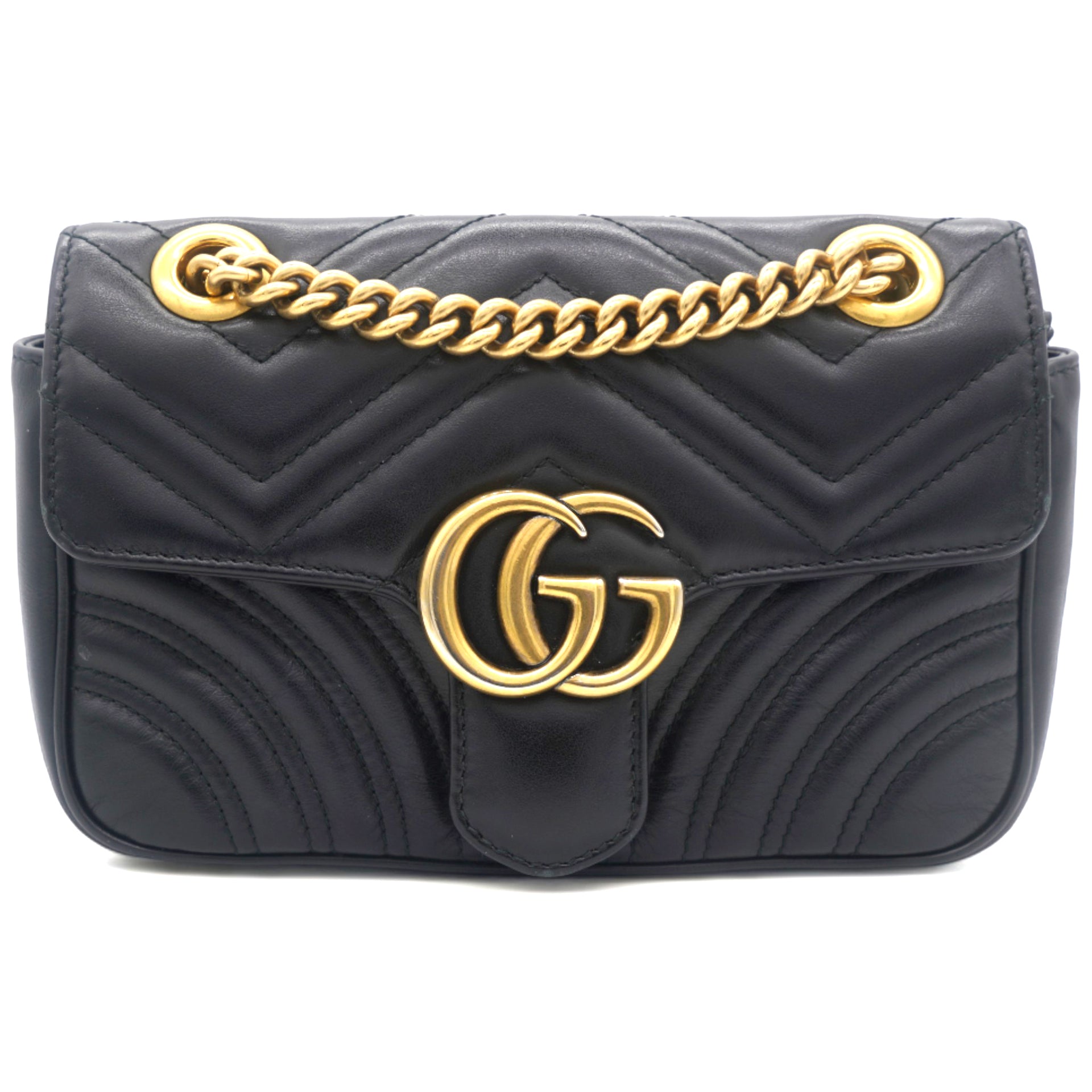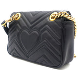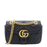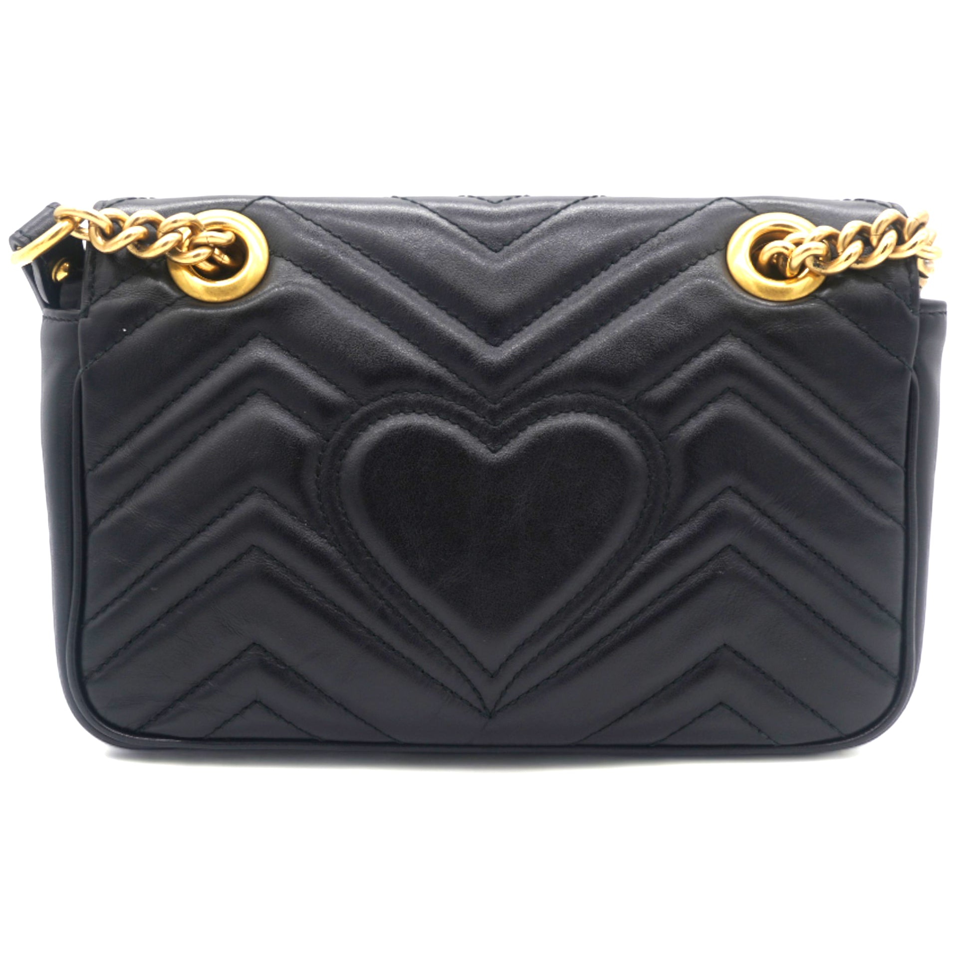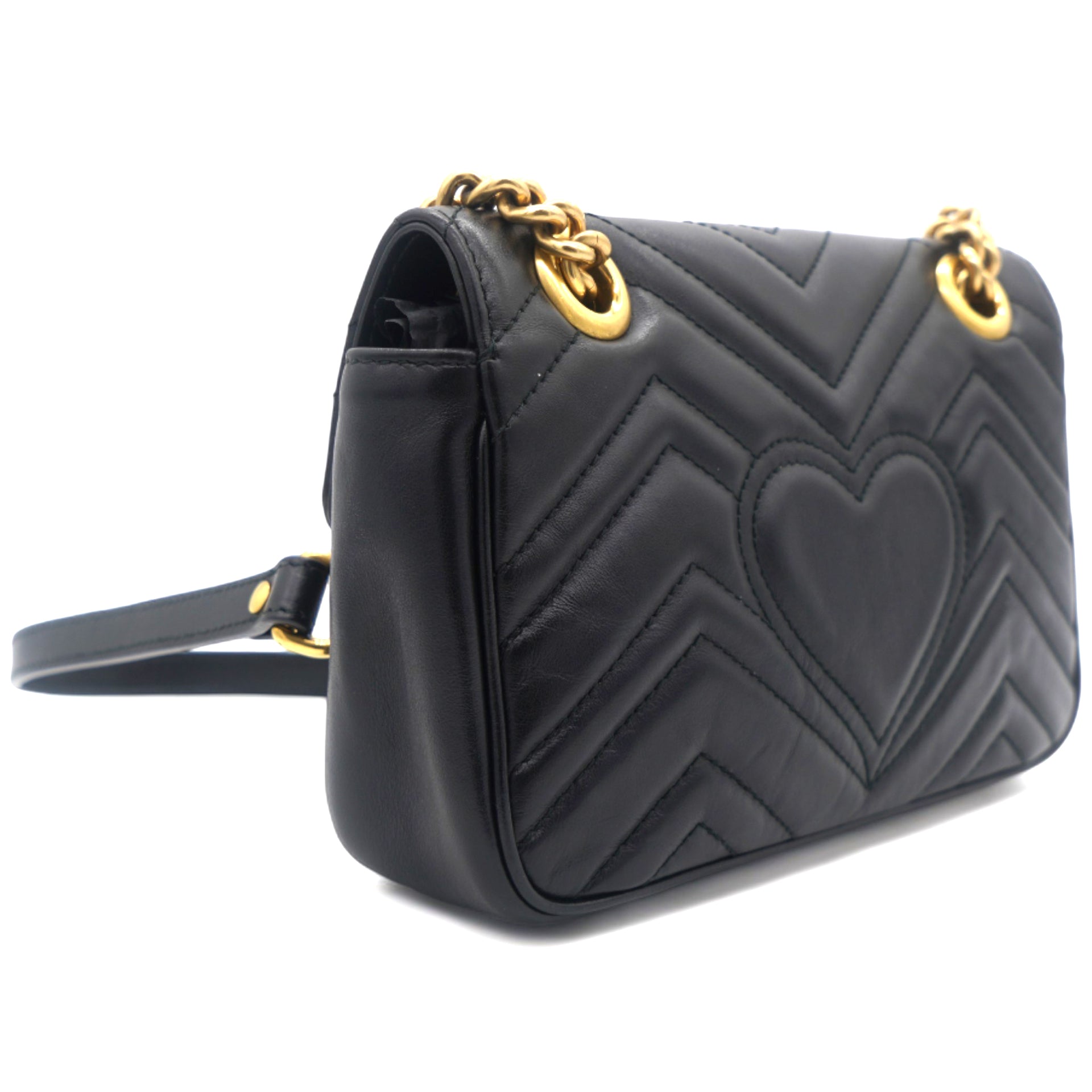 | The small GG Marmot flap bag has a softly structured shape and a flap closure with Double G hardware. The sliding chain strap can be worn multiple ways, changing between a shoulder and a top handle bag. Made in matelassé chevron leather with a heart on the back. |
