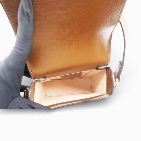 | This shoulder bag is crafted of coated canvas with the Gucci monogram. The bag features brown leather trim, an adjustable looping leather shoulder strap, and a gold horse-bit detail on the front. The flap opens to a beige microfiber interior. |