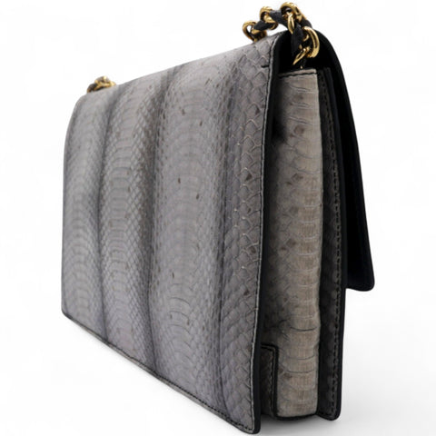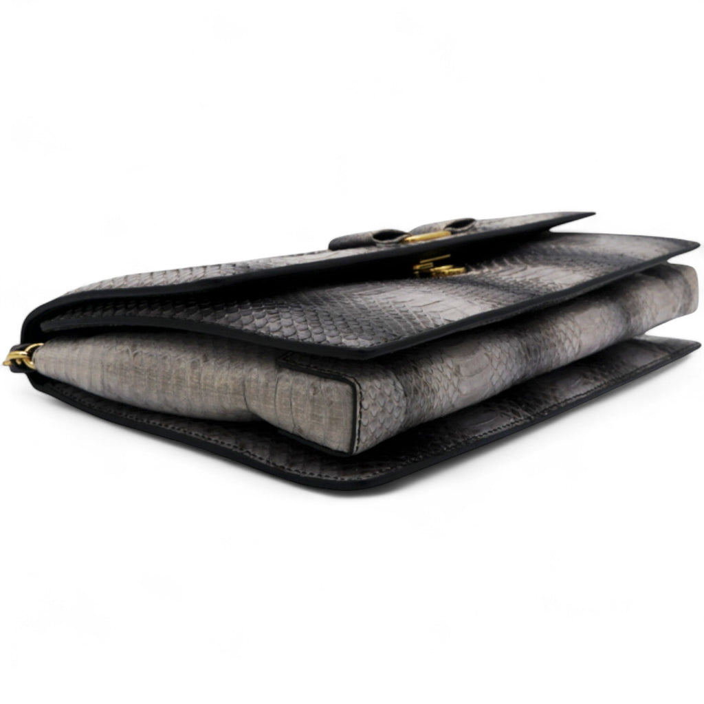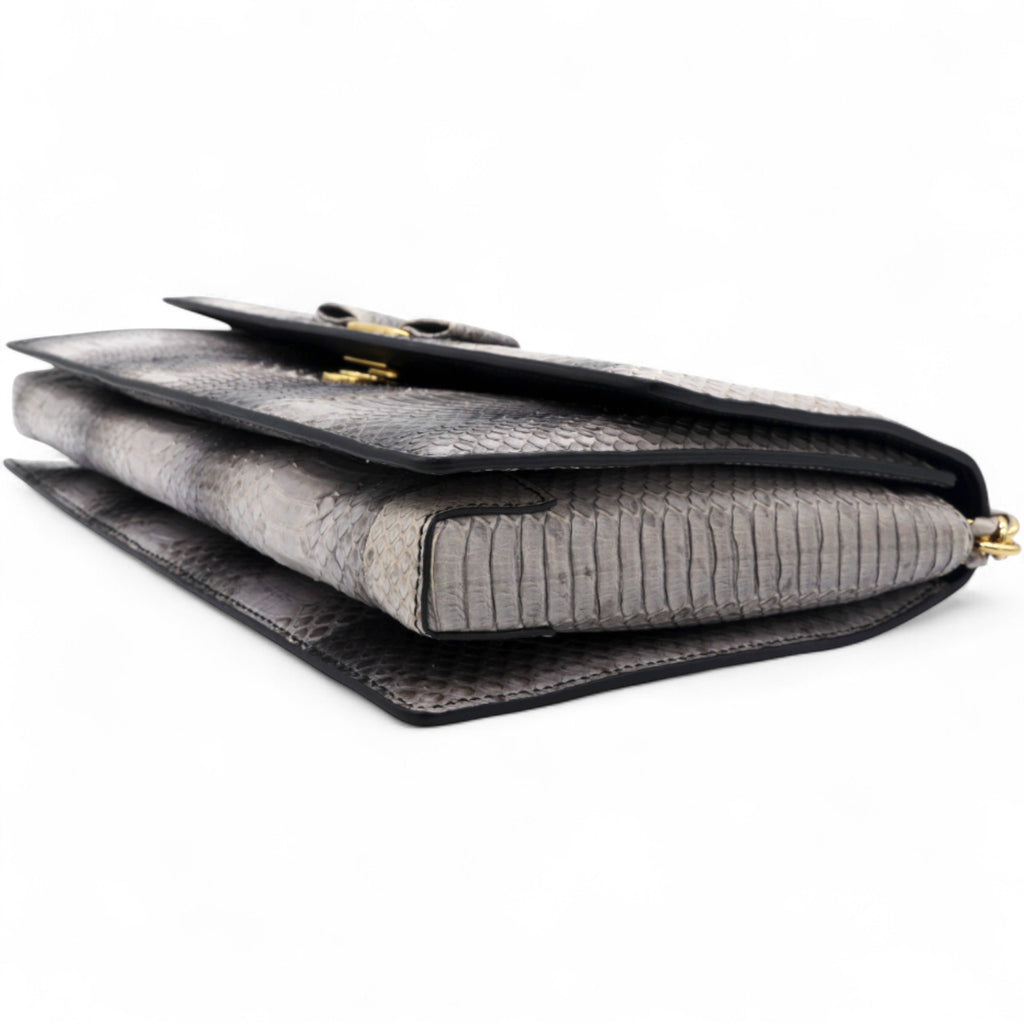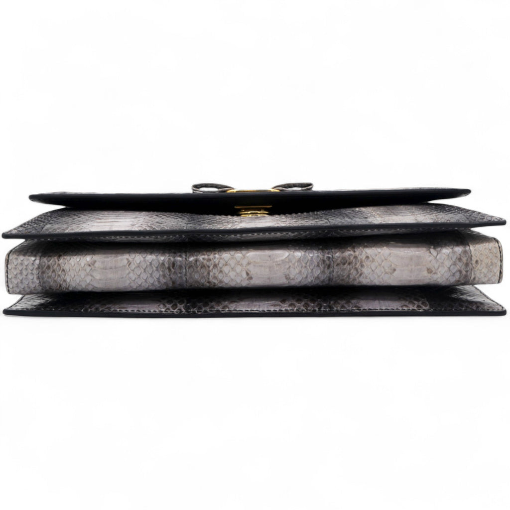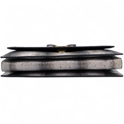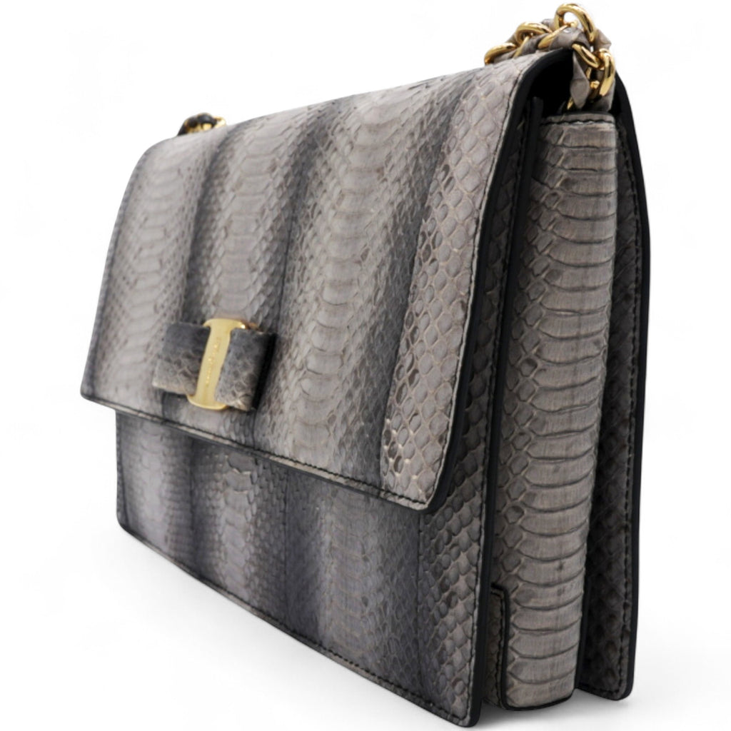| The Ginny bag is the perfect accessory! Featuring multi-shade grey python, the Ginny has a decorative bow at the front with the Ferragamo logo and a long chain link and leather strap to wear on your shoulder or tucked in as a clutch. Perfect for day or night with a flirty outfit. |