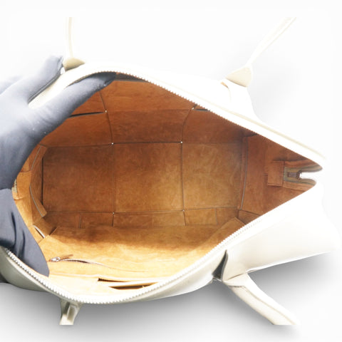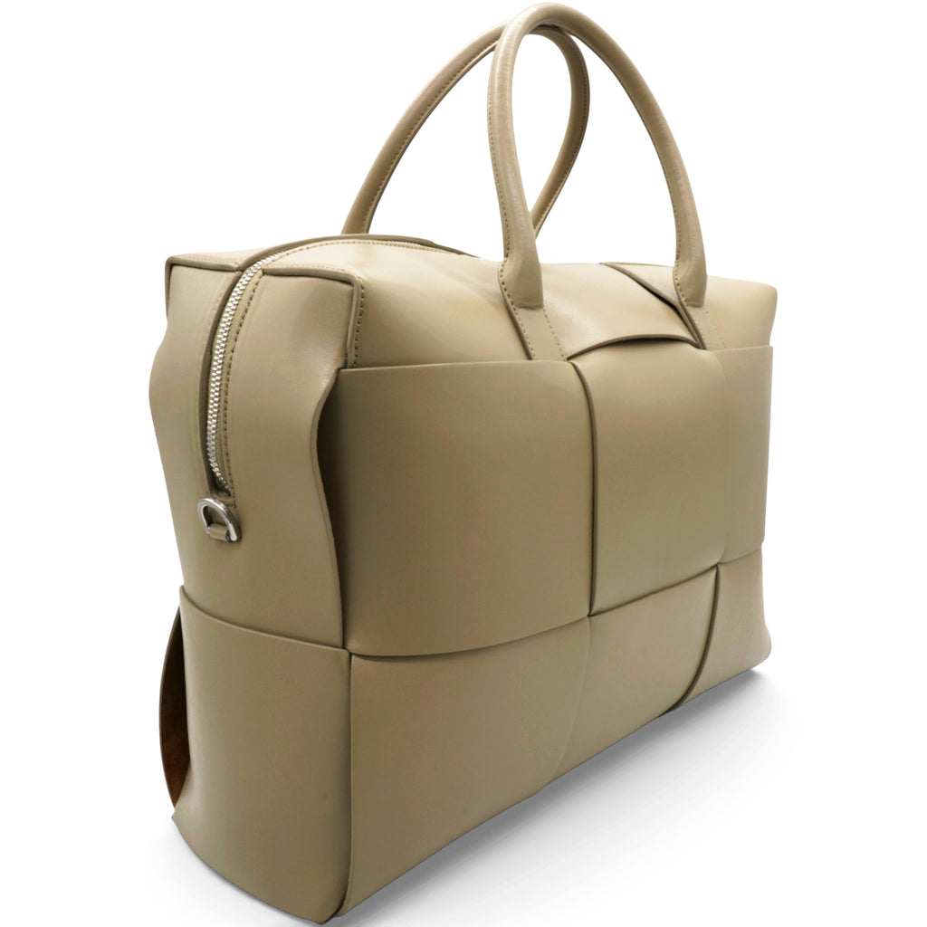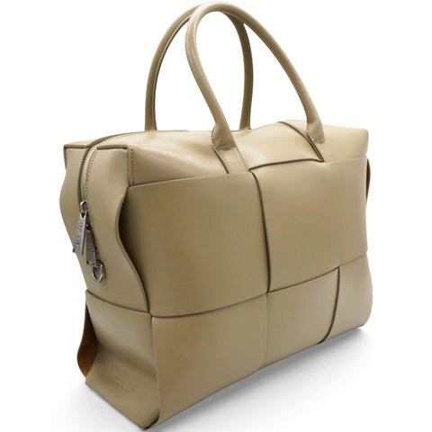 | This is an authentic BOTTEGA VENETA Maxi Intrecciato Arco Briefcase in Porridge. This exceptional handbag is crafted of smooth beige leather in a maxi weave effect. The tote features rolled leather top handles, an optional leather shoulder strap, and silver hardware. The top zipper opens to a brown suede interior with a hanging zipper pocket. |