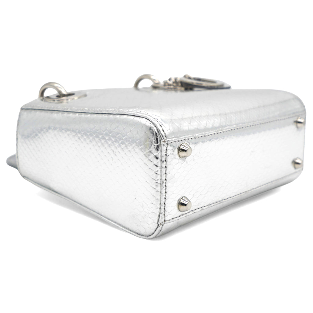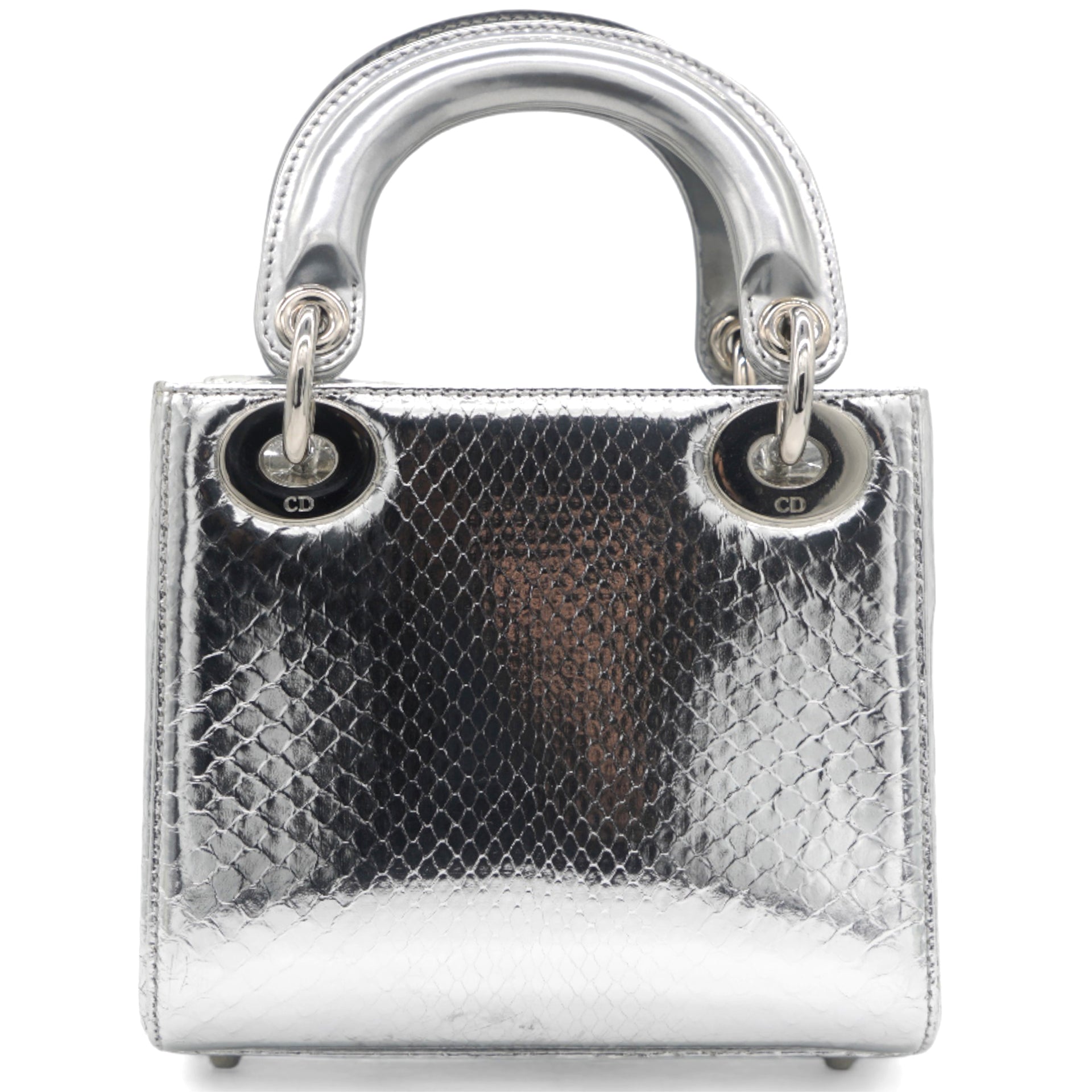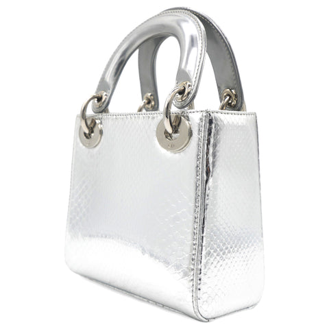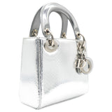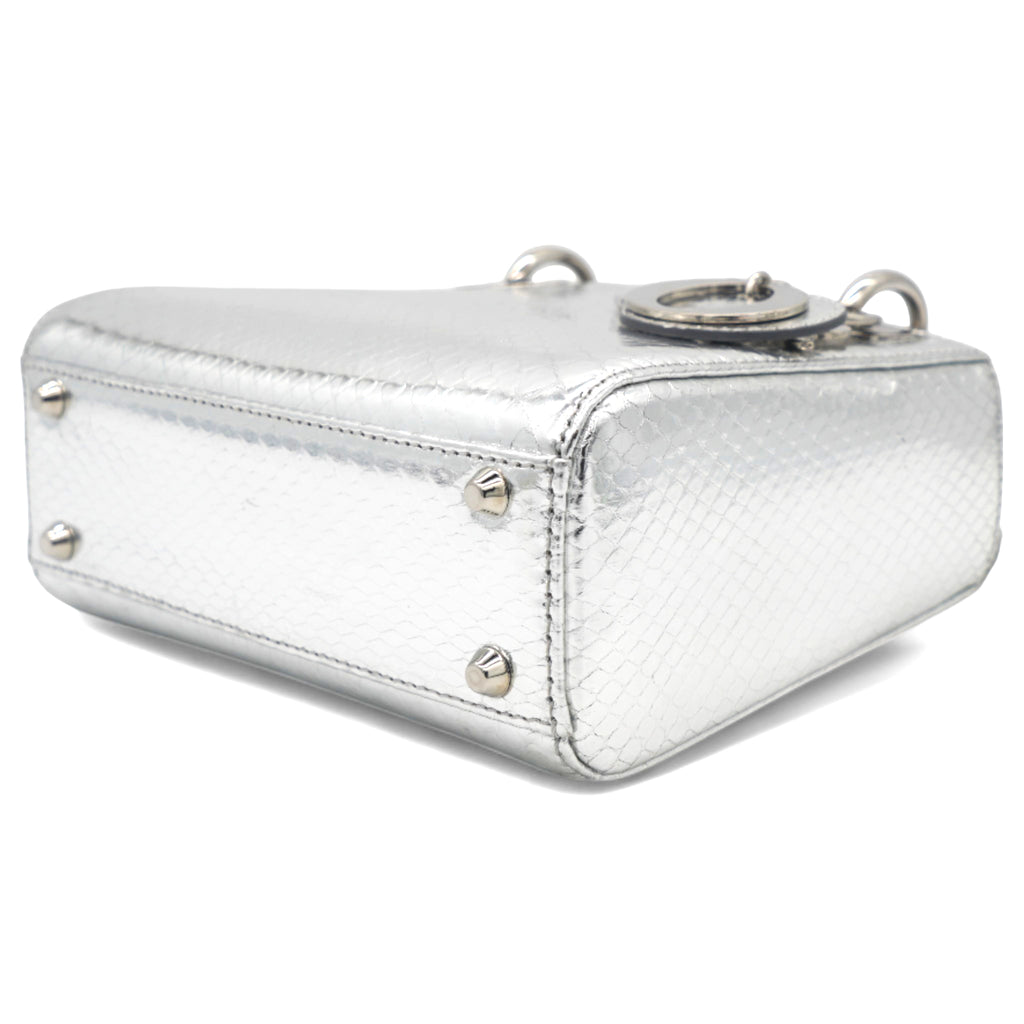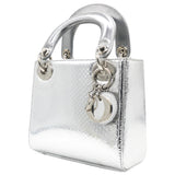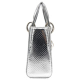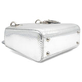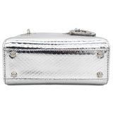 This delightful mini tote is crafted of beautifully textured silver snakeskin with matching leather top handles. The lizard is complimented by polished silver hardware including handle rings, large decorative eyelets and a hanging metal charms. The interior is a matching leather. This is a fabulous bag for just the necessities from Dior