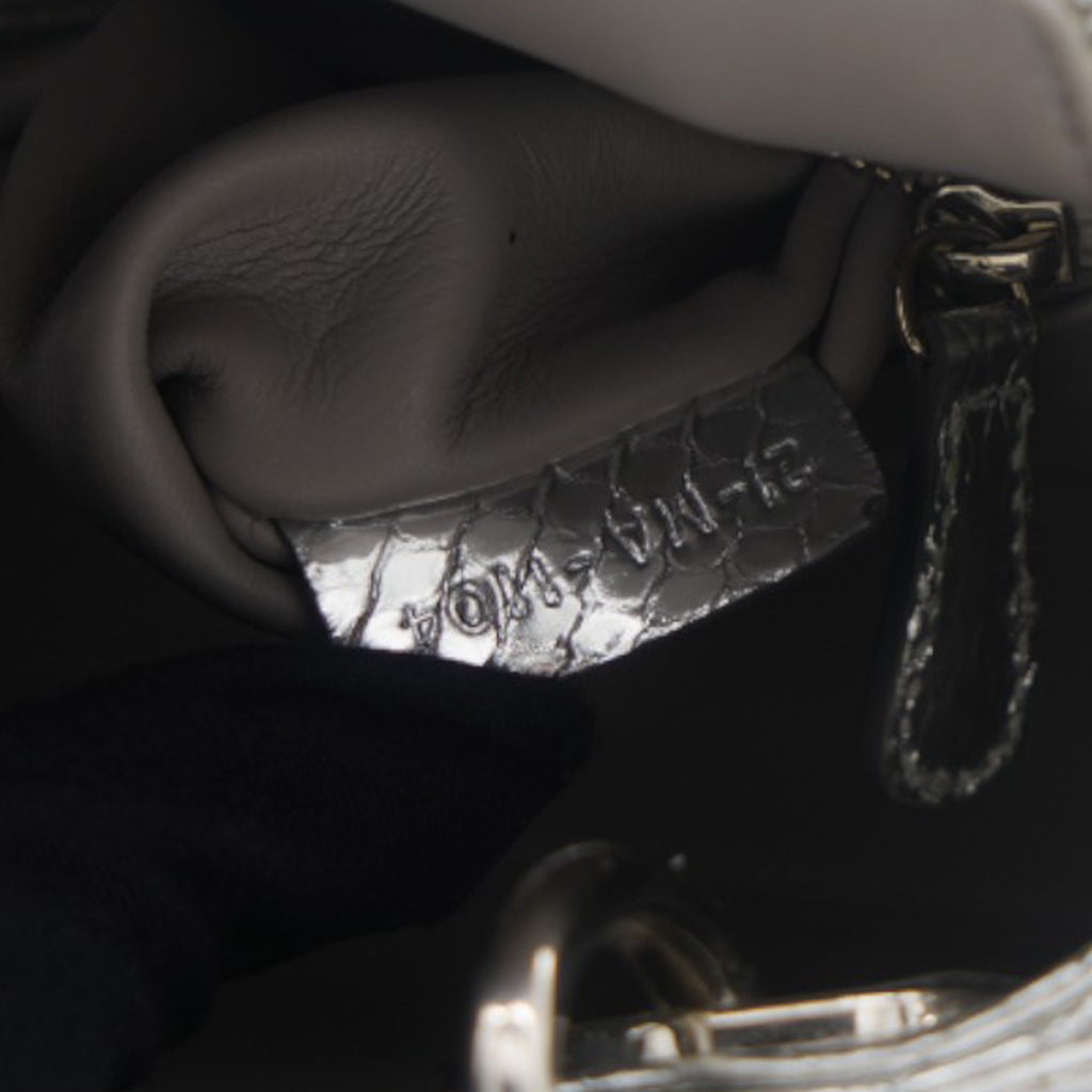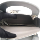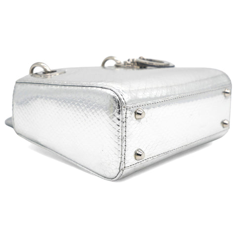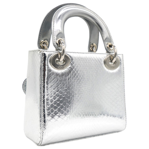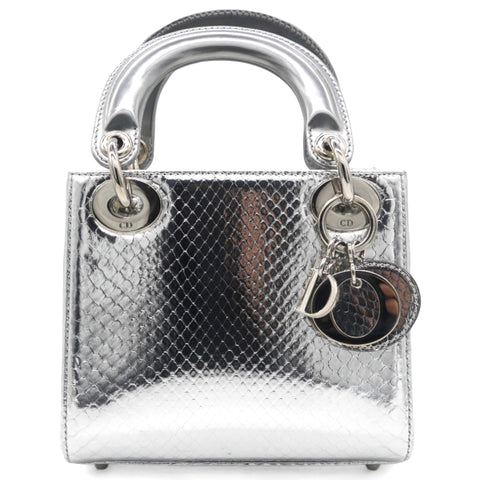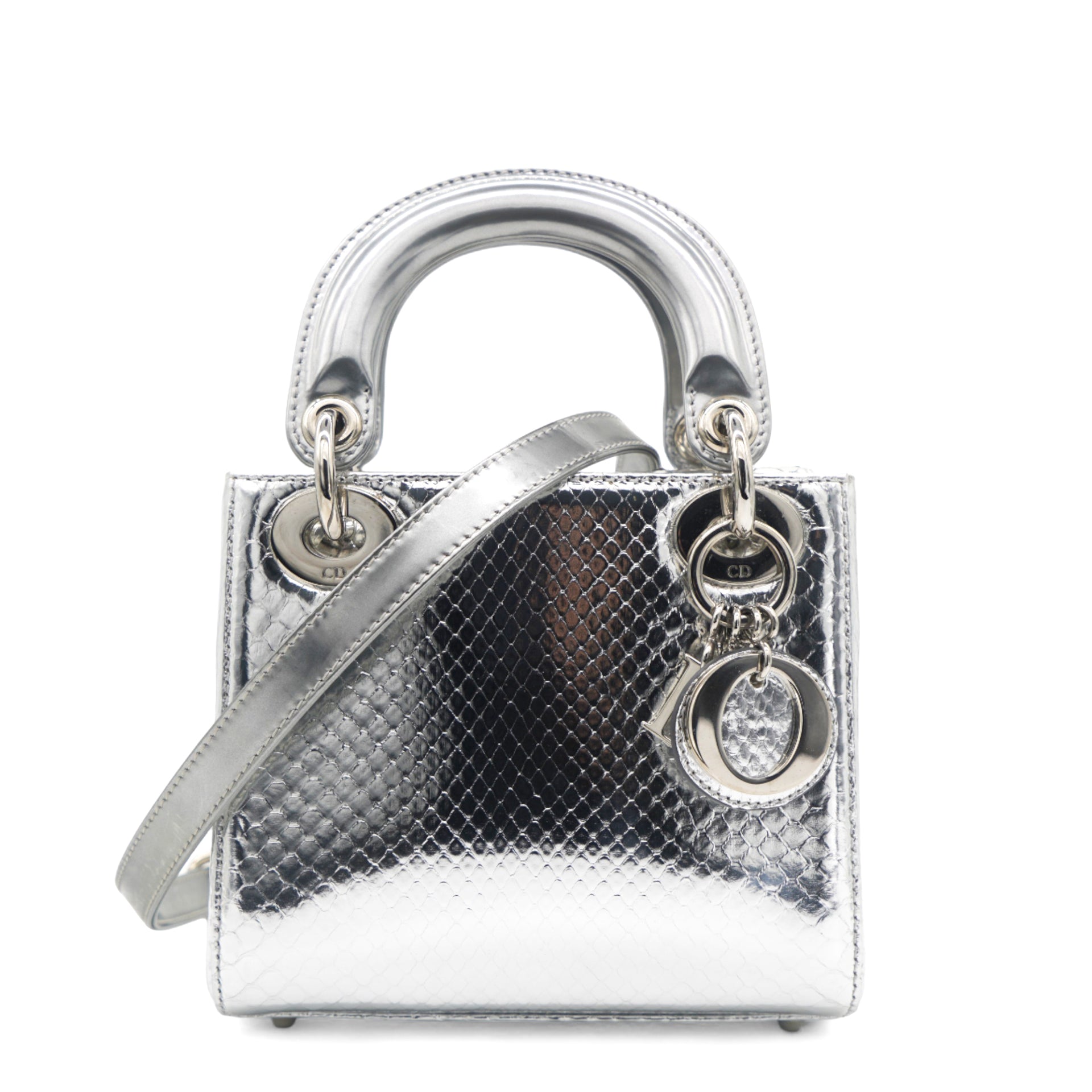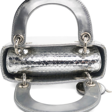 This delightful mini tote is crafted of beautifully textured silver snakeskin with matching leather top handles. The lizard is complimented by polished silver hardware including handle rings, large decorative eyelets and a hanging metal charms. The interior is a matching leather. This is a fabulous bag for just the necessities from Dior