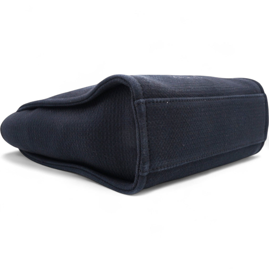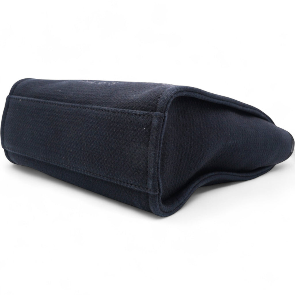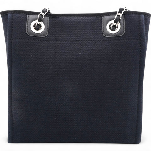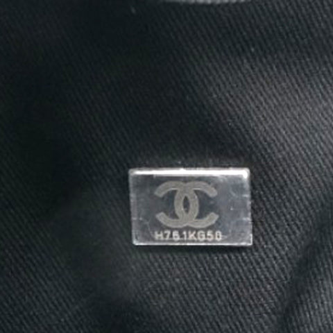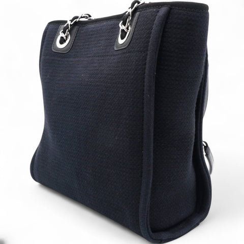 | This stylish handbag is crafted of fine fibers in blue with an embroidered Chanel Rue Cambon Paris logo. It features black rolled leather top handles, black fabric top trim, and black leather threaded light silver chain shoulder straps. The top is open to a black fabric interior with zipper, patch pockets, and a removable pouch. |