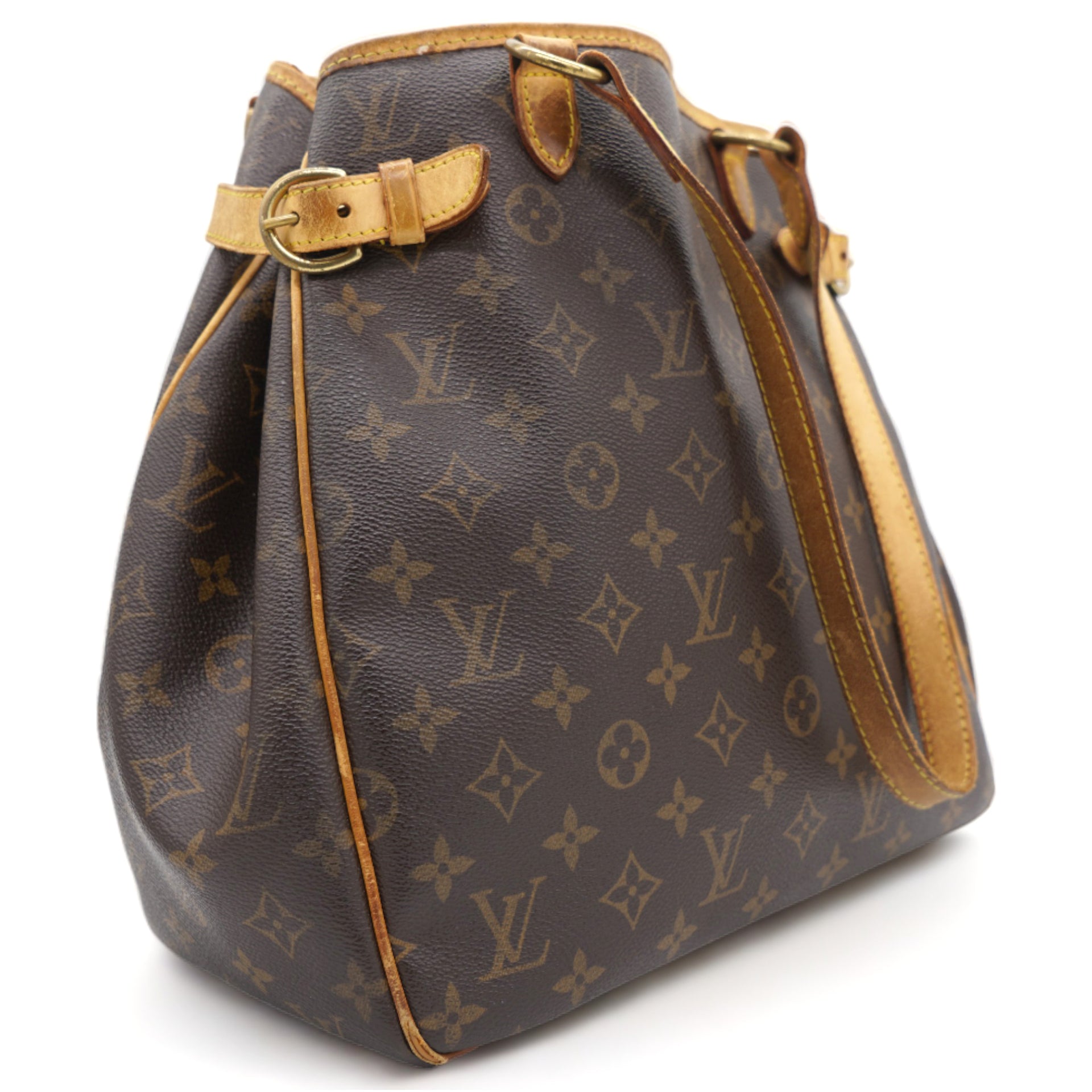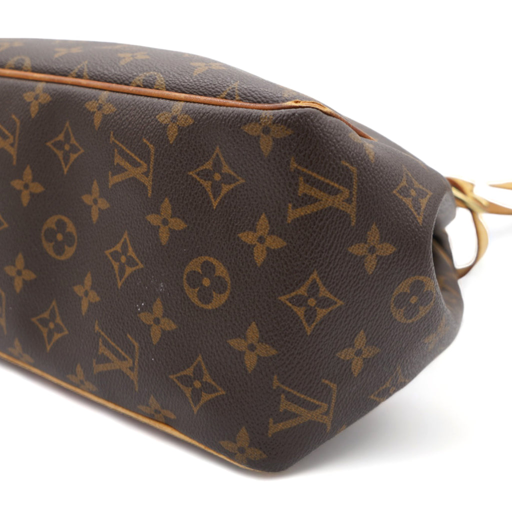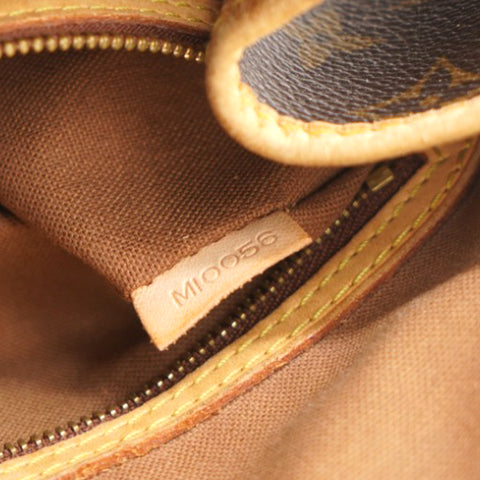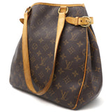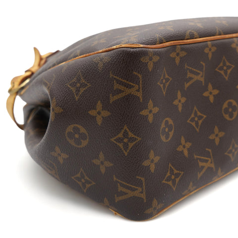 | This shoulder bag is beautifully crafted of classic Louis Vuitton monogram on toile canvas. The bag features signature natural vachetta leather, including side belts and long strap handles. The top is open to a cocoa-colored interior with zipper and patch pockets. |
