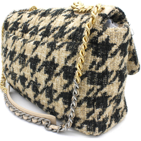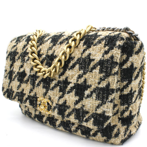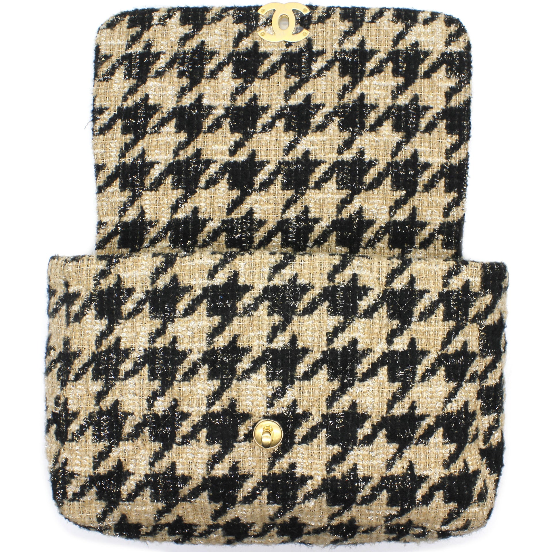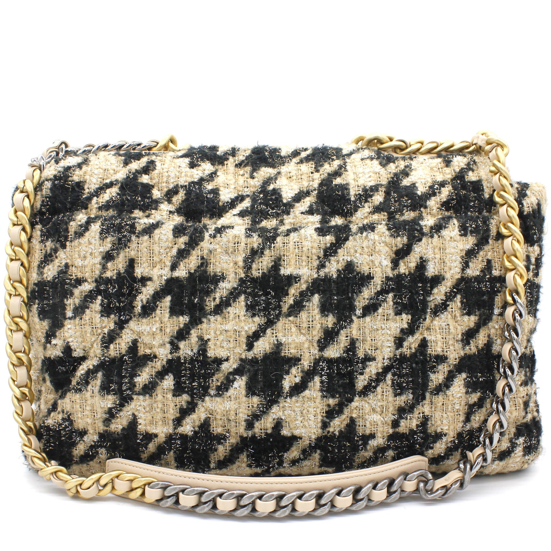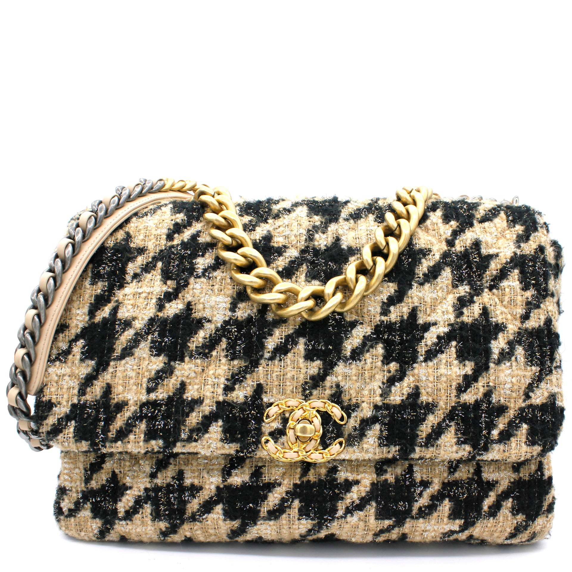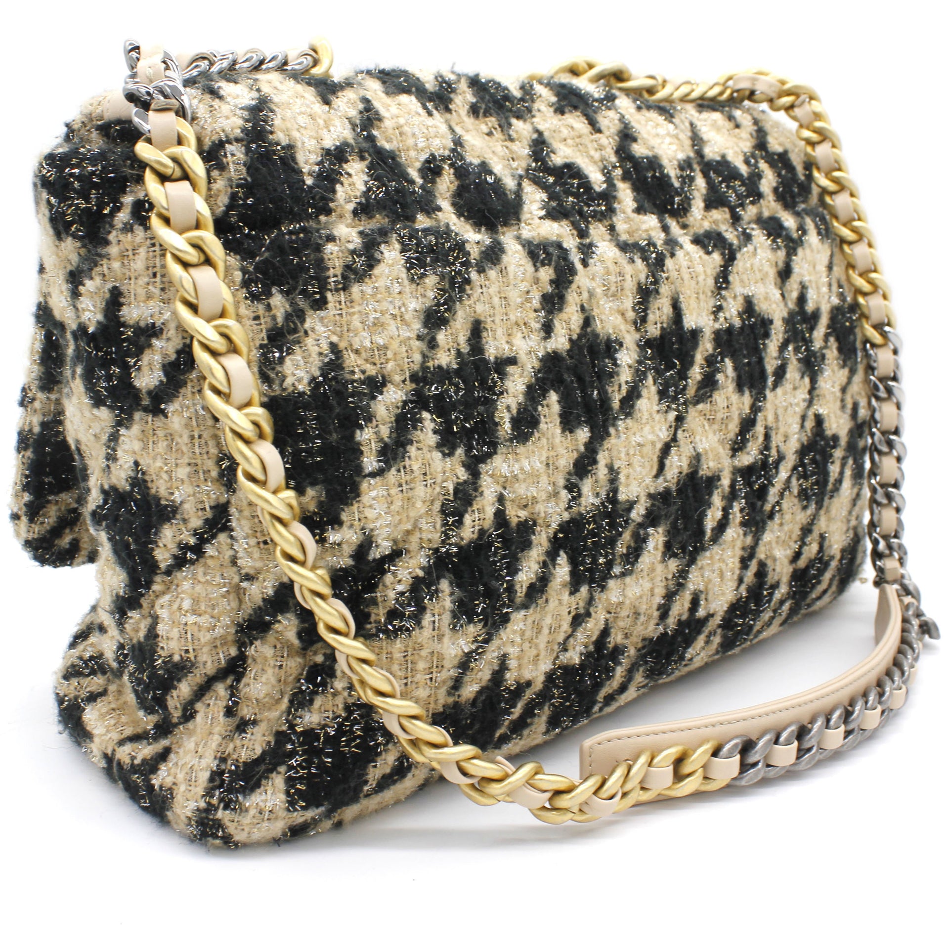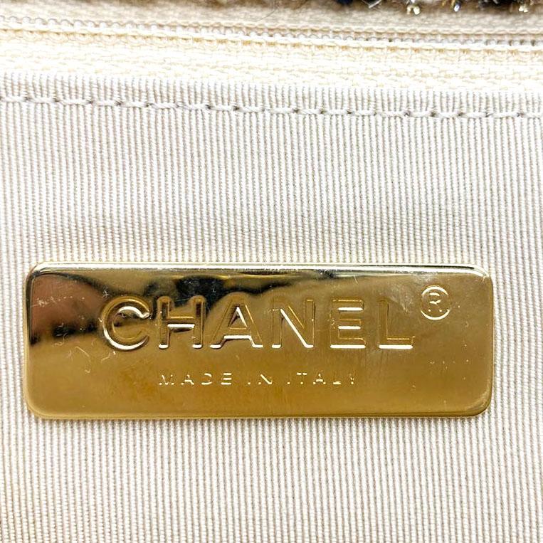 Exterior Material: Brown,Black and white tweed exterior with a chain detail CC turn lock, a leather threaded chain link shoulder strap and a chain handle strap. Interior Material: Beige fabric lining with one main compartment and one zipped pocket. Accessories: FULL SET: Receipt; Authentic Card; Dust Bag; Box Bought Year: 2019 |