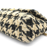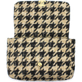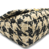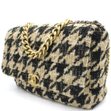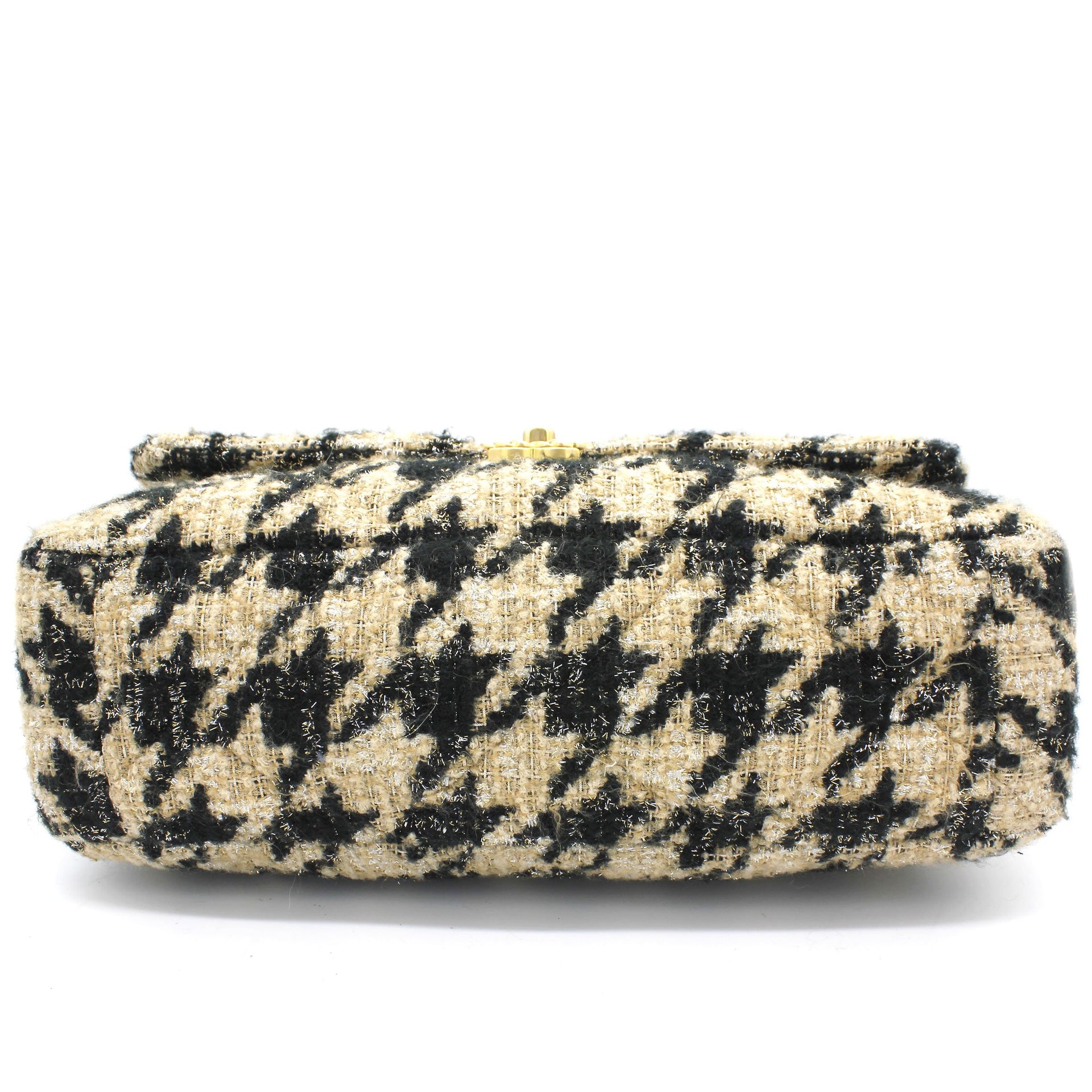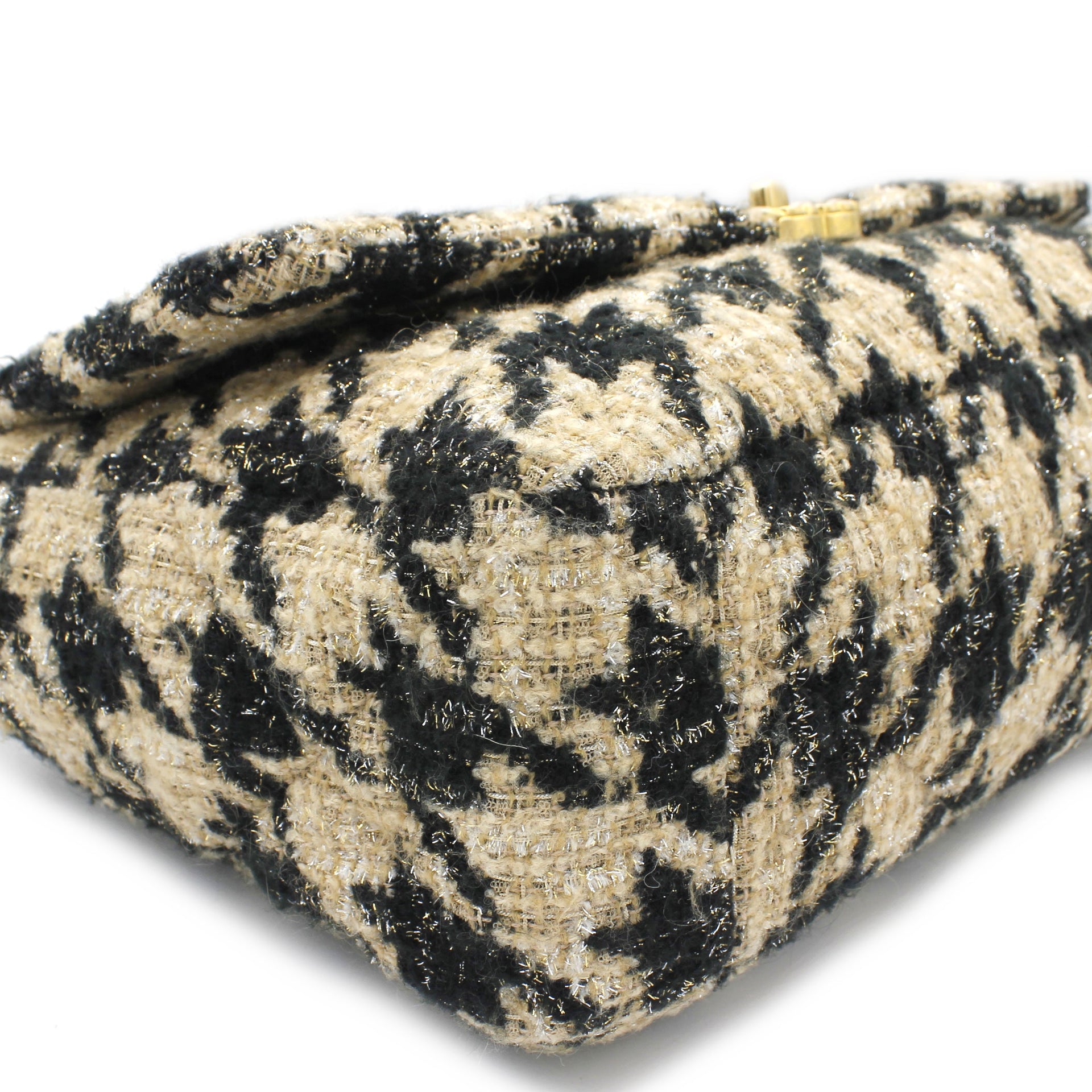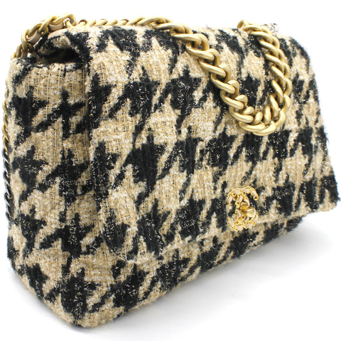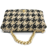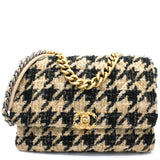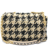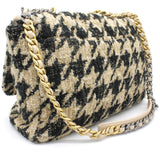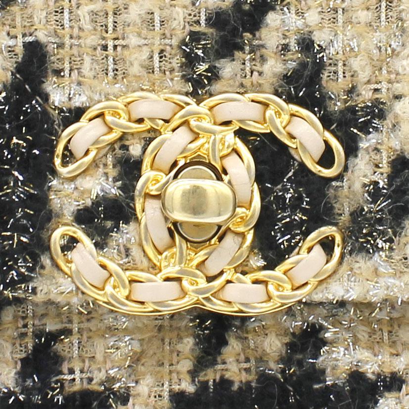 | This pillowy soft shoulder bag is crafted of oversized Brown,Black and white tweed . The refined bag features a chain detail CC turn lock on the flap, a magnetic snap pocket at the rear, and a leather threaded aged gold, ruthenium, and dark silver chain link shoulder strap with a leather shoulder pad. The front flap opens to a beige fabric interior with a zipper pocket. |