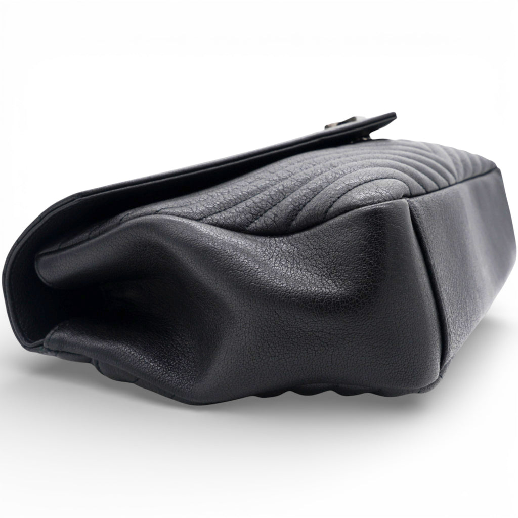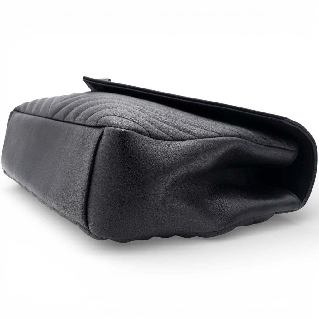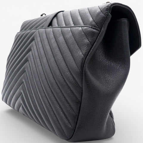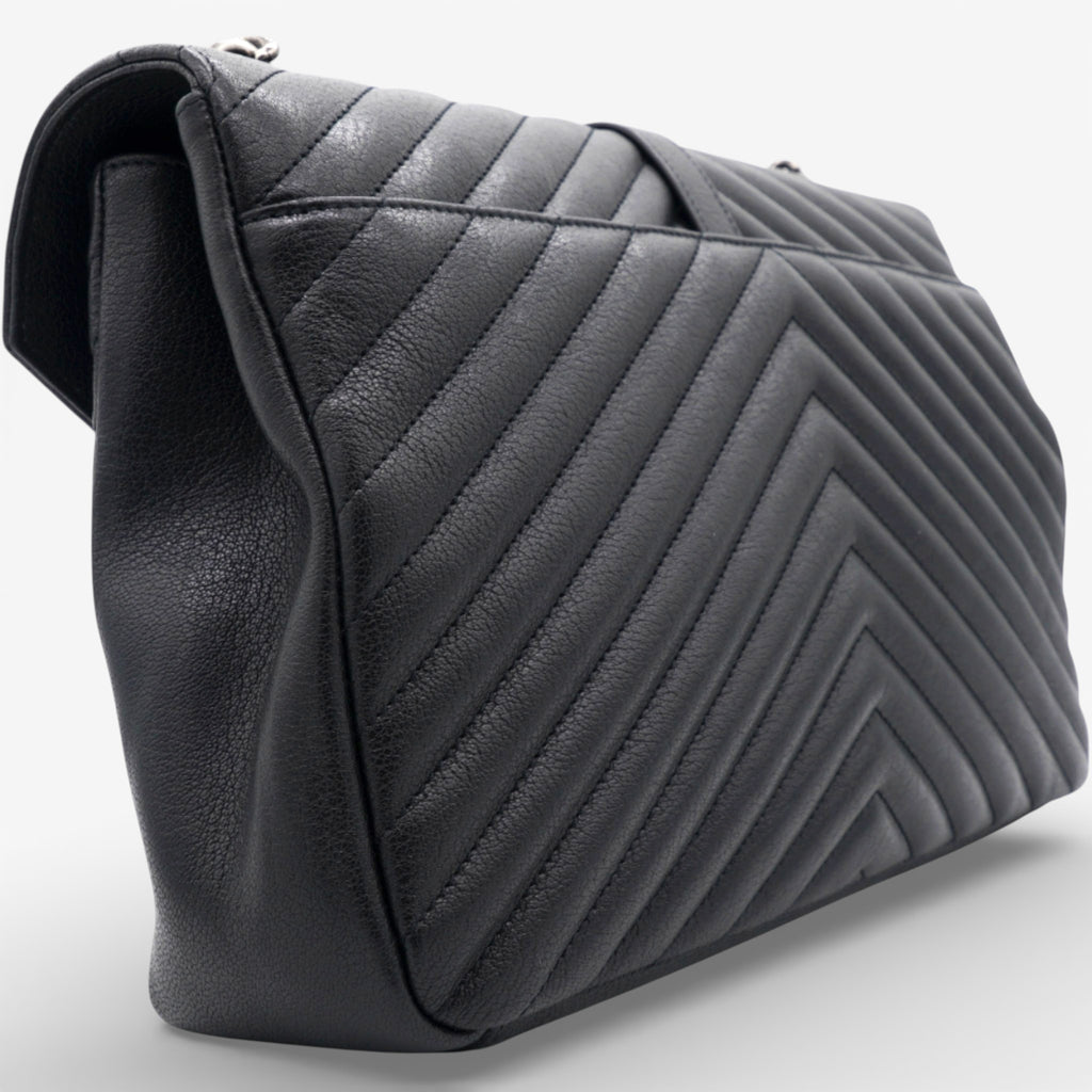 | This elegant bag is crafted of black chevron-quilted sheepskin leather. The bag features a rear patch pocket, an silver chain-link shoulder strap with a leather shoulder pad, a leather top handle, and a front flap with a prominent YSL monogram detail. This opens to a partitioned black fabric and leather interior with a patch pocket and a central zipper compartment. |