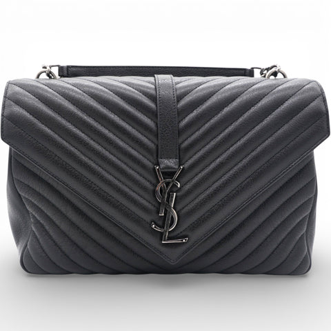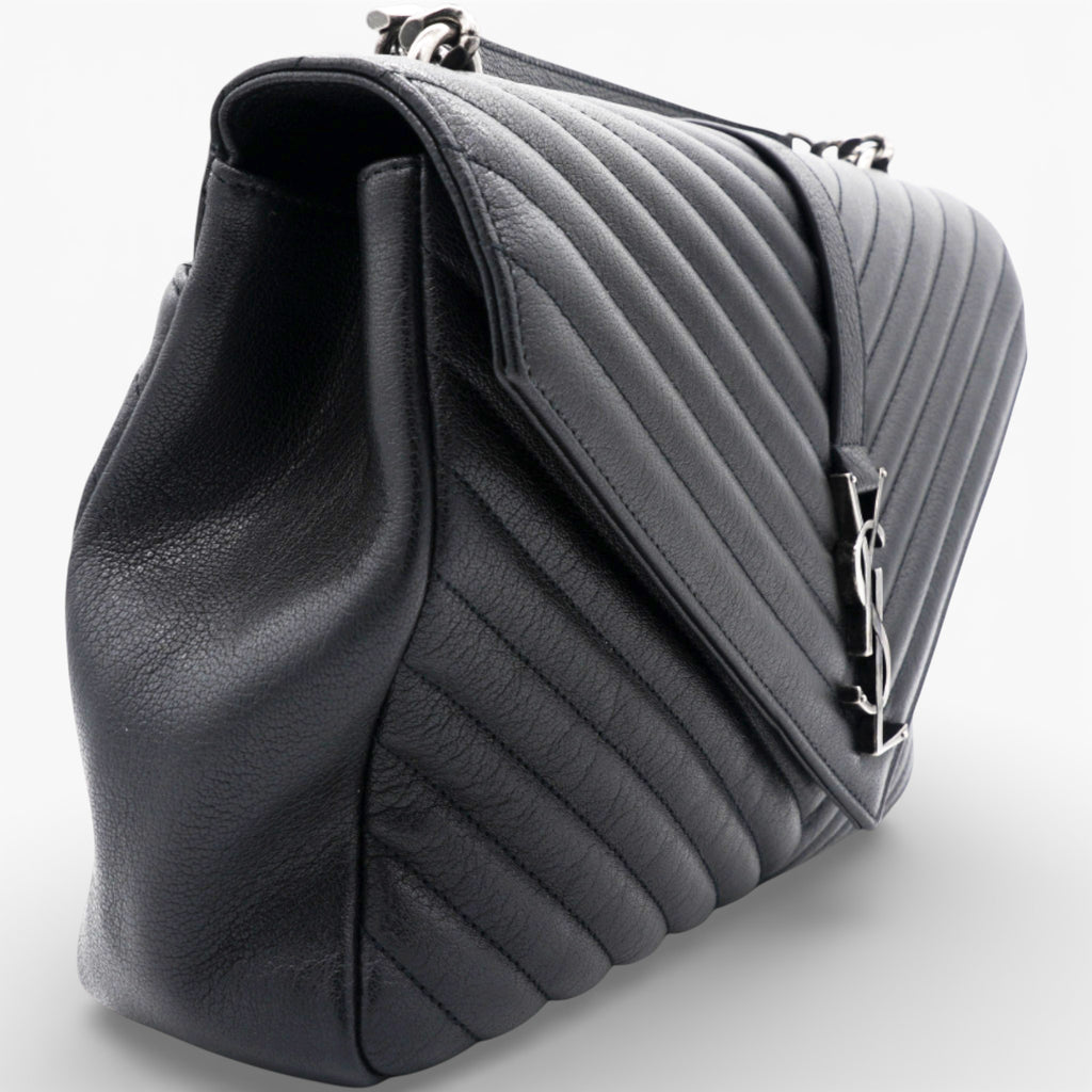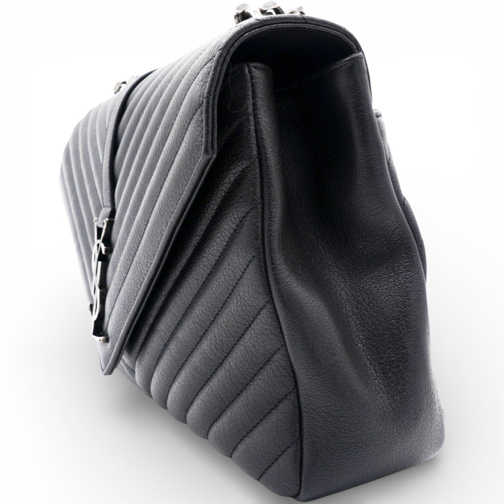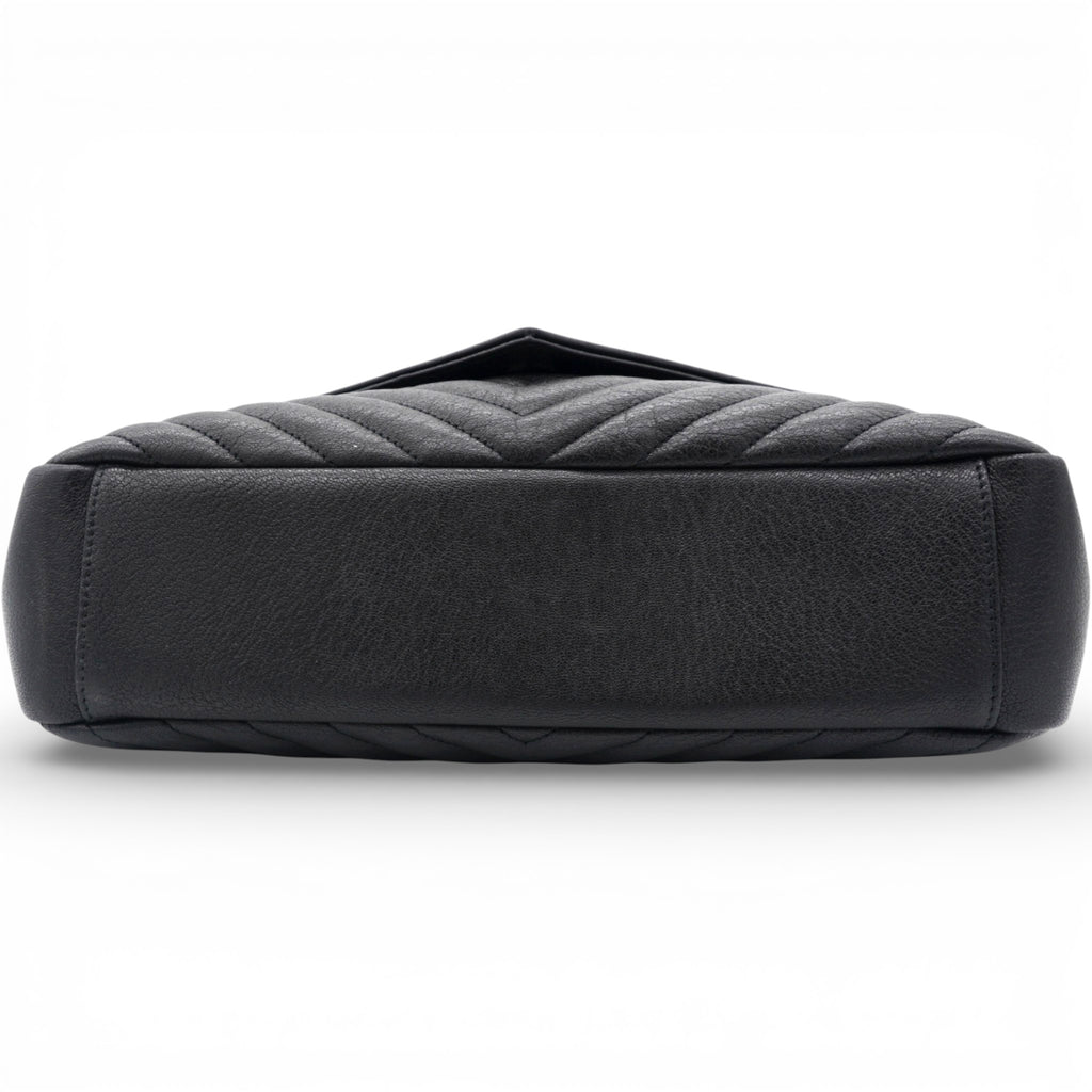 | This elegant bag is crafted of black chevron-quilted sheepskin leather. The bag features a rear patch pocket, an silver chain-link shoulder strap with a leather shoulder pad, a leather top handle, and a front flap with a prominent YSL monogram detail. This opens to a partitioned black fabric and leather interior with a patch pocket and a central zipper compartment. |