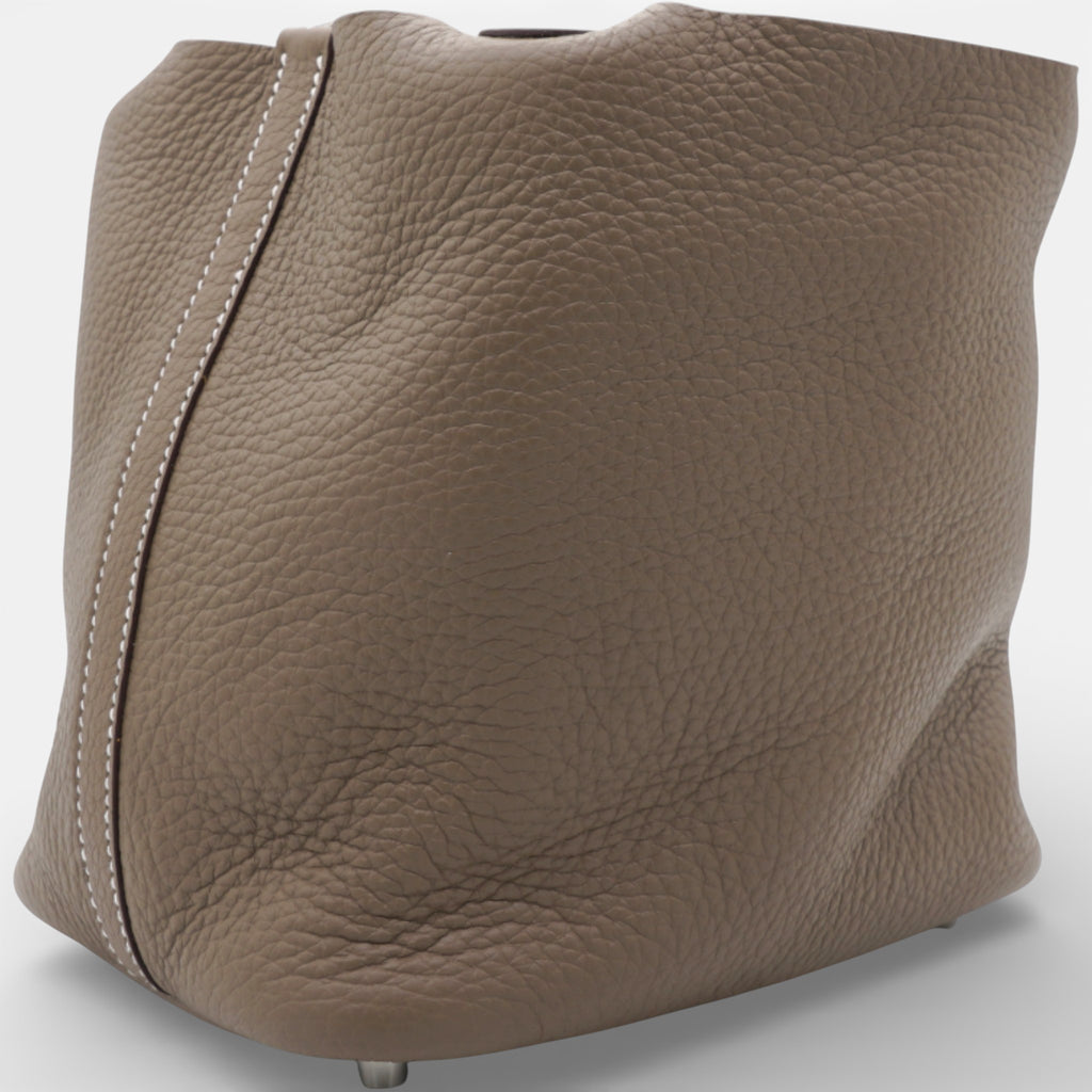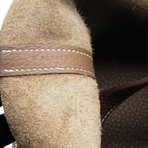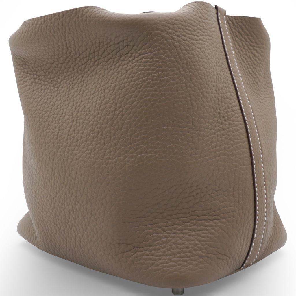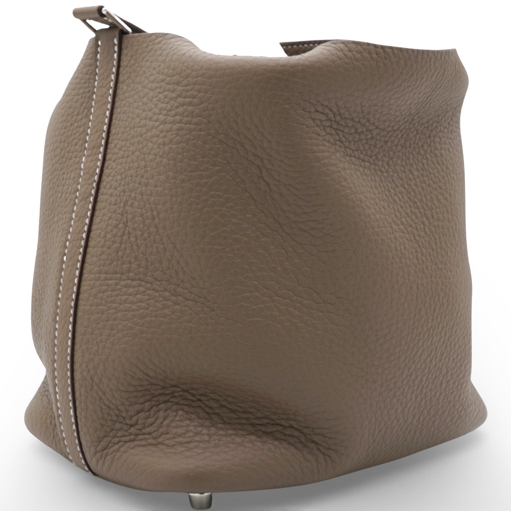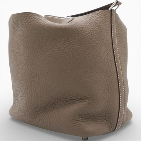 | This stunning tote is crafted of luxuriously soft Clemence calfskin leather in taupe, in a relaxed bucket style, with polished palladium hardware. The bag features a unique one-piece reinforced design with leather top handles and a thin cross-over strap. The top is open to a matching suede interior. |