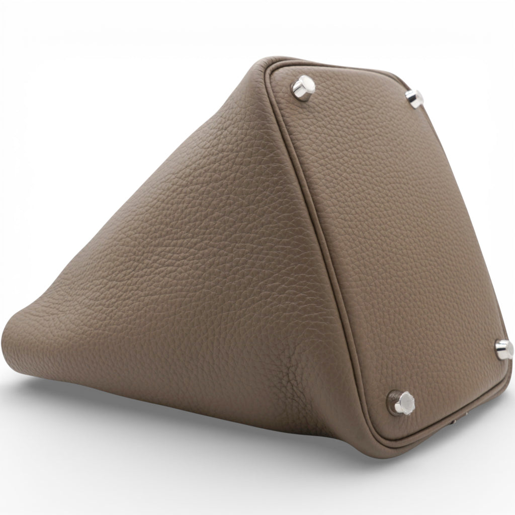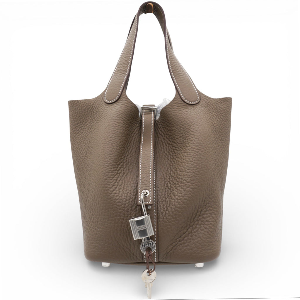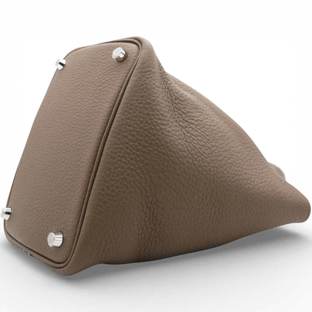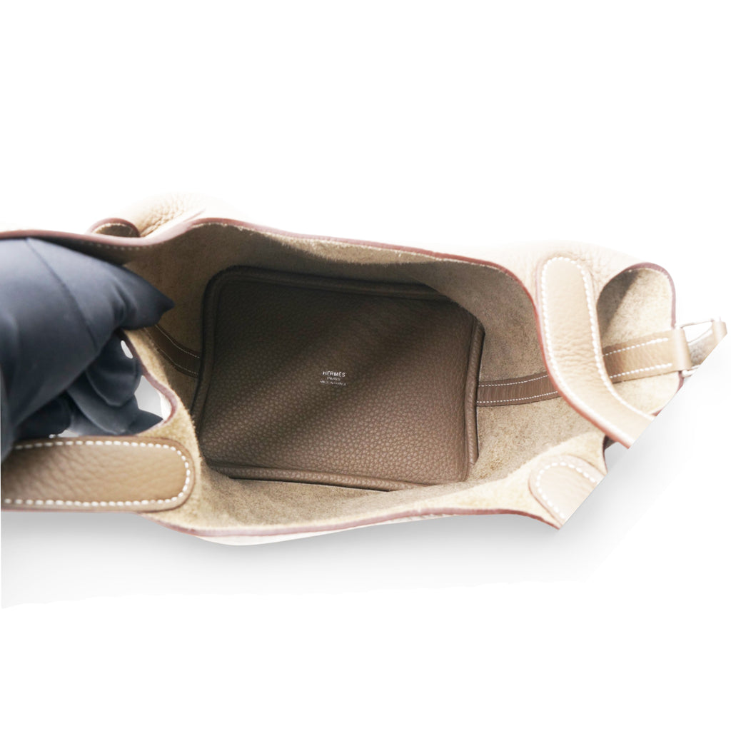 | This stunning tote is crafted of luxuriously soft Clemence calfskin leather in taupe, in a relaxed bucket style, with polished palladium hardware. The bag features a unique one-piece reinforced design with leather top handles and a thin cross-over strap. The top is open to a matching suede interior. |