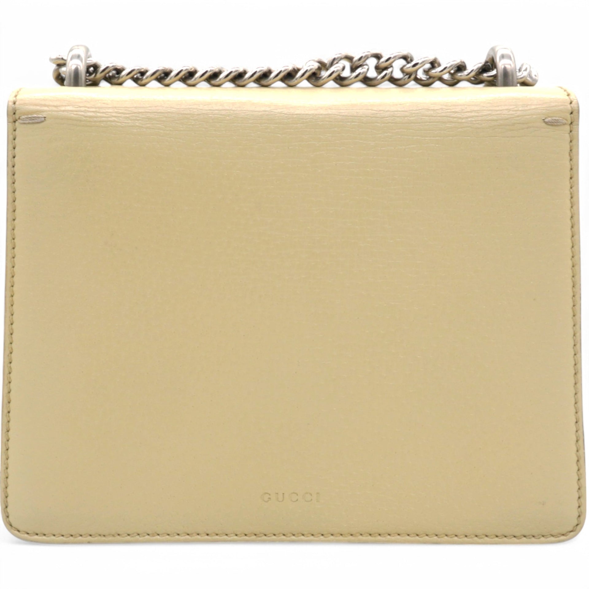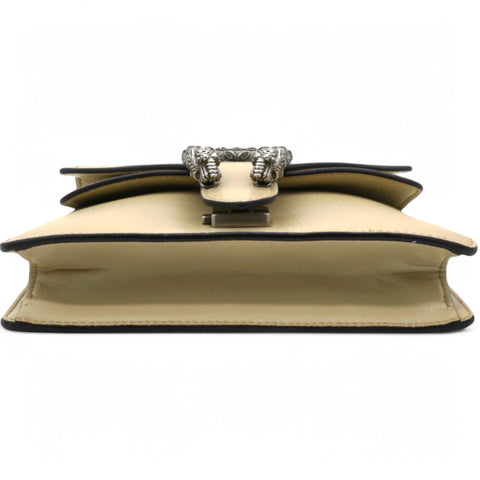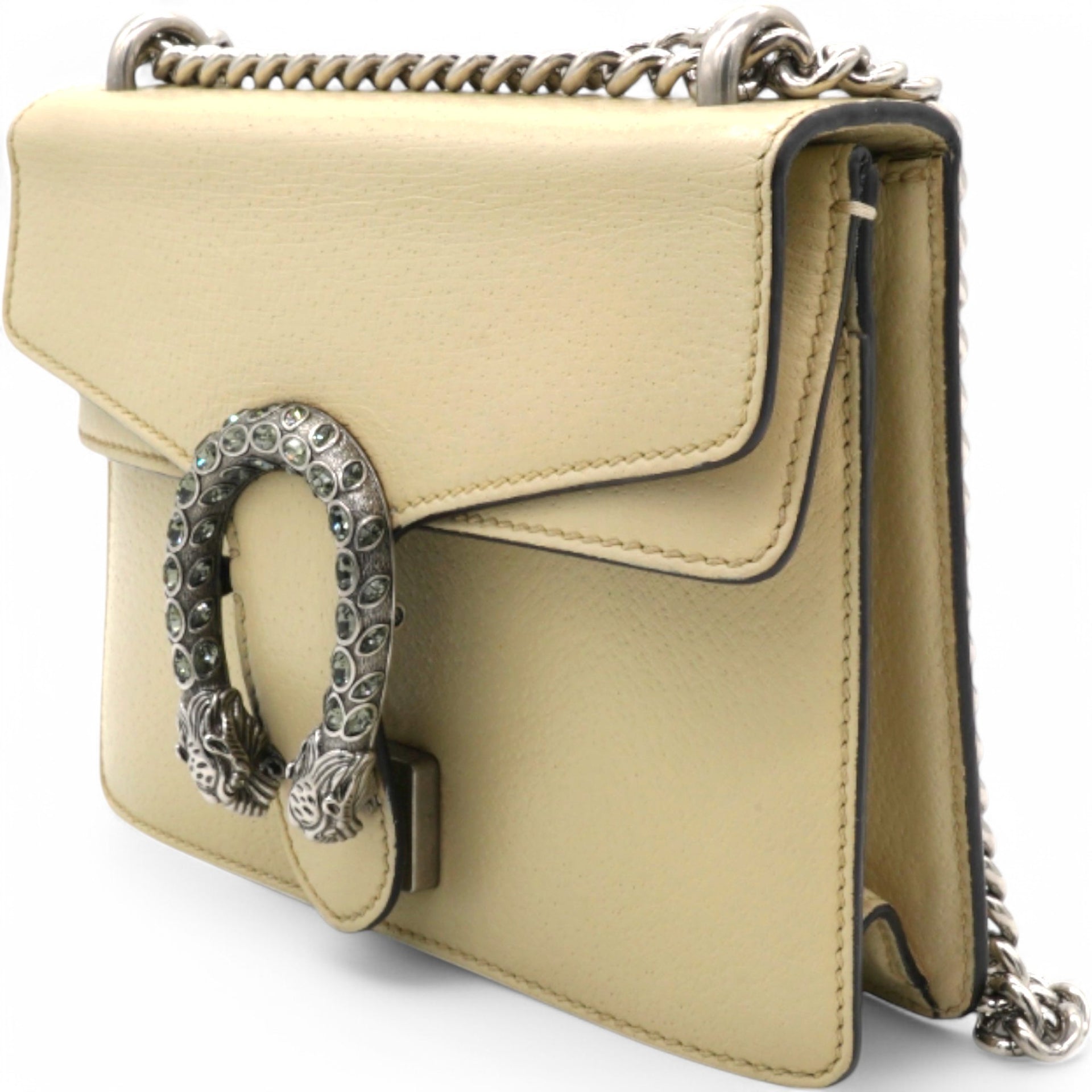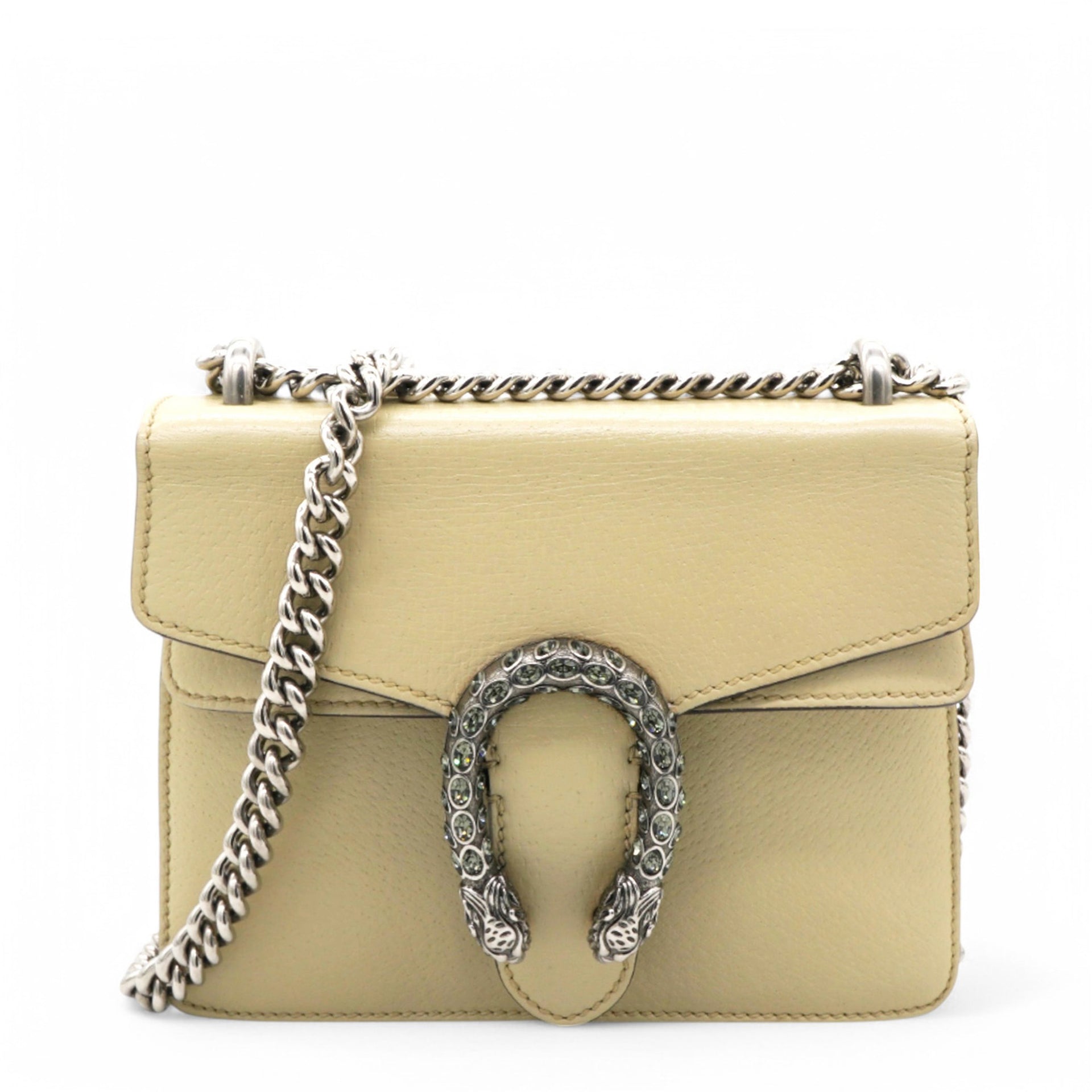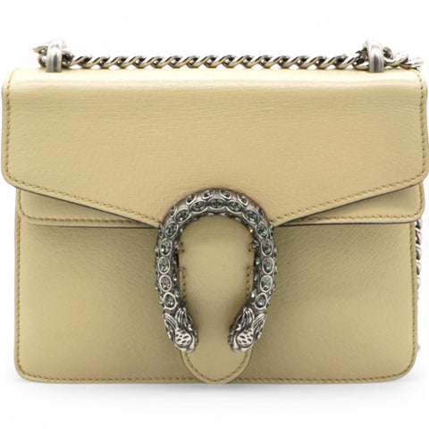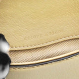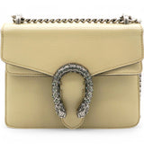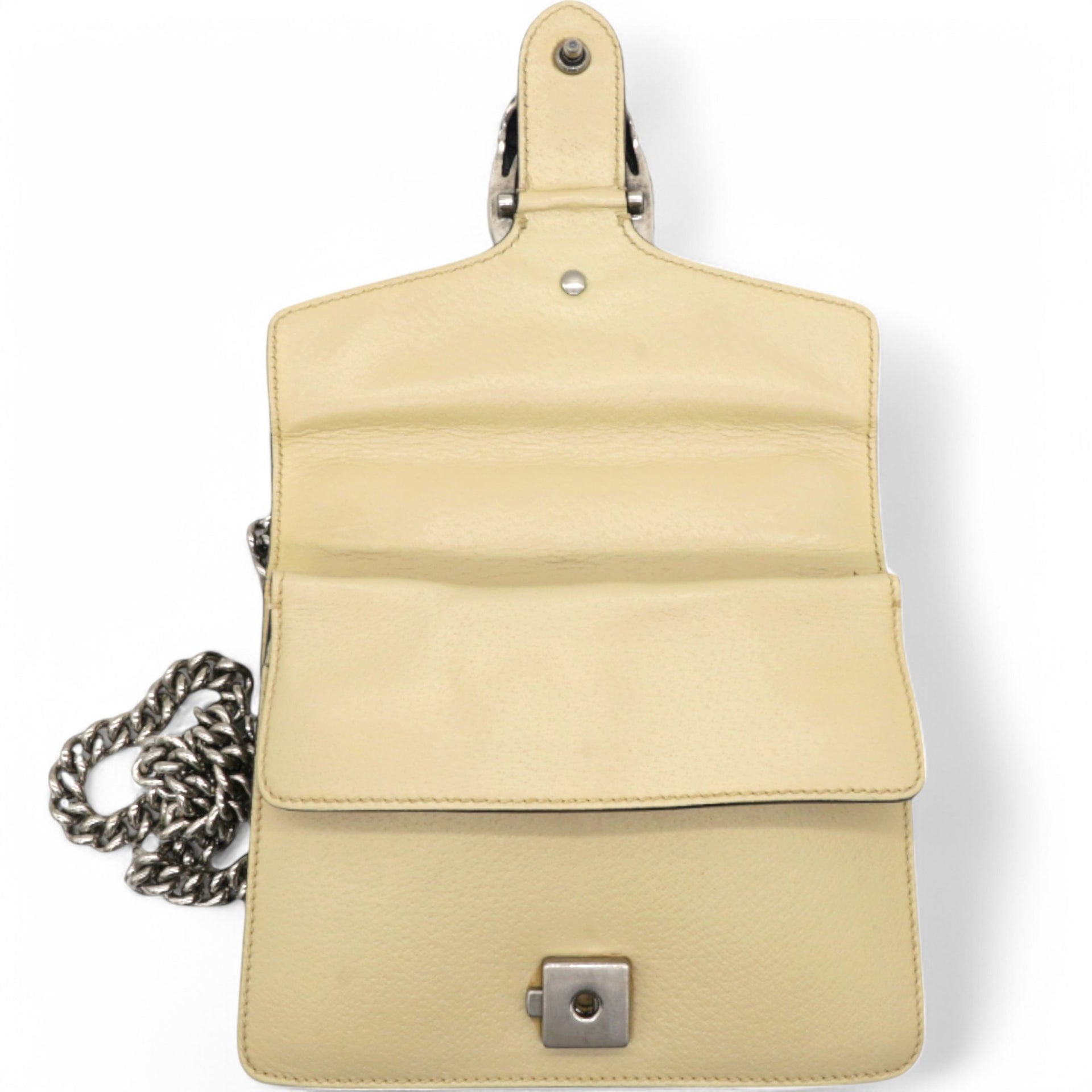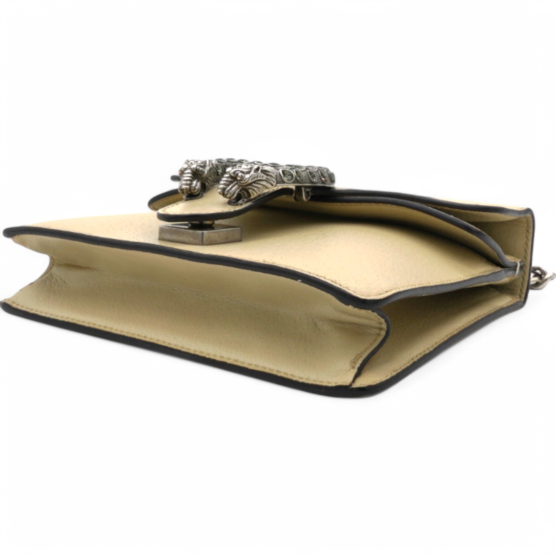 | This stylish bag is crafted of leather in beige. This shoulder bag features an aged silver chain shoulder strap, and a textured horseshoe closure with lion heads at the end. This opens to a beige fabric interior with a central zipper pocket. |