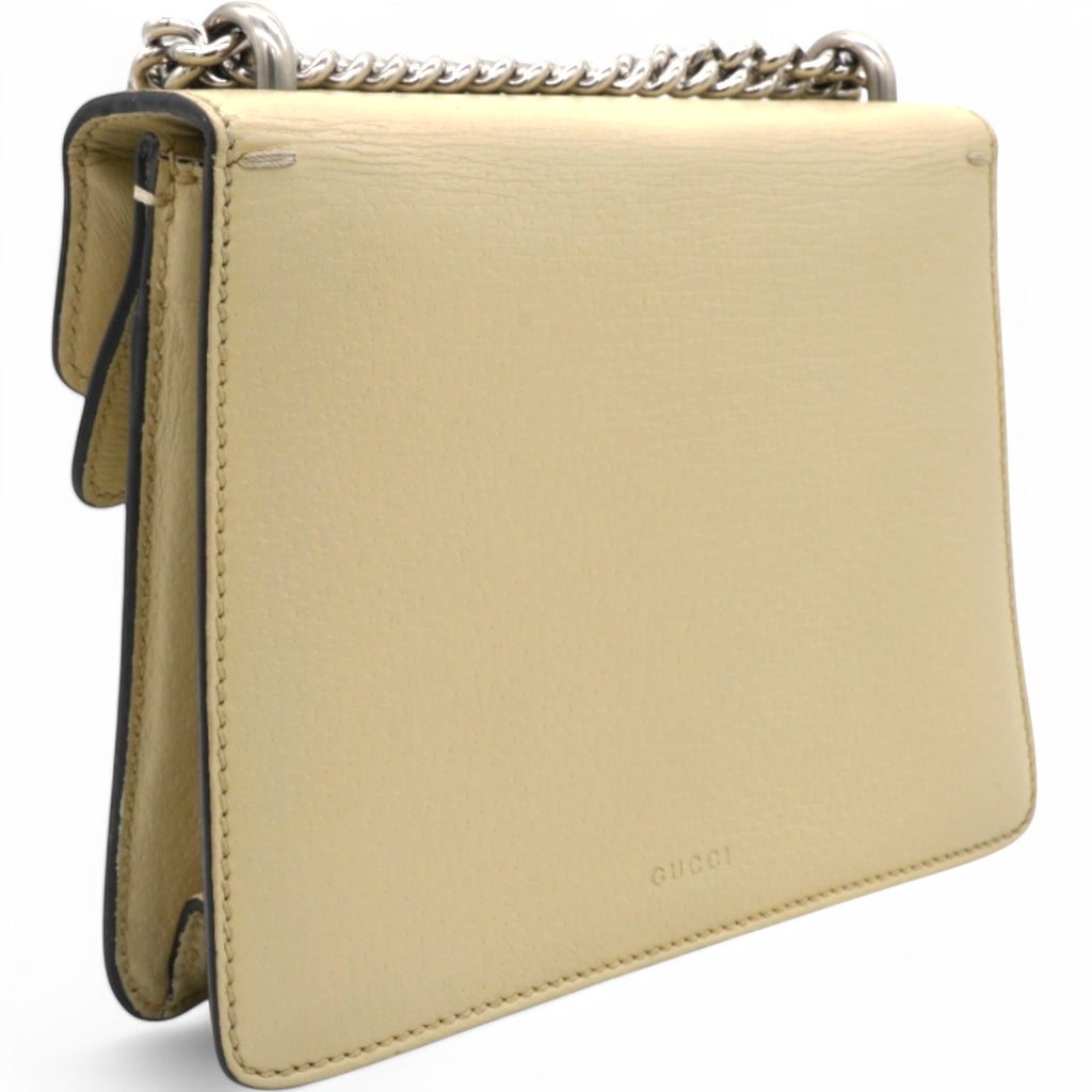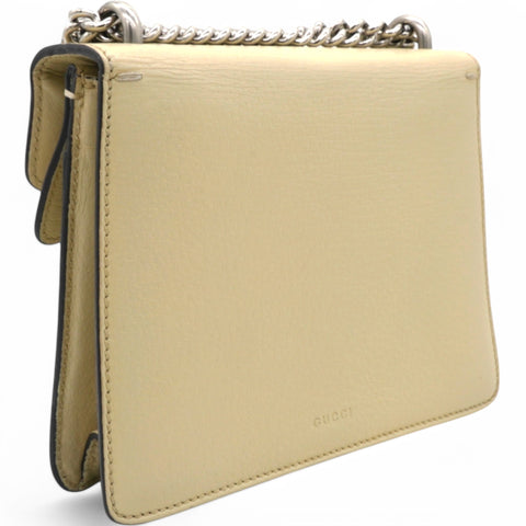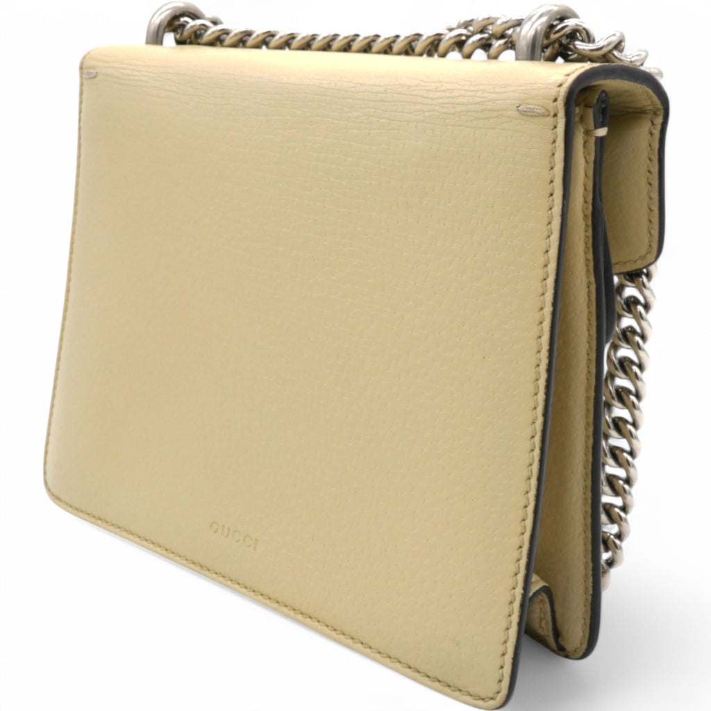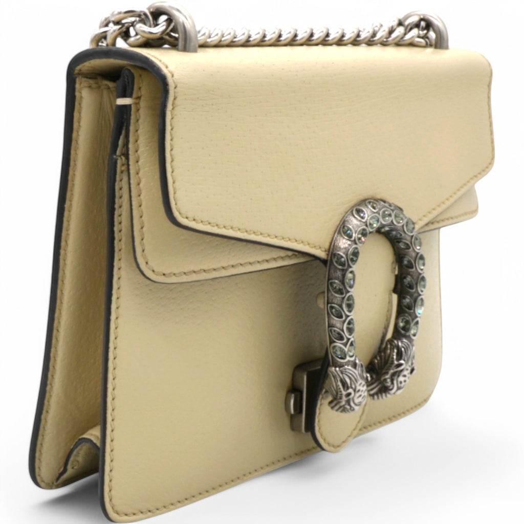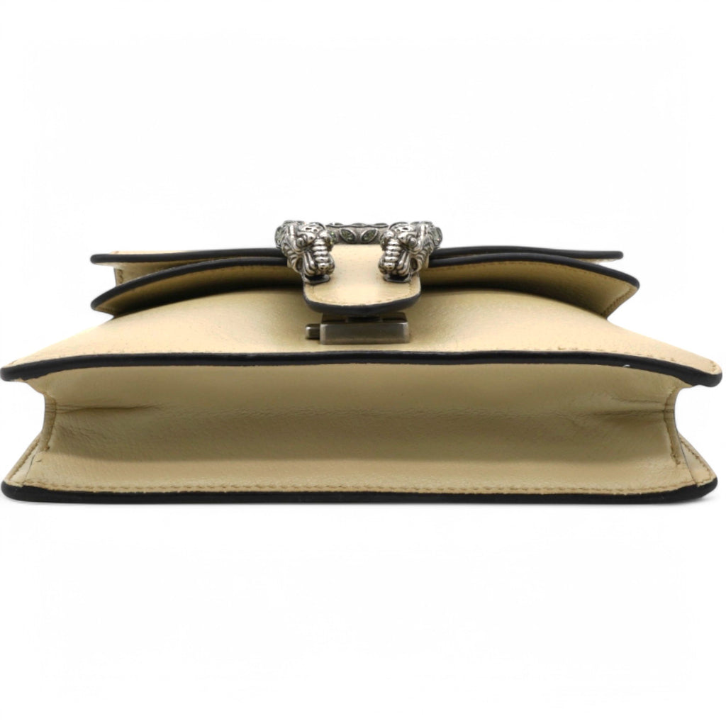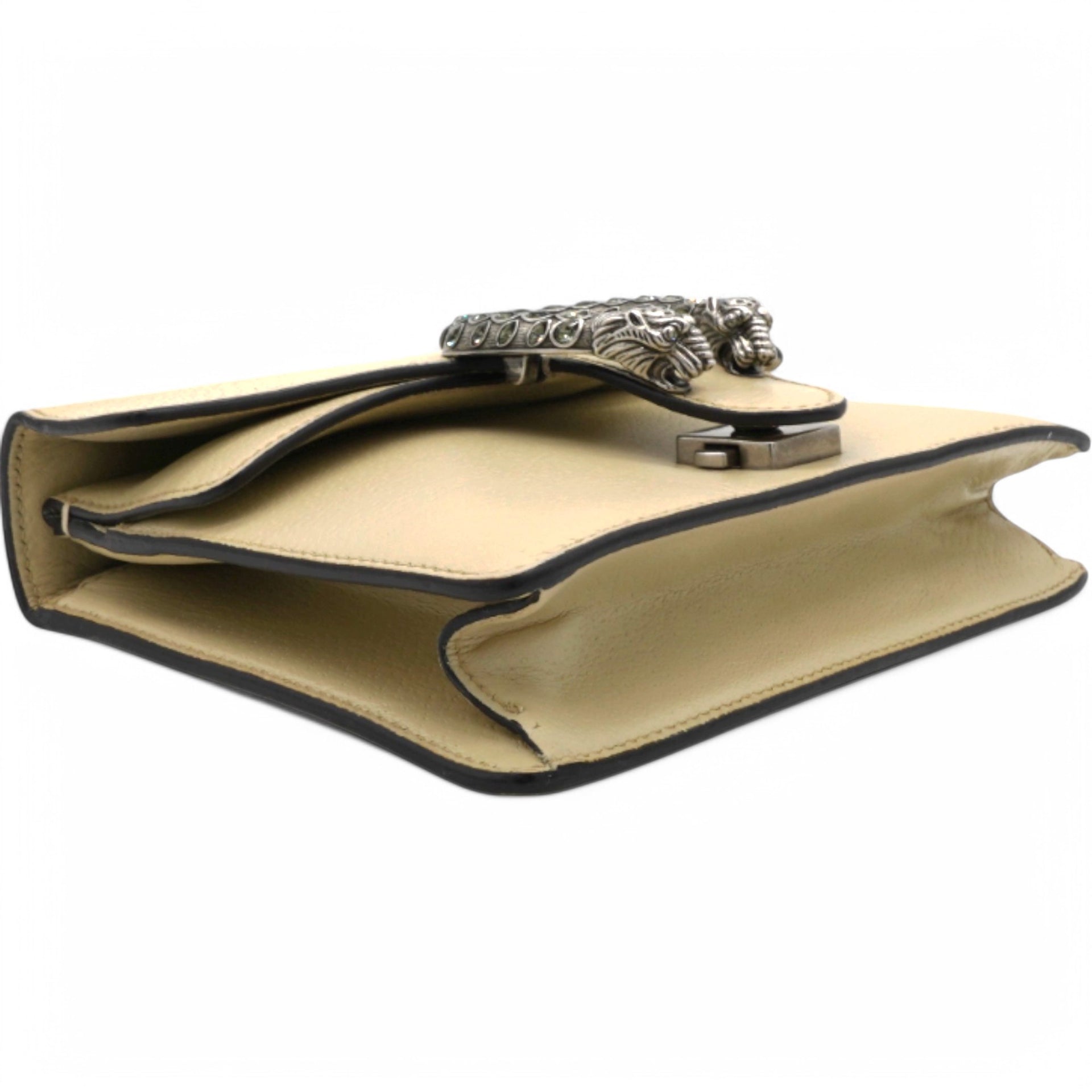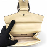 | This stylish bag is crafted of leather in beige. This shoulder bag features an aged silver chain shoulder strap, and a textured horseshoe closure with lion heads at the end. This opens to a beige fabric interior with a central zipper pocket. |