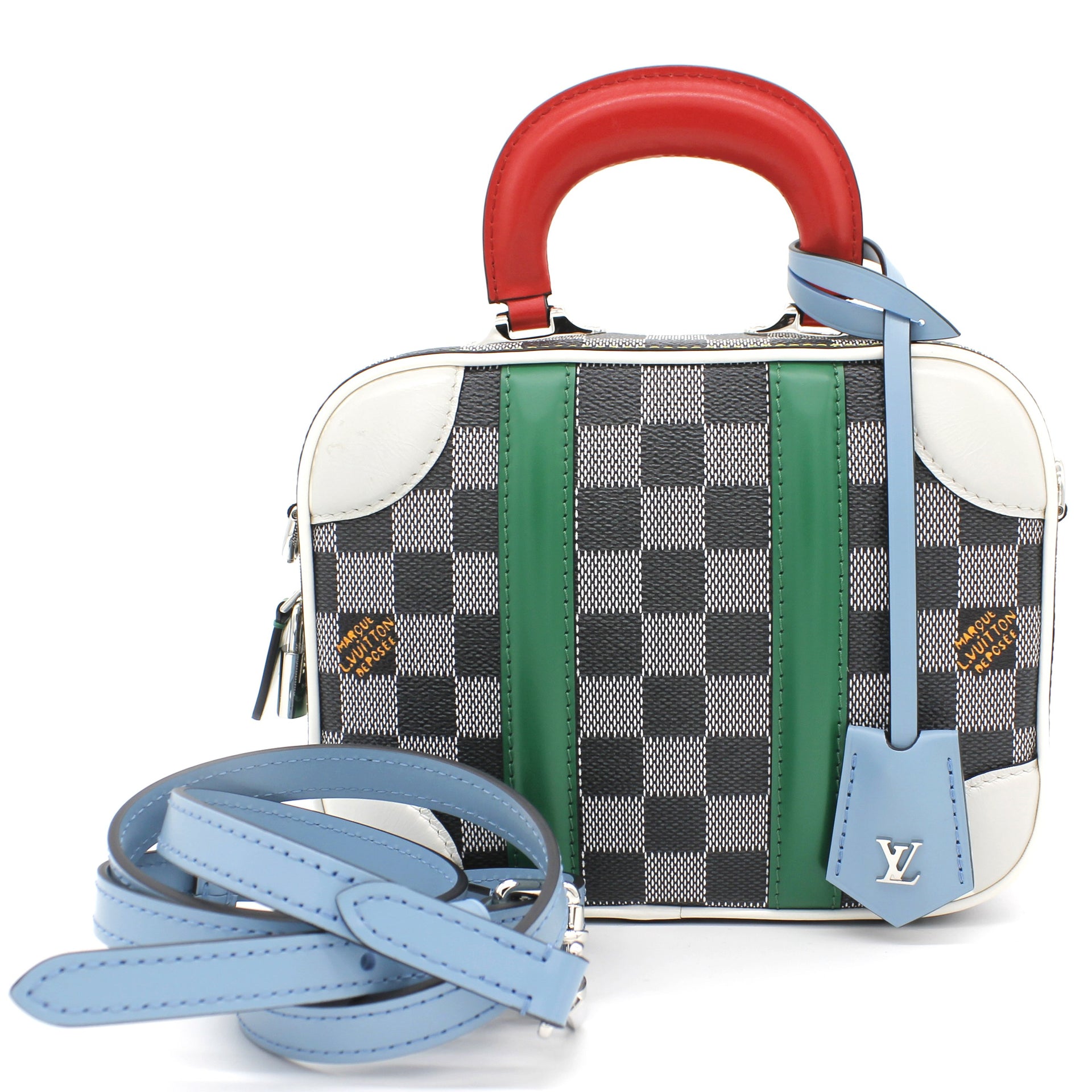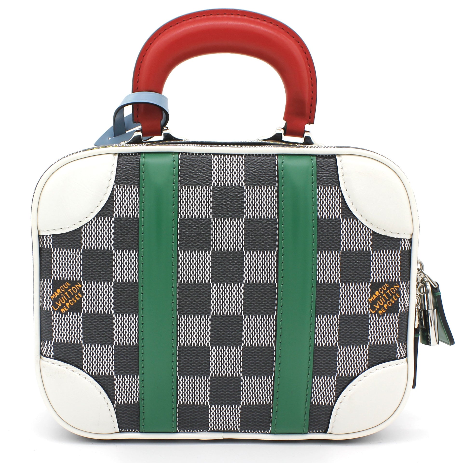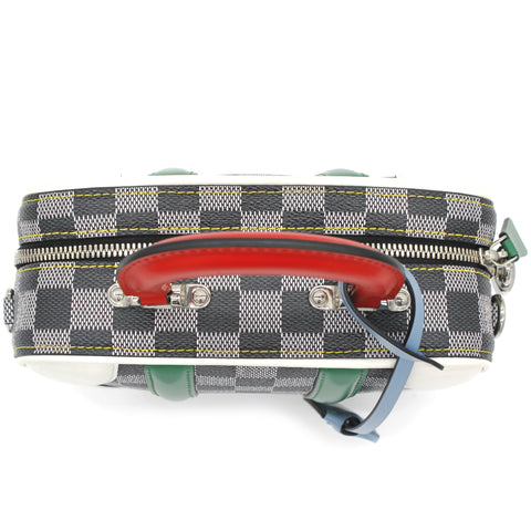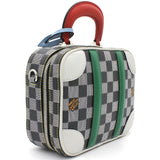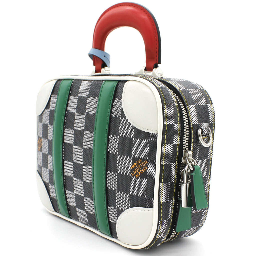 | Nicolas Ghesquière’s new black-and-white reinterpretation of classic Damier canvas is complemented by colorful calf-leather details on this Valisette BB handbag. Inspired by the House’s travel heritage, this structured bag evokes the suitcases created by the House in the middle of the last century. The top handle and removeable strap offer multiple carry options. |
