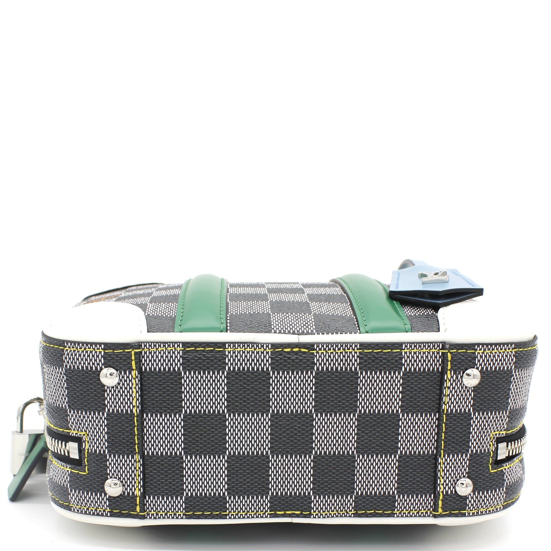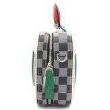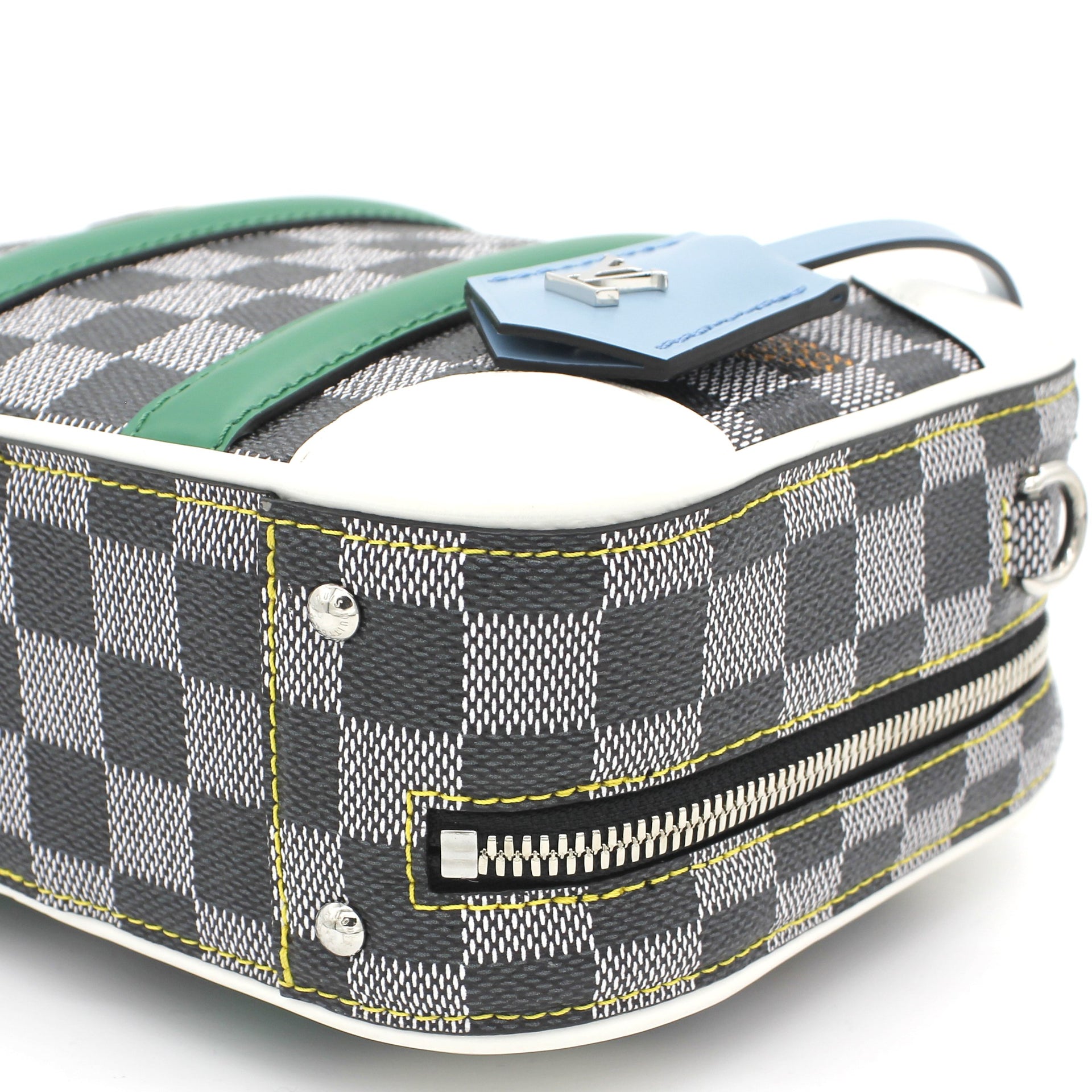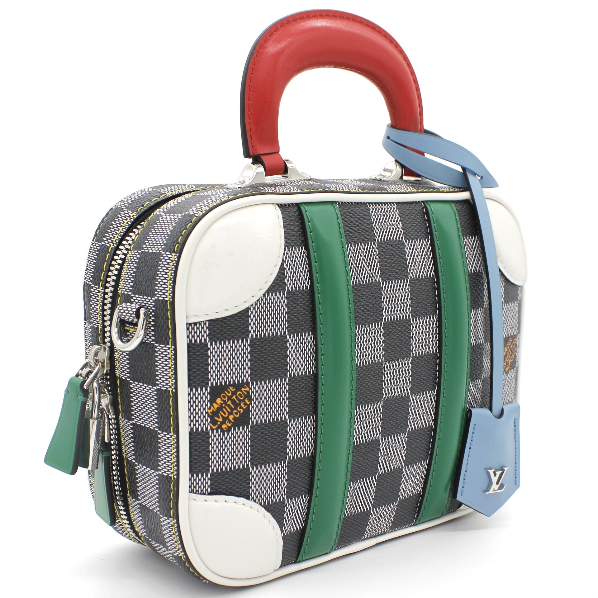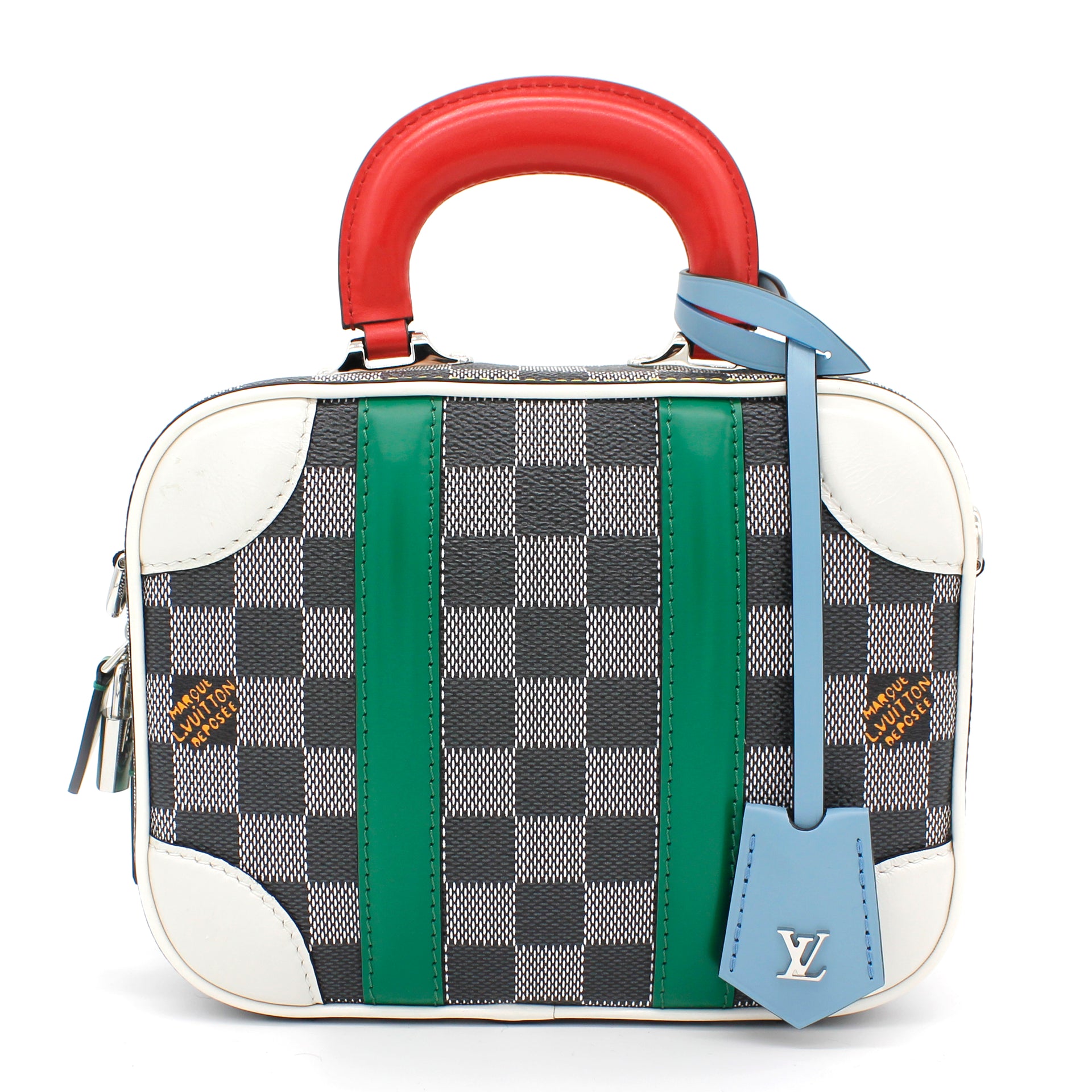 | Nicolas Ghesquière’s new black-and-white reinterpretation of classic Damier canvas is complemented by colorful calf-leather details on this Valisette BB handbag. Inspired by the House’s travel heritage, this structured bag evokes the suitcases created by the House in the middle of the last century. The top handle and removeable strap offer multiple carry options. |