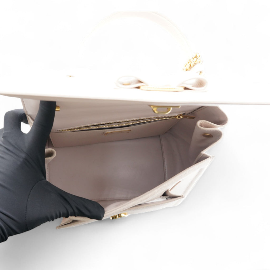 | This chic shoulder bag is finely crafted of leather in pink. The bag features a leather top handle, a gold chain shoulder strap with a leather shoulder pad, and a Ferragamo bow snap closure on the front flap. This opens to a leather interior with a flat pocket. |
