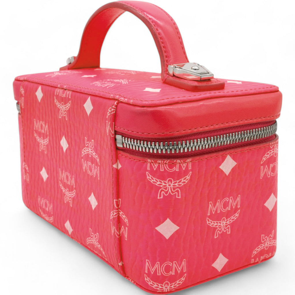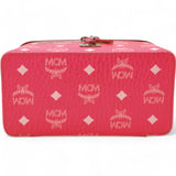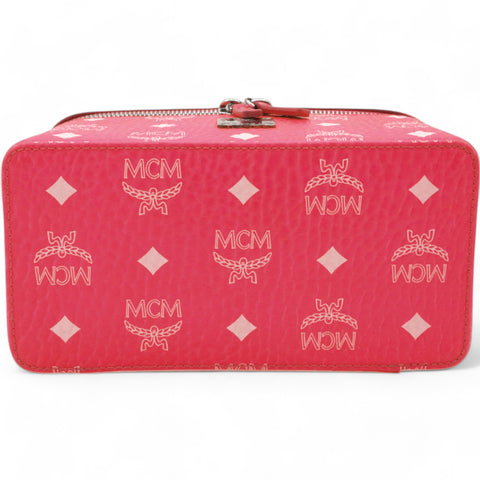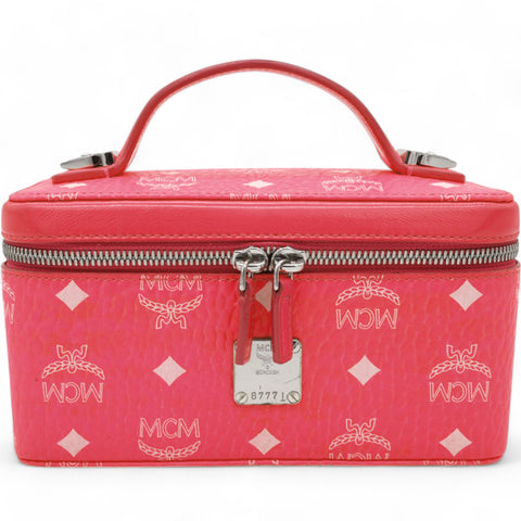 | This handy travel bag is crafted of traditional MCM monogram visetos coated canvas in fluorescent pink. This case features hot pink calfskin trim, a top handle and an optional adjustable shoulder strap. The polished silver wrap-around zipper opens to a brown microfiber interior with an elastic pocket. |