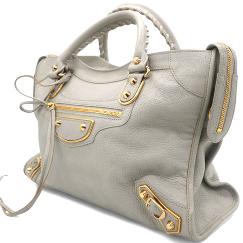 | This stylish tote is crafted of richly textured chèvre goatskin leather in gray. The bag features hand stitched rolled leather top handles, an optional cross body shoulder strap, an exterior zipper pocket for the hanging mirror, and polished gold hardware. The top zipper opens to a black fabric interior with a zipper pocket. This is a perfect everyday bag, with the distinctive style of Balenciaga |