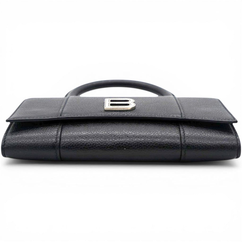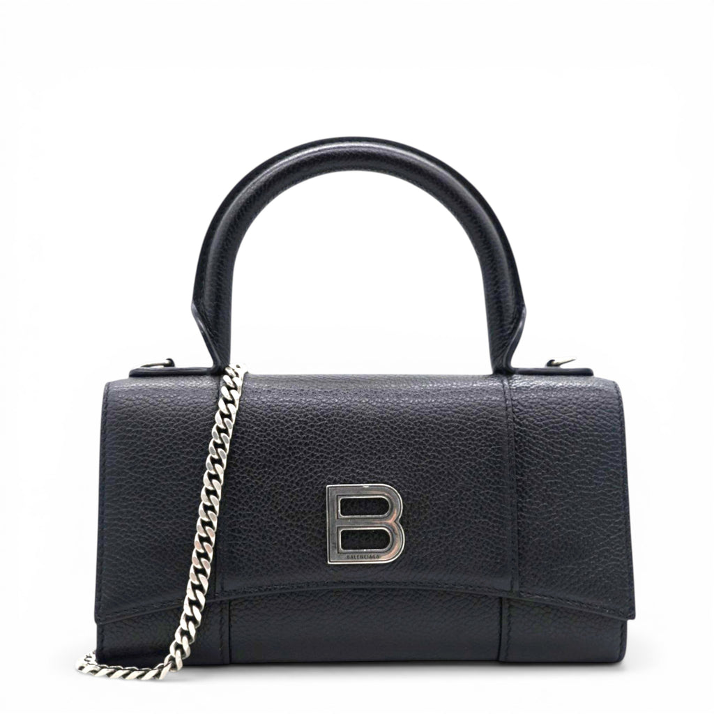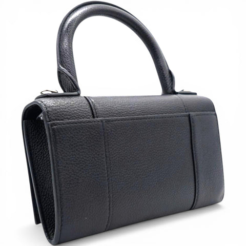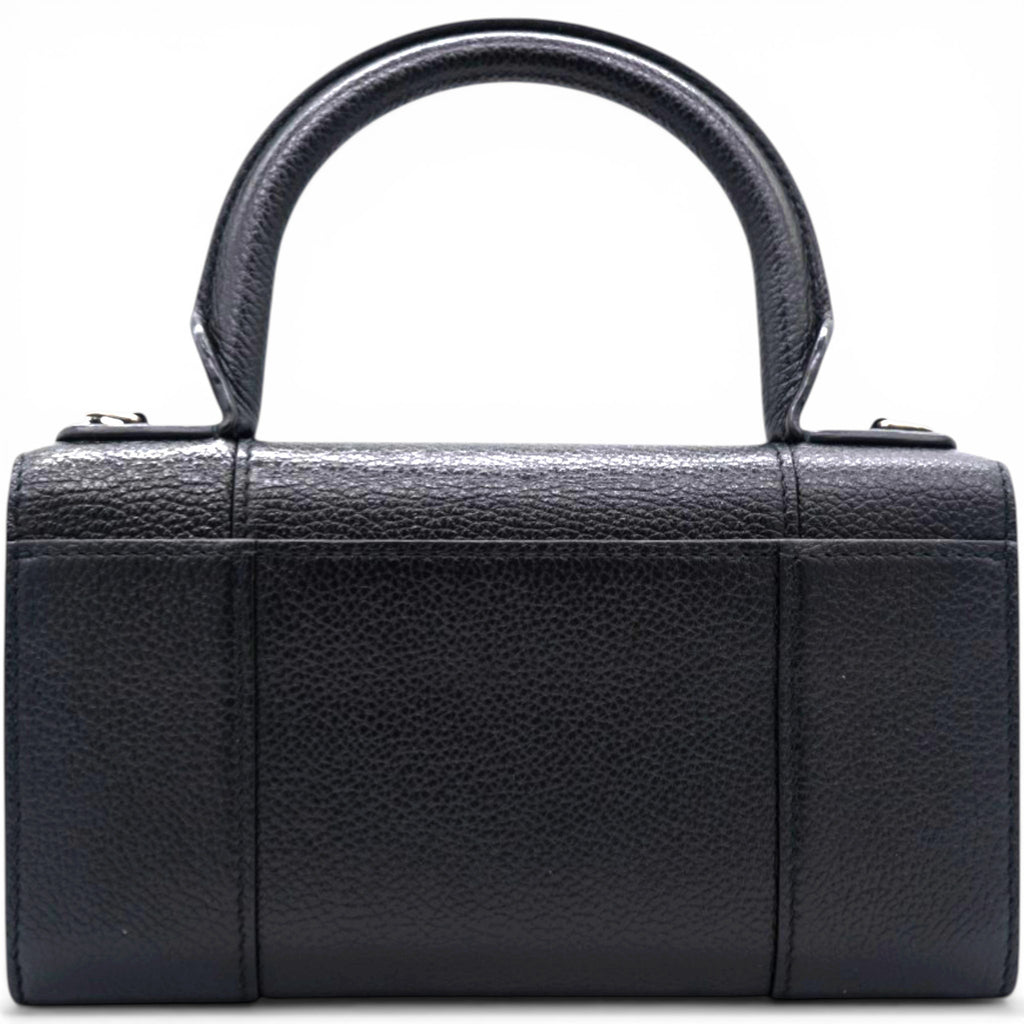 | Grained leather top handle bag in black. Tonal burnished edges throughout. Rolled carry handle at top. Detachable curb chain shoulder strap with lanyard clasp fastening. Logo hardware at face. Patch pocket at back face. Foldover flap with magnetic press-stud fastening. Logo stamp in silver-tone and patch pocket at interior. Buffed nappa lambskin lining. Engraved antiqued silver-tone hardware. |