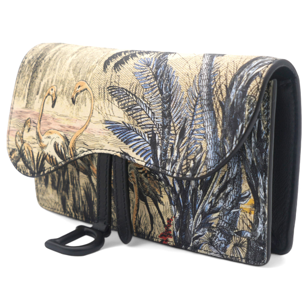 | Saddle cow leather belt bag with denim blue Toile de Jouy Tropicalia screen UV swan pattern. Black matte metal hardware, removable strap that can be worn around the waist or over the shoulder, black velvet lining. Saddle premium calfskin belt bag with denim blue Toile de Jouy Tropicalia screen print pattern. |