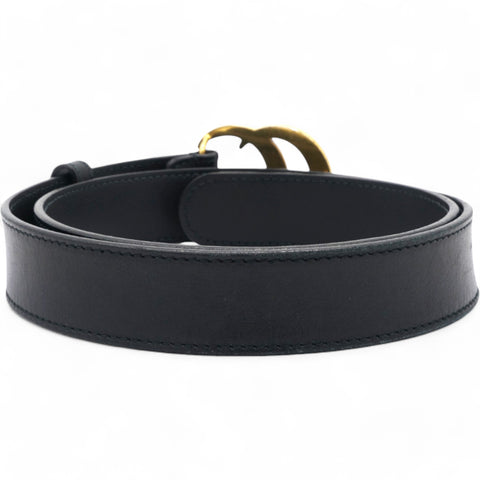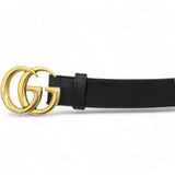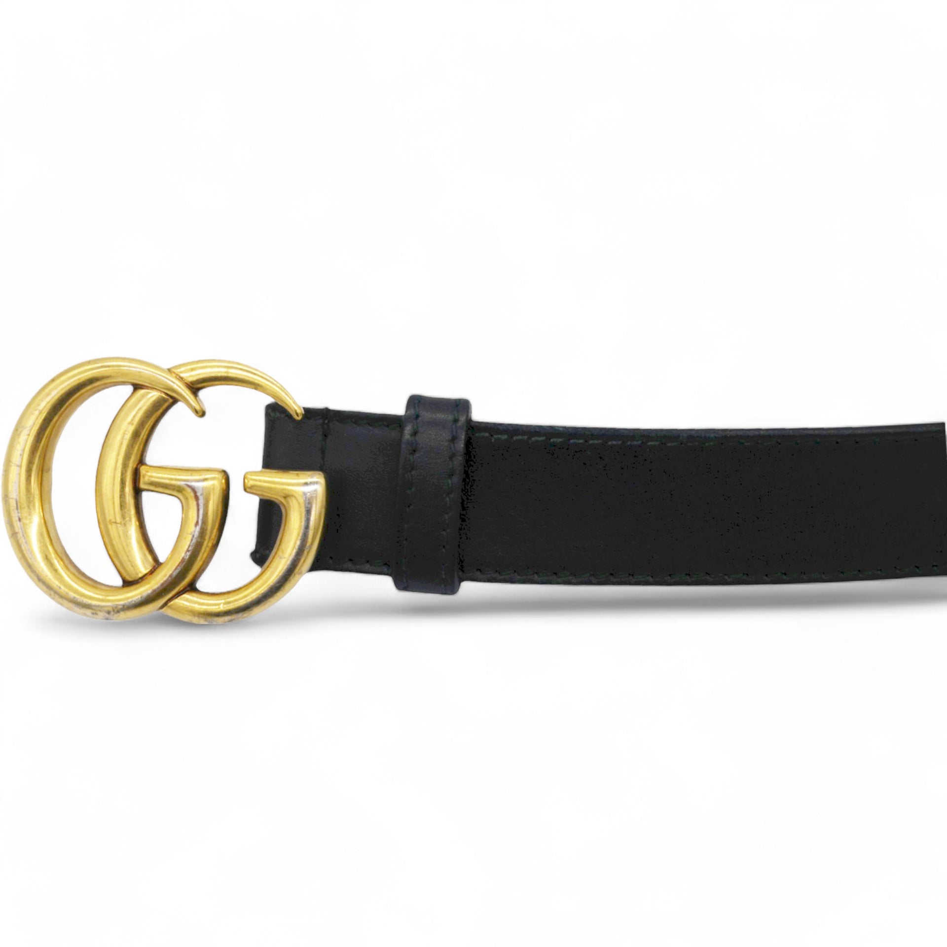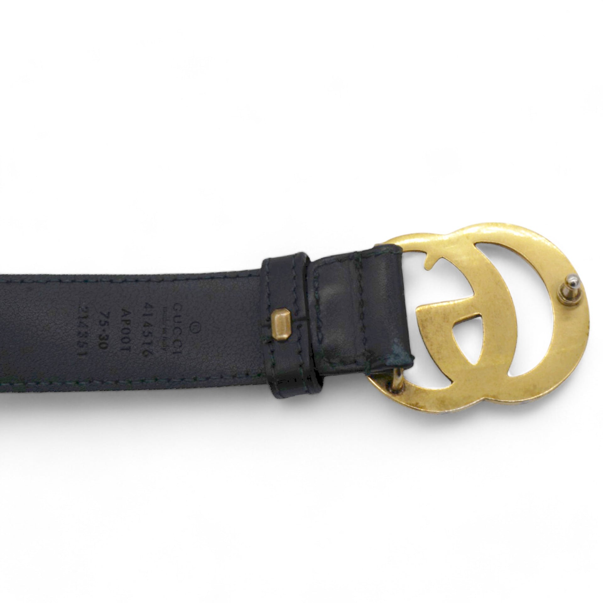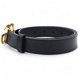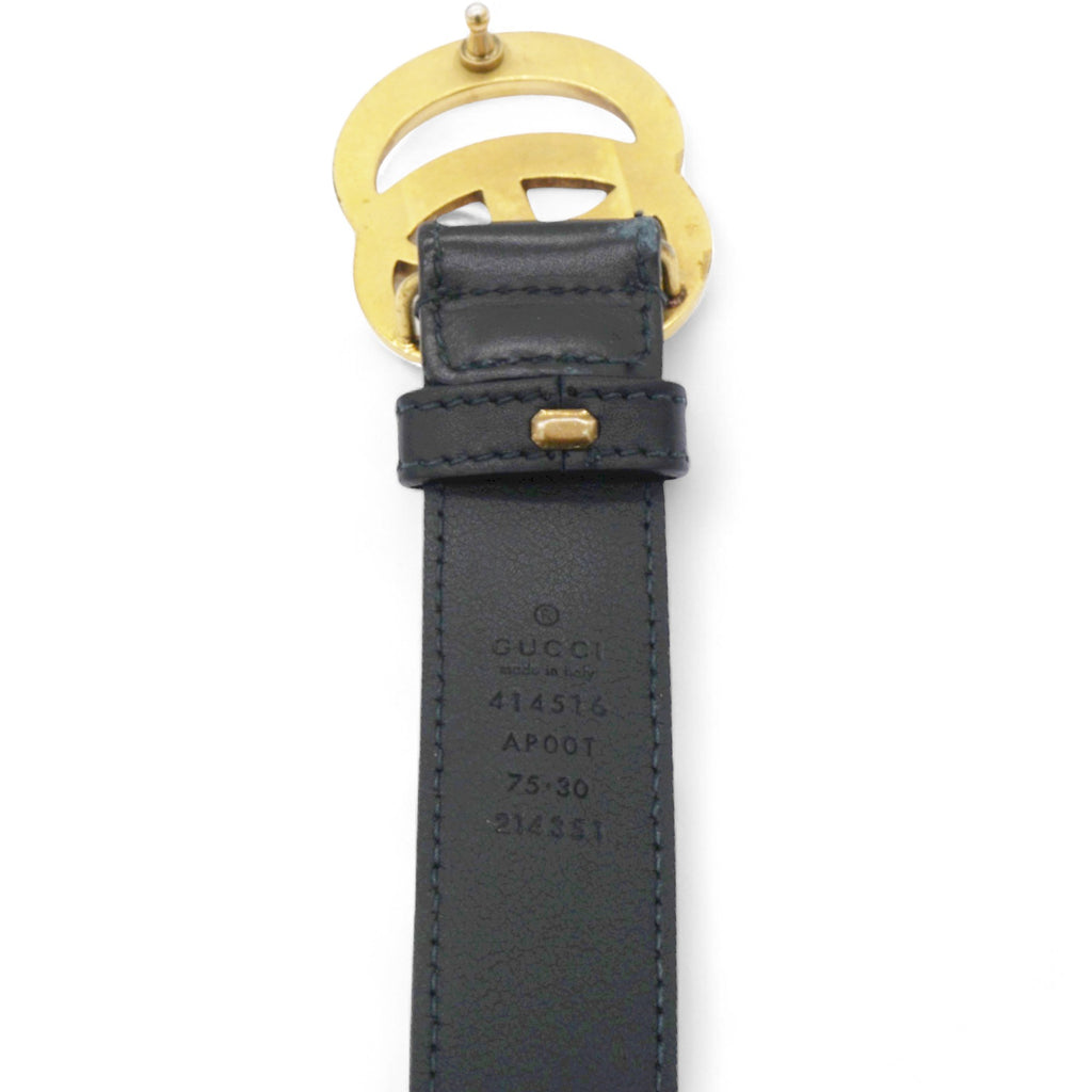 | This chic belt is crafted of calfskin leather in black and features an aged gold interlocking GG buckle. This is a stylish belt, ideal for everyday use, from Gucci! |