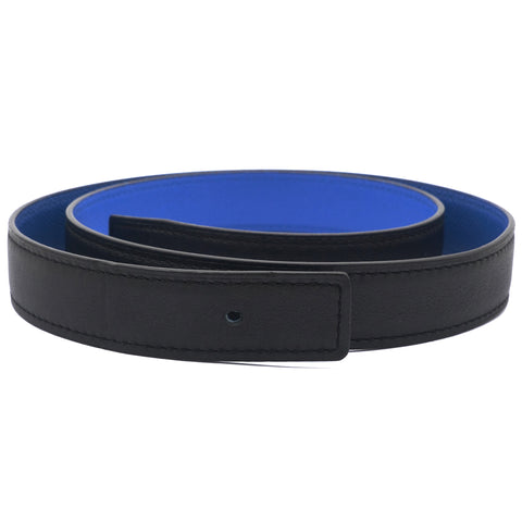 | This stylish belt is crafted of reversible swift calfskin leather in black and blue epsom leather on the other side and features a gold plated horsebit shaped buckle. |