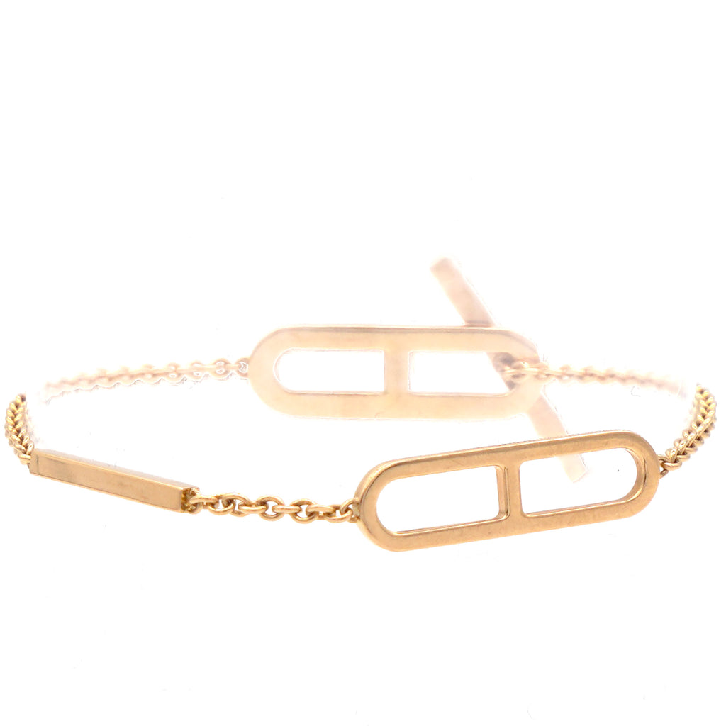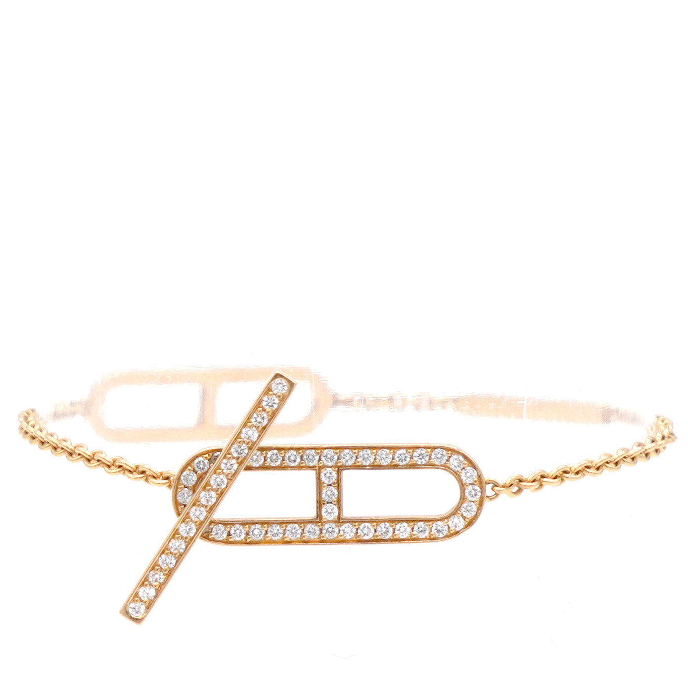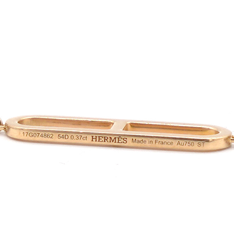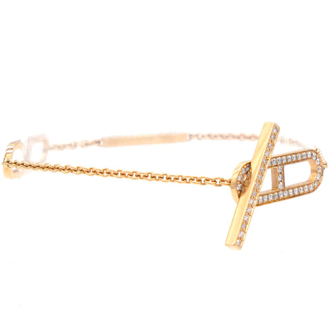 | The bracelet is crafted of 18 karat rose gold and features a delicate gold chain and the iconic Chain D'Ancre motif toggle bar clasp set with sparkling diamonds, approximately .37 total carat weight. This is a stunning bracelet with the elegant style of Hermes! |