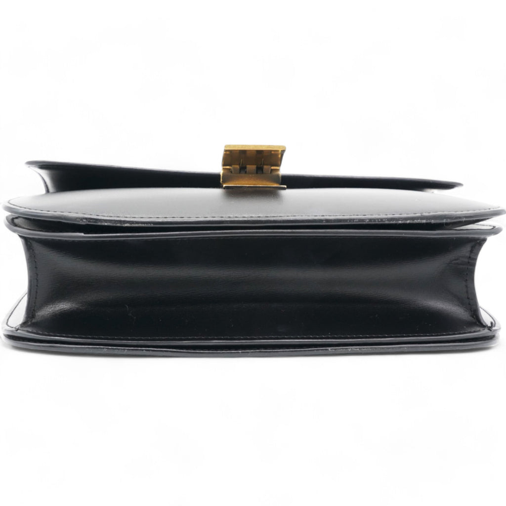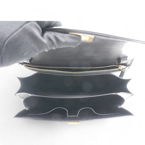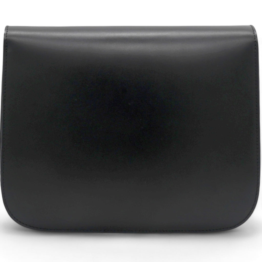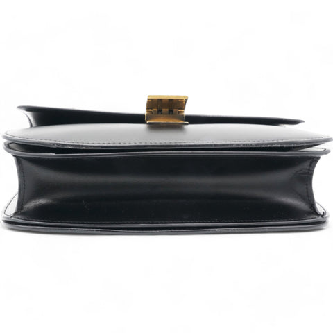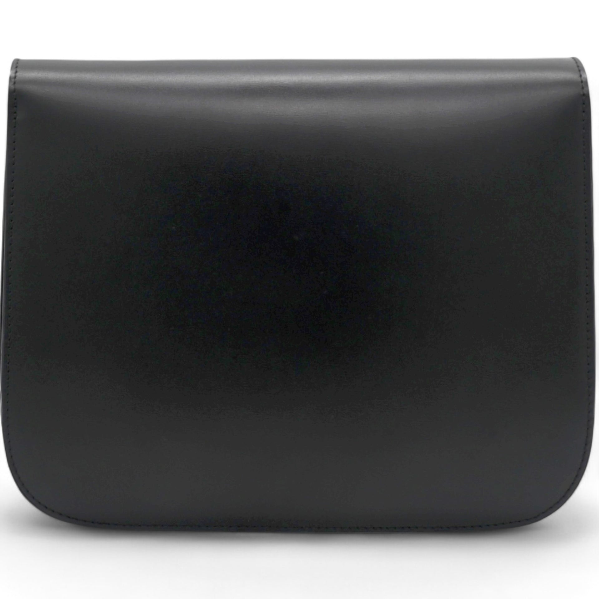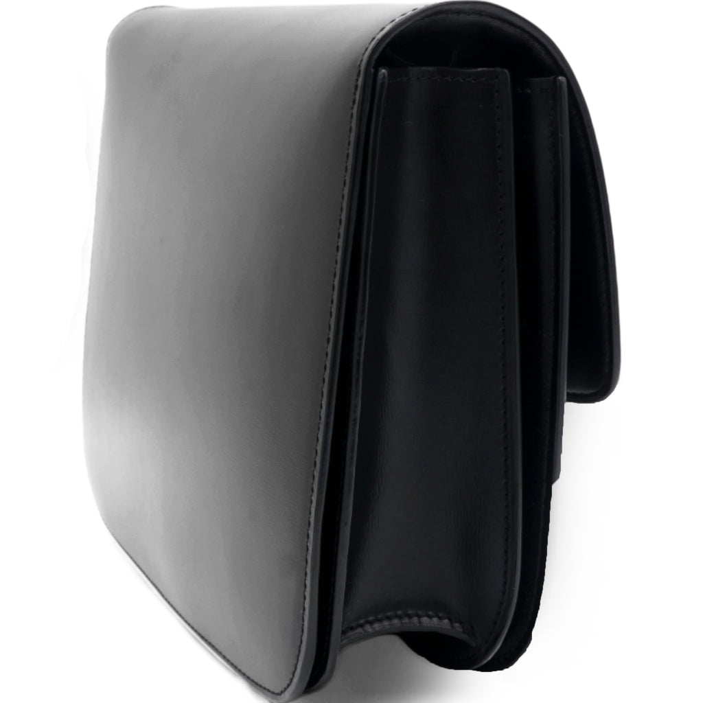 | This super chic shoulder bag is crafted in fine smooth box leather in Black. The handbag features a long leather shoulder strap and a frontal gold press lock that opens the frontal flap to a matching partitioned matte black leather interior with zipper and patch pockets. |