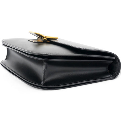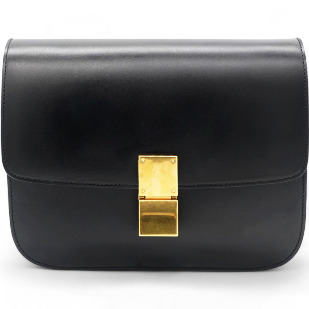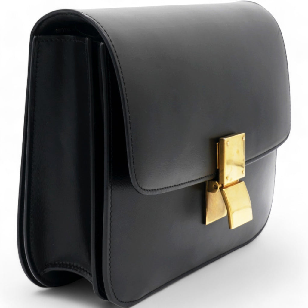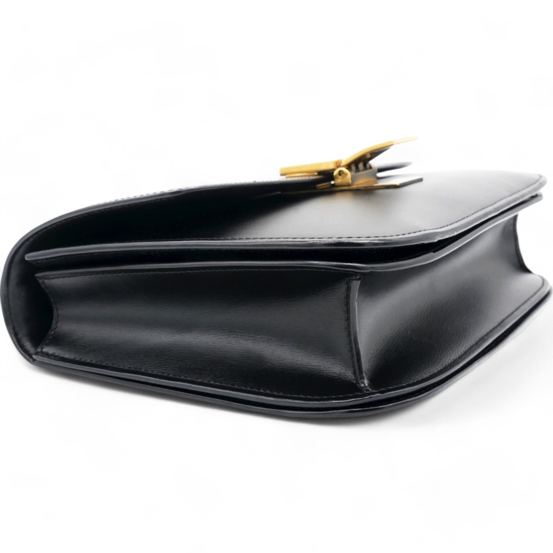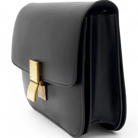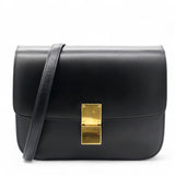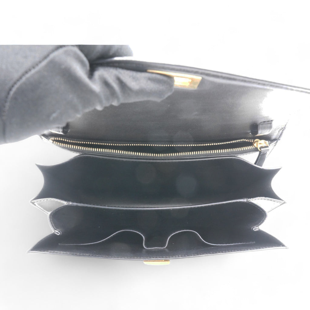 | This super chic shoulder bag is crafted in fine smooth box leather in Black. The handbag features a long leather shoulder strap and a frontal gold press lock that opens the frontal flap to a matching partitioned matte black leather interior with zipper and patch pockets. |