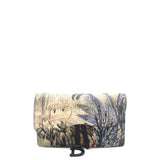 | Saddle cow leather belt bag with denim blue Toile de Jouy Tropicalia screen UV swan pattern. Black matte metal hardware, removable strap that can be worn around the waist or over the shoulder, black velvet lining. Saddle premium calfskin belt bag with denim blue Toile de Jouy Tropicalia screen print pattern. |