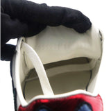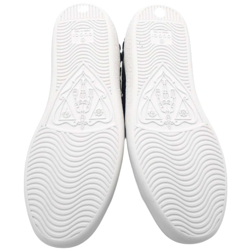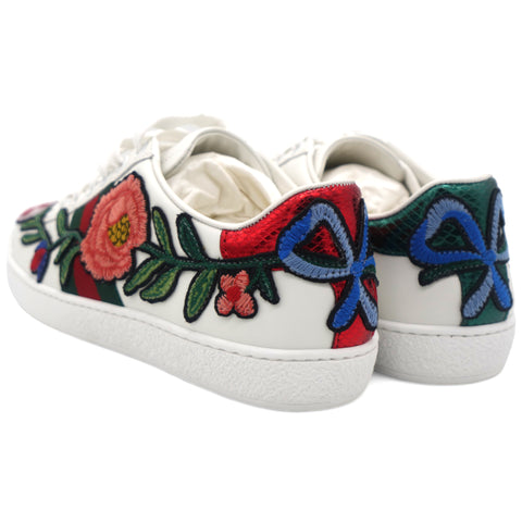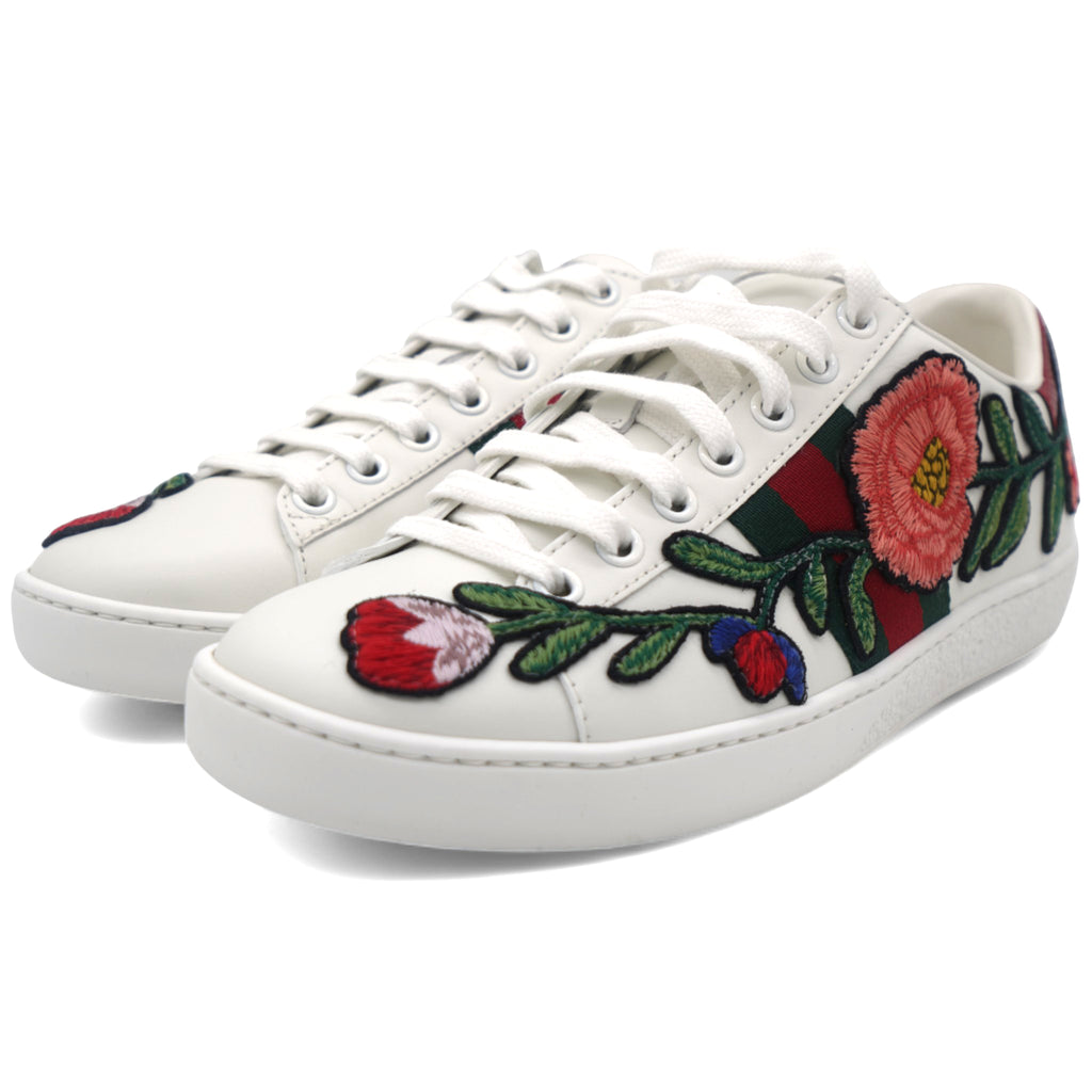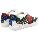 | These stylish sneakers are crafted of white leather with a stunning floral pattern. They feature white laces, red and green snakeskin-embossed panels and white rubber soles. |