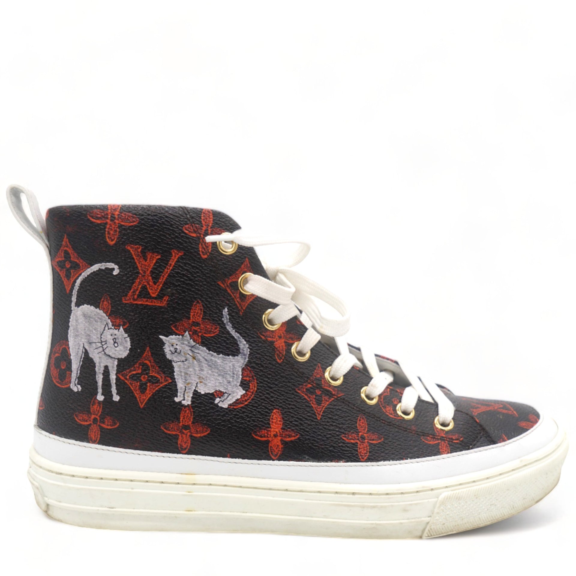 These luxurious high-top sneakers are crafted of monogram coated canvas with an overlaid print of cats. The sneakers feature white rubber soles, white shoelaces, and a gold zipper at the shaft.