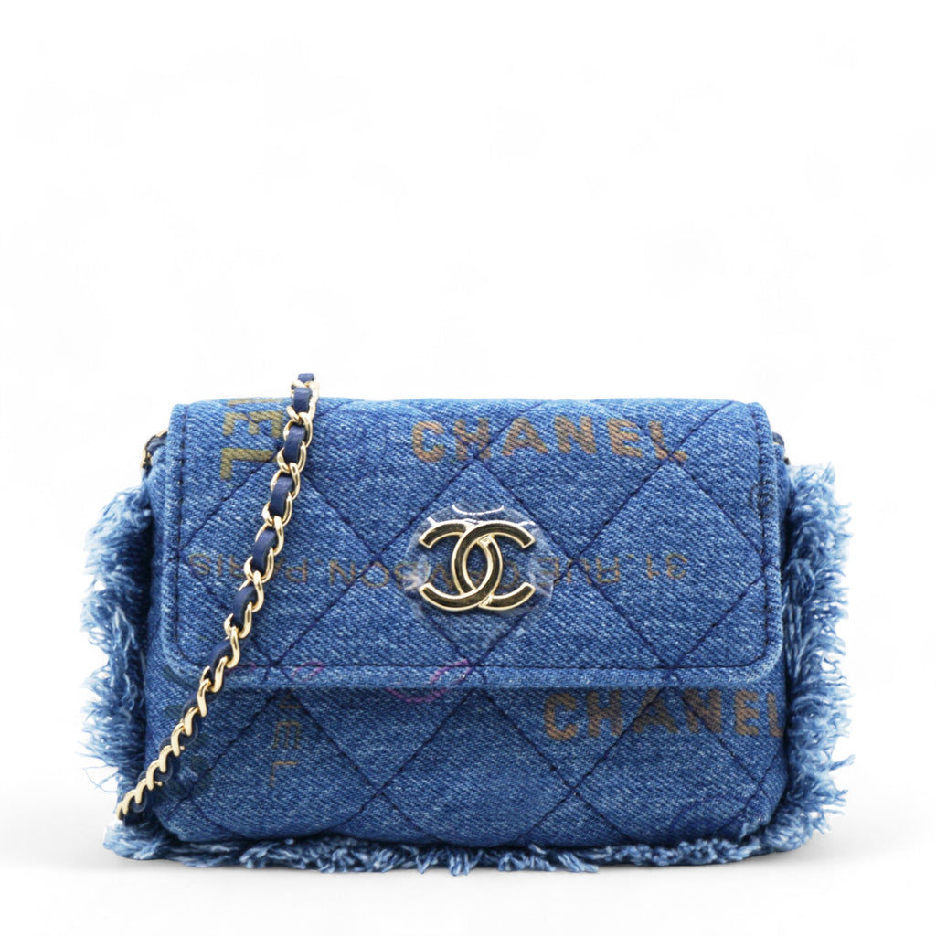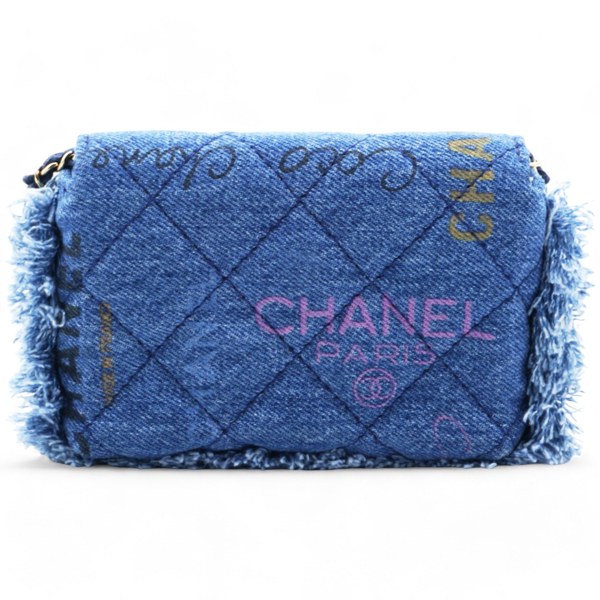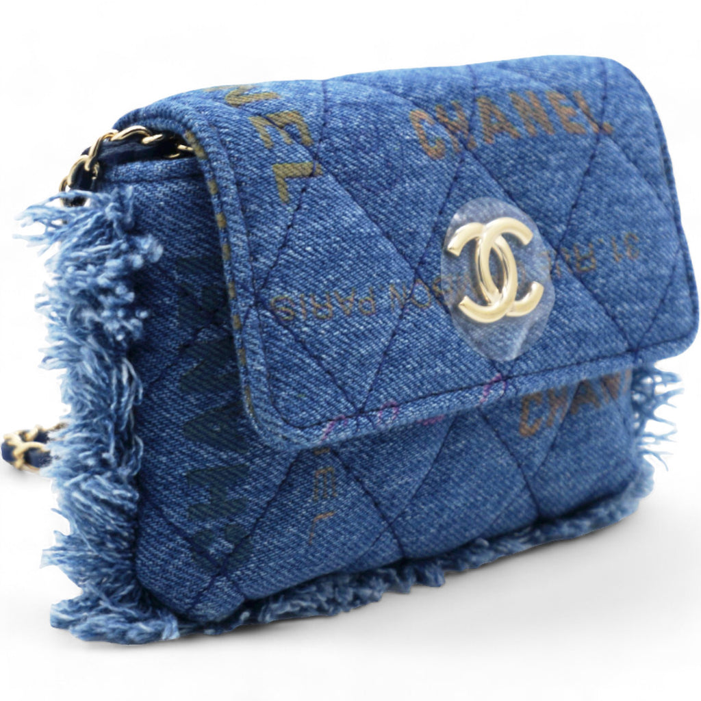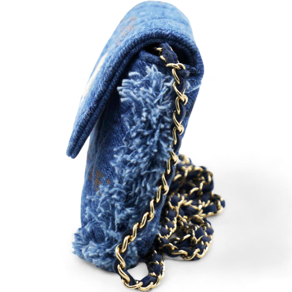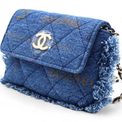 | The chic mini crossbody bag is crafted in soft quilted blue denim. The bag features a gold chain-link leather threaded shoulder strap and a facing classic gold CC logo. This opens the flap to a matching denim interior. |