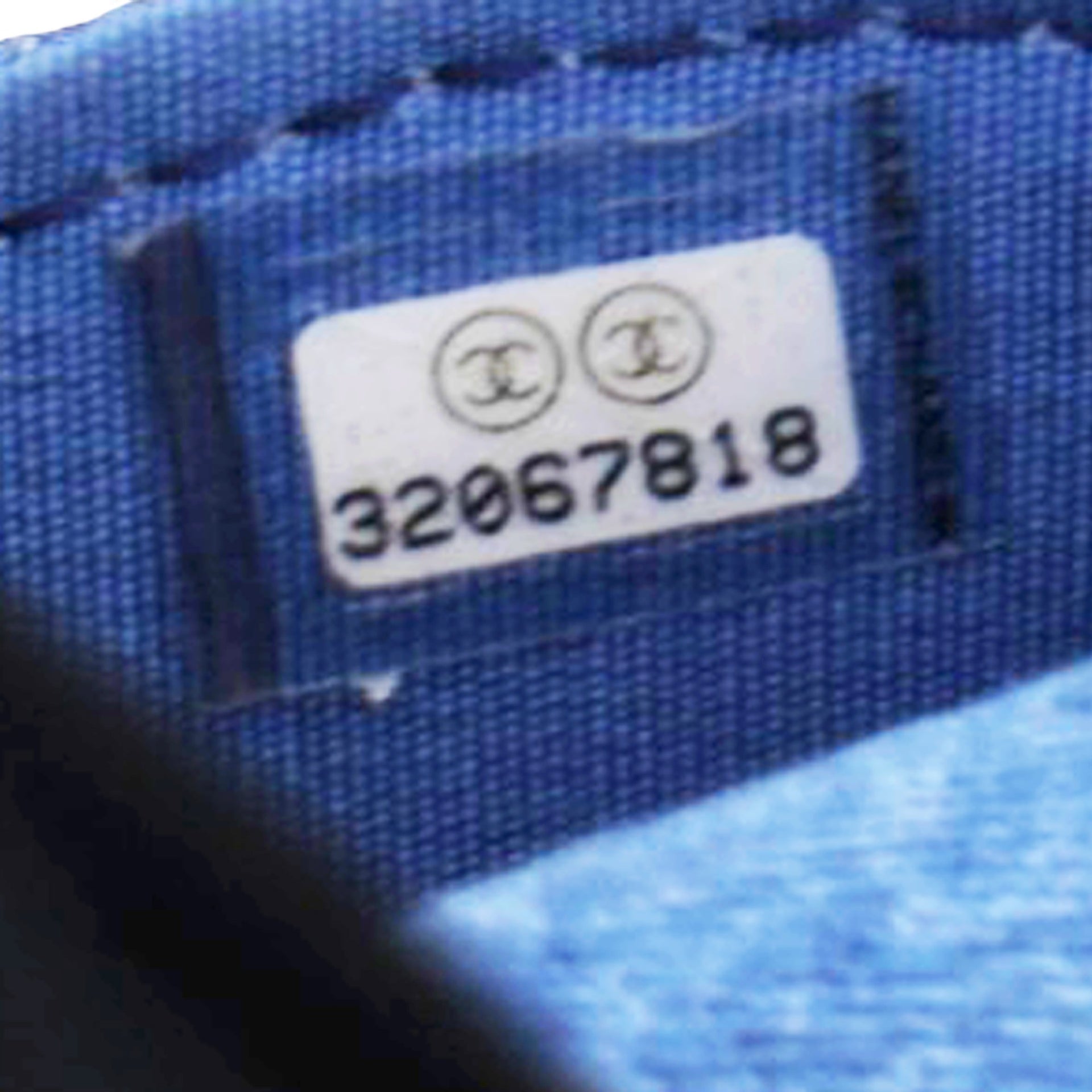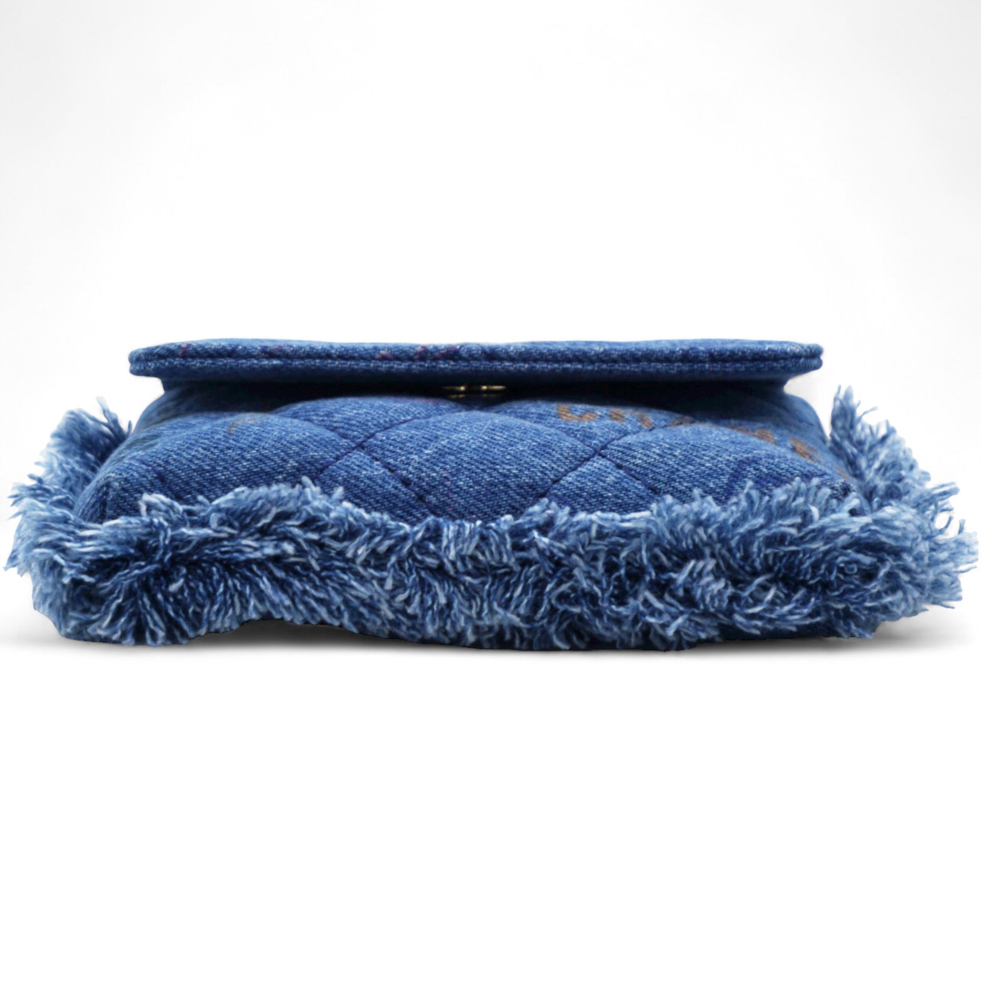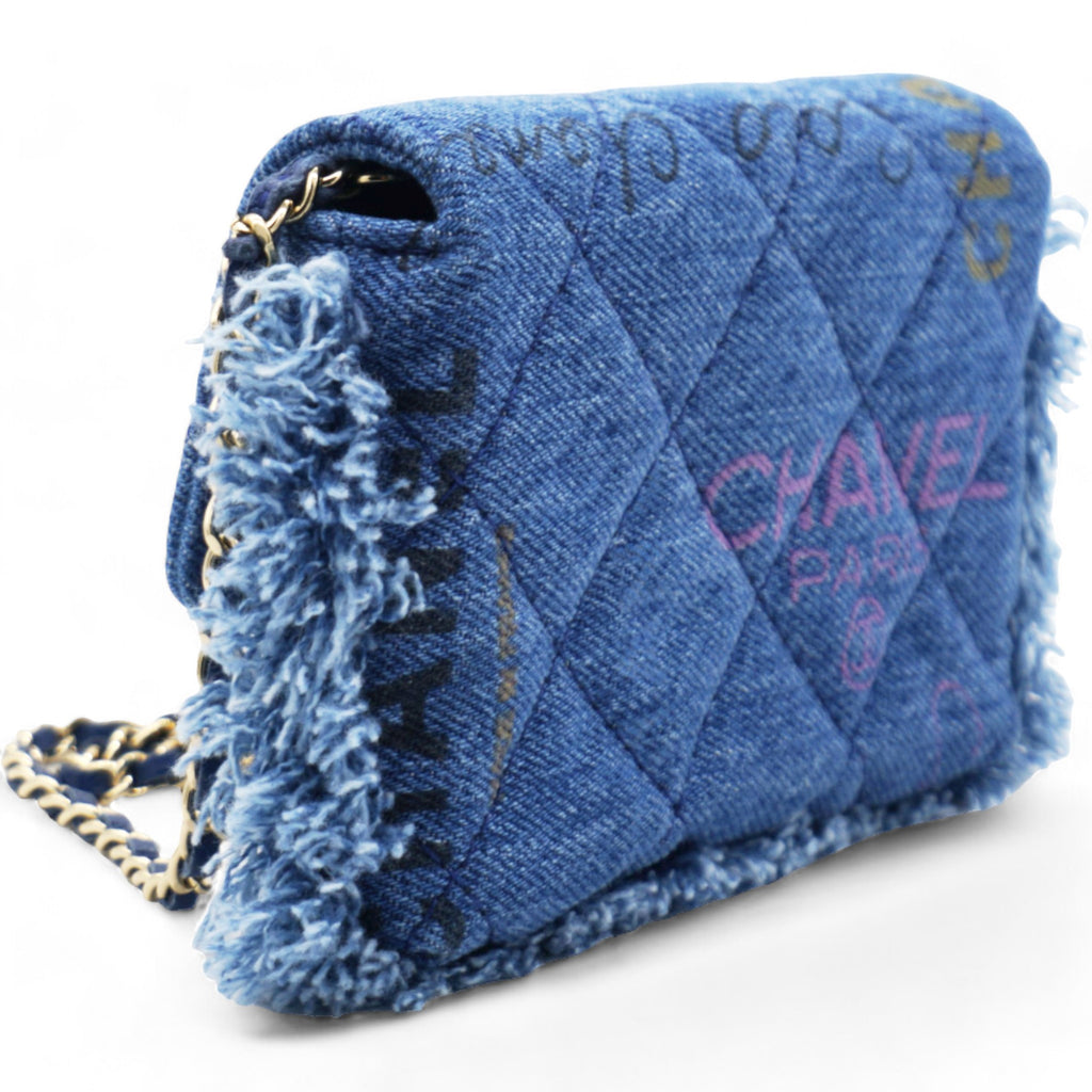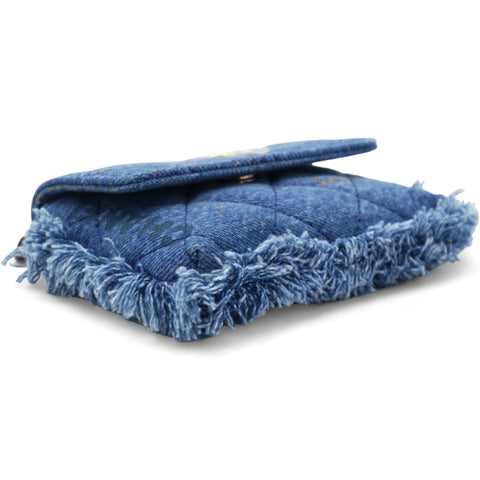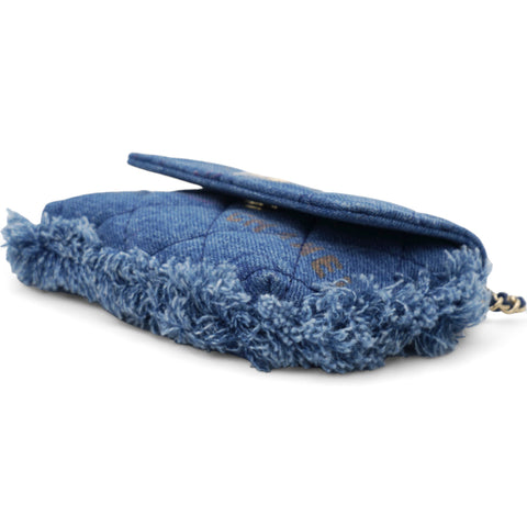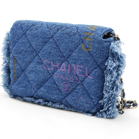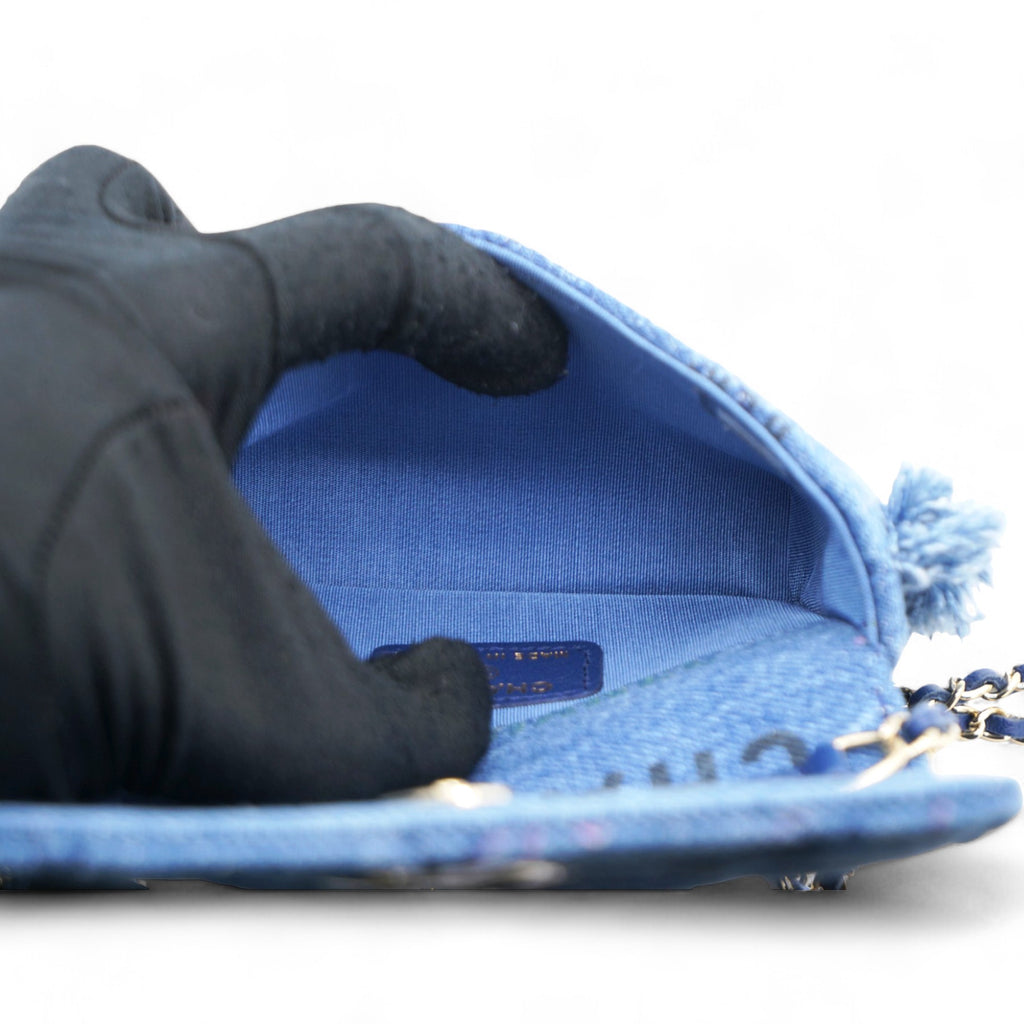| The chic mini crossbody bag is crafted in soft quilted blue denim. The bag features a gold chain-link leather threaded shoulder strap and a facing classic gold CC logo. This opens the flap to a matching denim interior. |