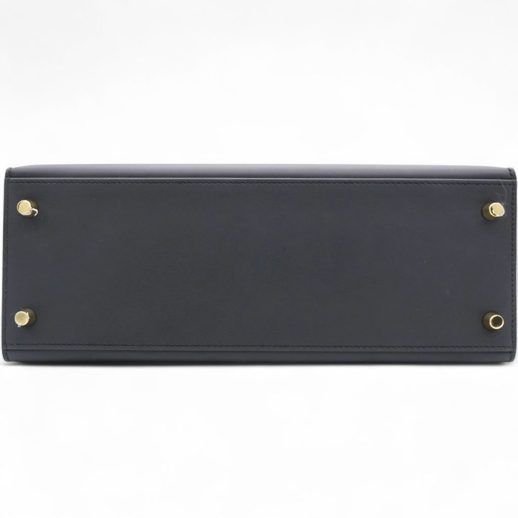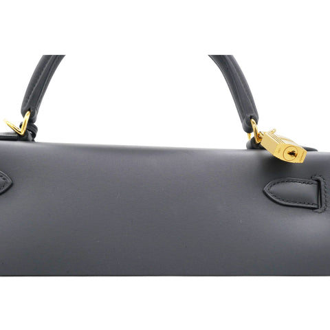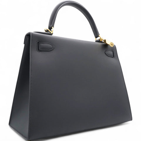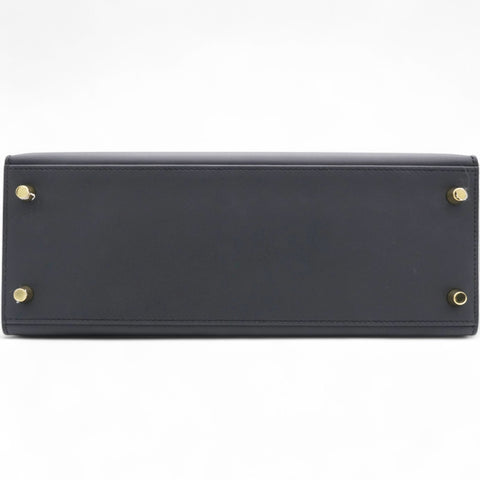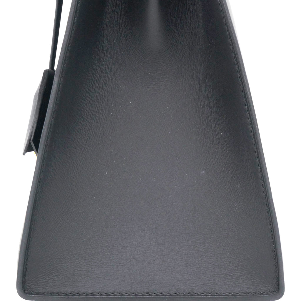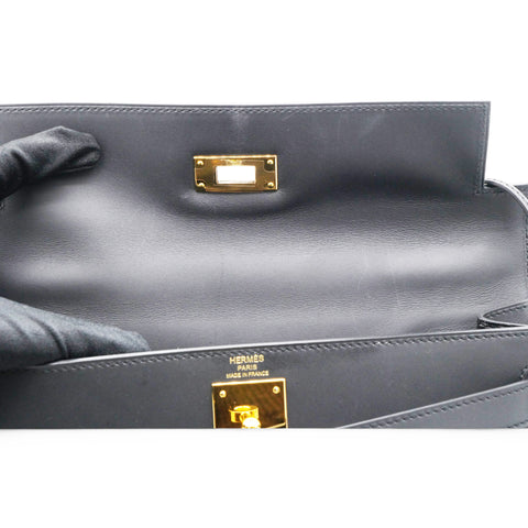 | This Hermes classic handbag is crafted of stamped Epsom calfskin leather in black. It features a single leather top handle, an optional leather shoulder strap, and gold plated hardware. The traditional Kelly turn-lock secures the small flap with a padlock and a hanging leather key clochette accessorizes this handbag. The interior features two patch pockets as well as a zipped wide pocket, both in black chèvre goatskin leather. |